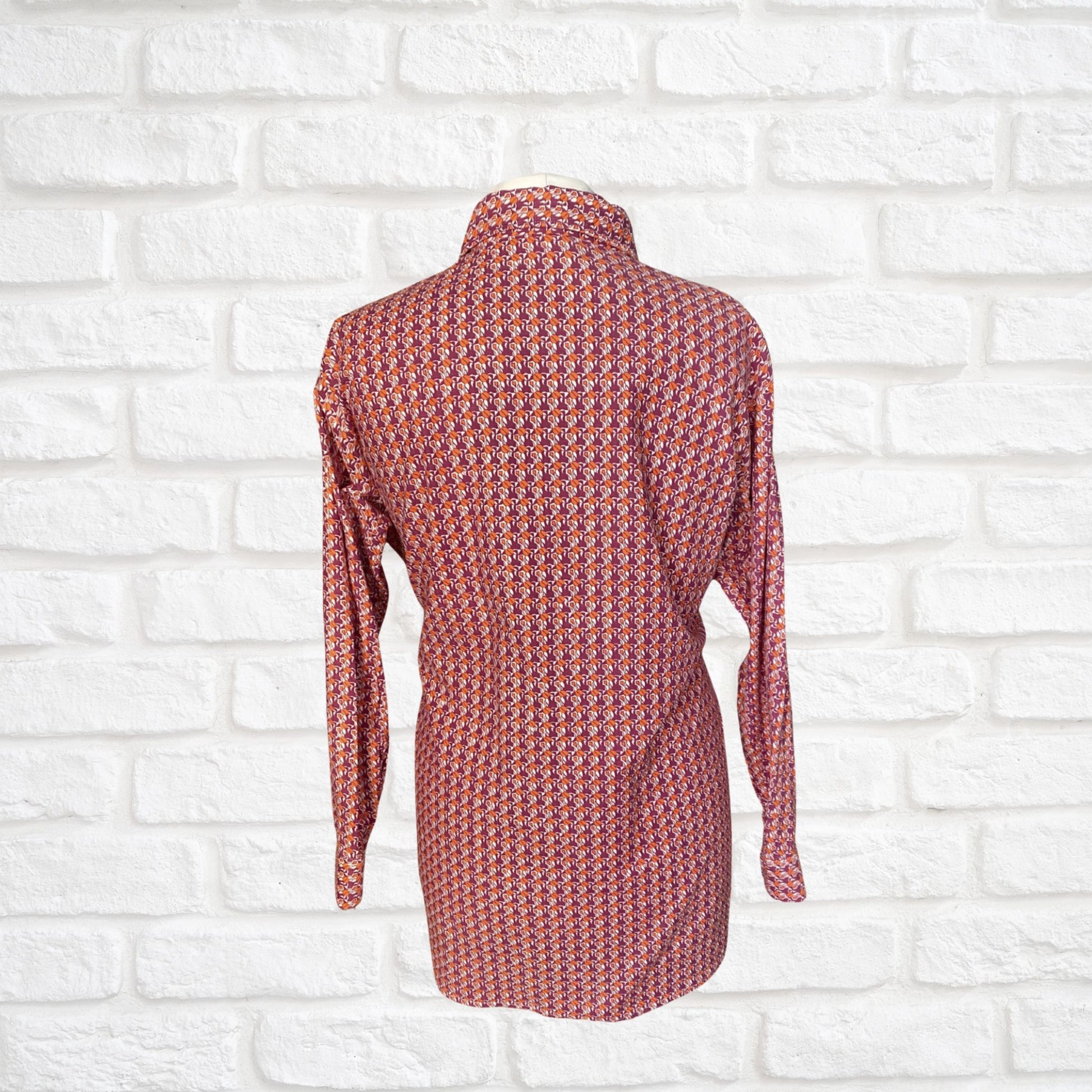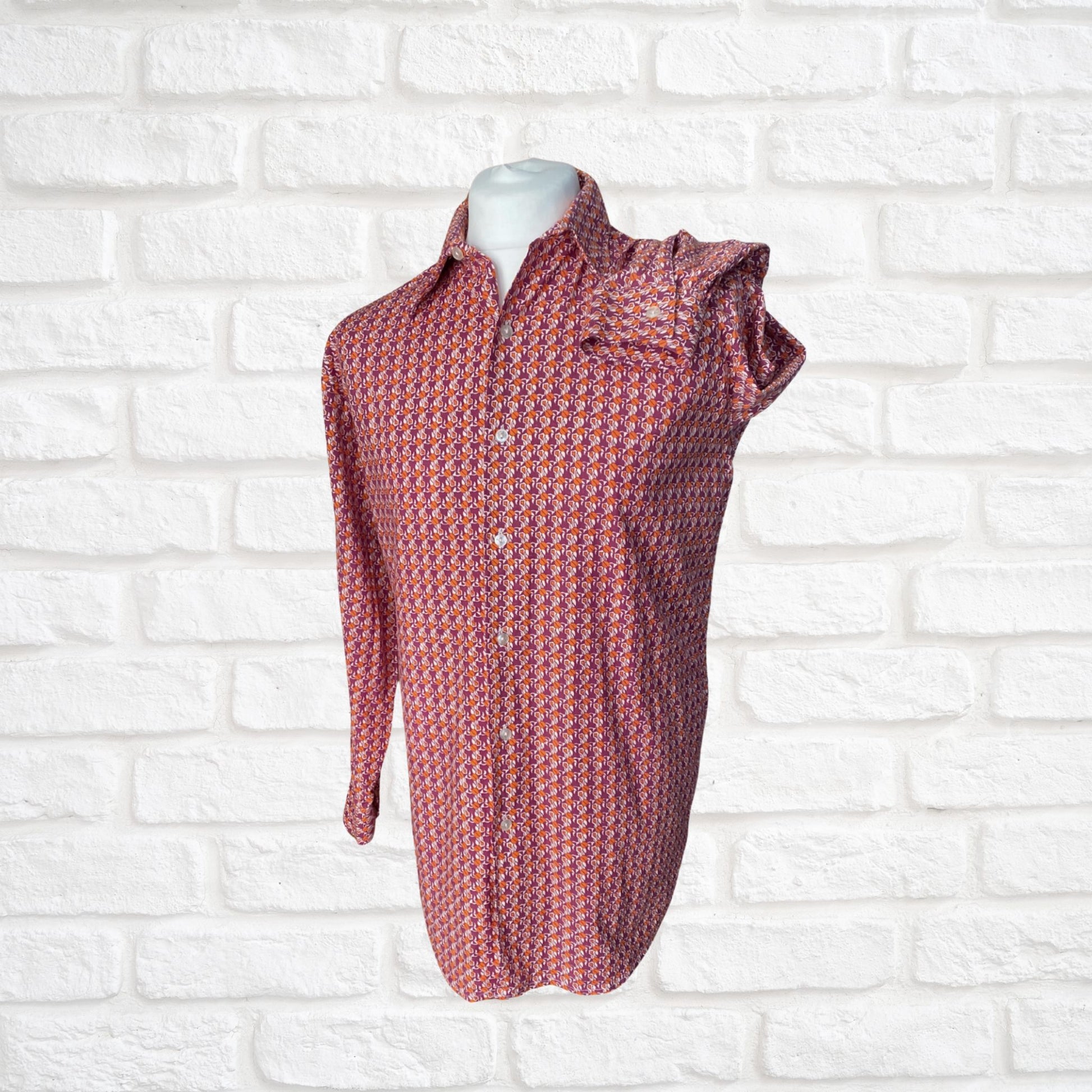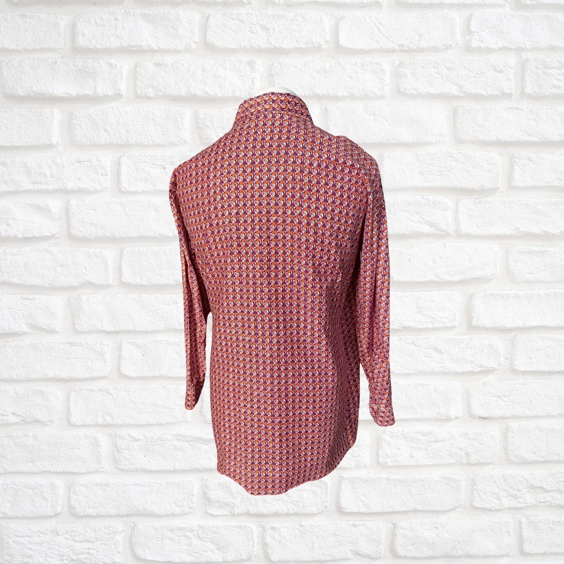 1970s Geometric Print Long Sleeved Dagger Collar Cotton Vintage Shirt. Approx UK size XL to XXL (men) 18-20 ( women)
