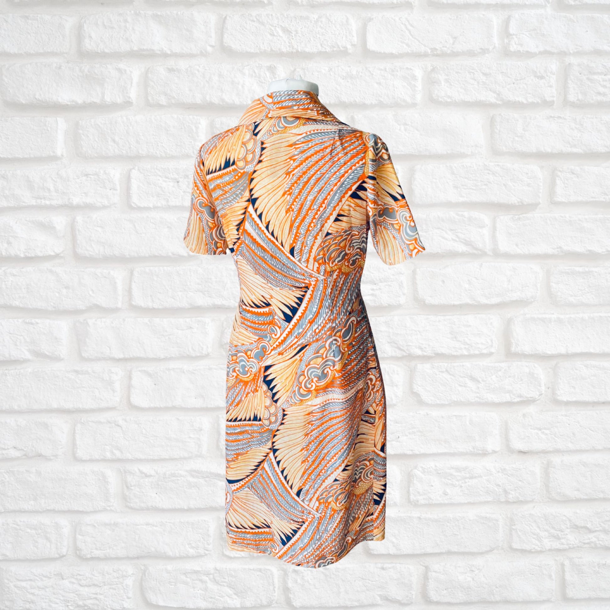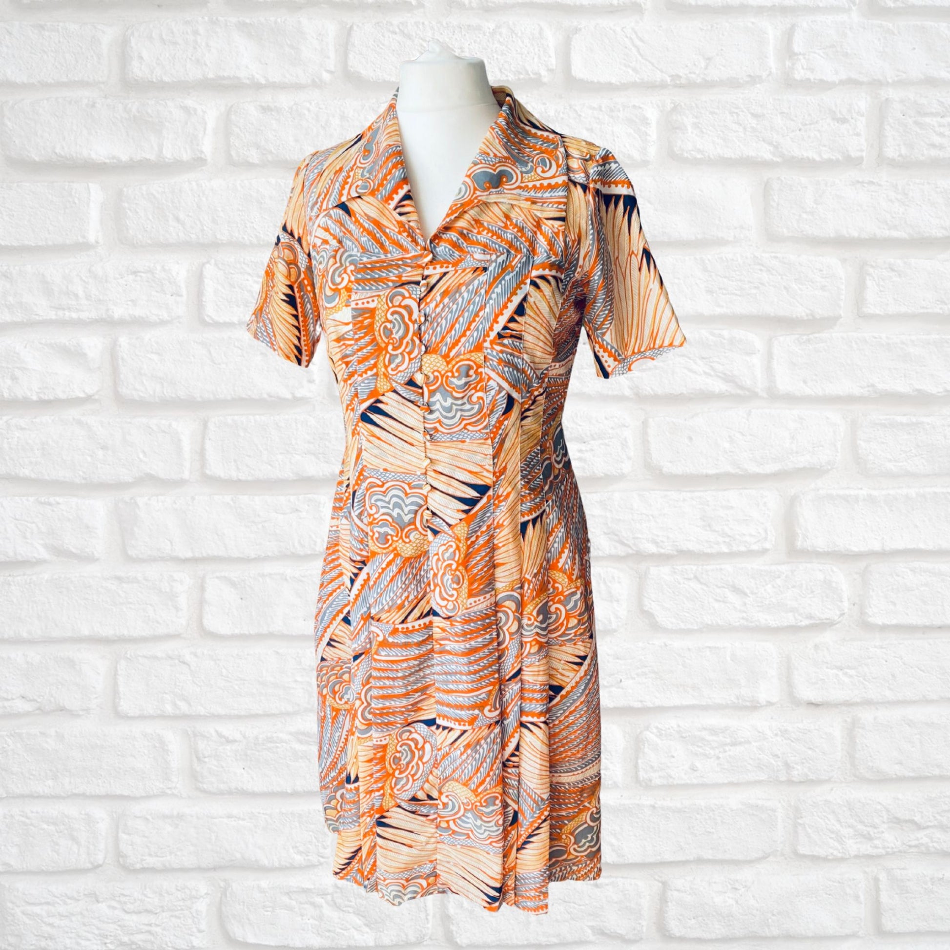This captivating 1970s orange, grey, and white psychedelic abstract print short-sleeved vintage midi dress is full of charming retro detailing that will ensure you stand out from the crowd. Whether you are attending a garden party, a vintage-inspired wedding, or simply want to inject some colour into your everyday life, this dress is the perfect choice for adding a touch of retro flair to any occasion.