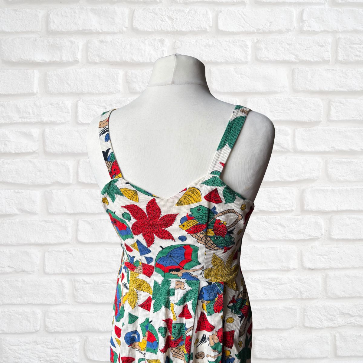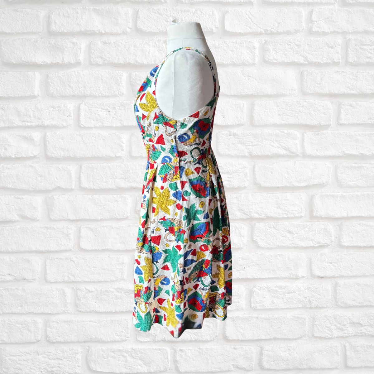 Such a charming and unique 50s cotton summer dress. The beach style fabric is stunning and works perfectly with the classic 50s design of shoulder straps, a cross-over gathered bodice and flared front pleated skirt with handy pockets.