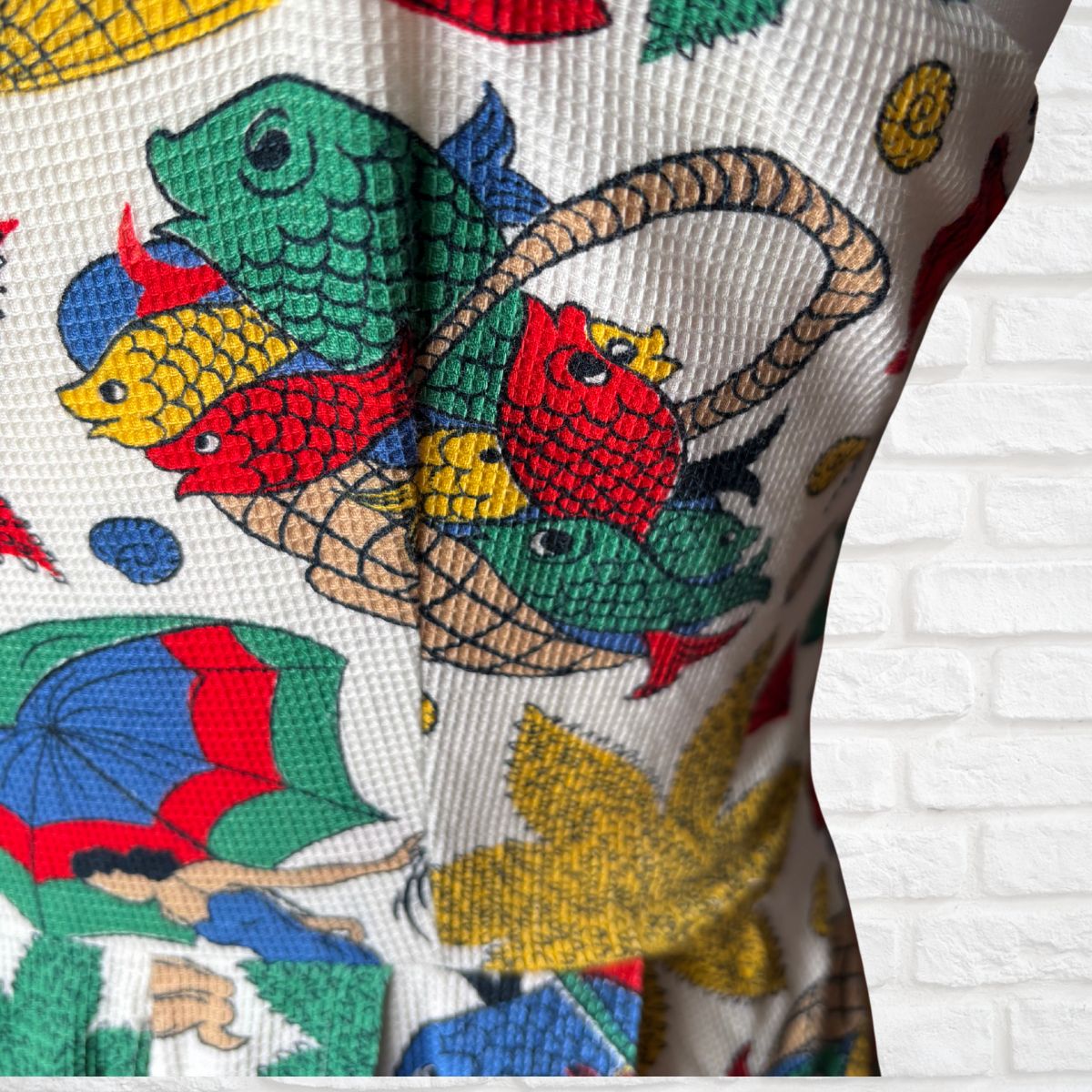 - Gorgeous seaside print featuring fish, shells, starfish, and a sunbathing lady and parasol