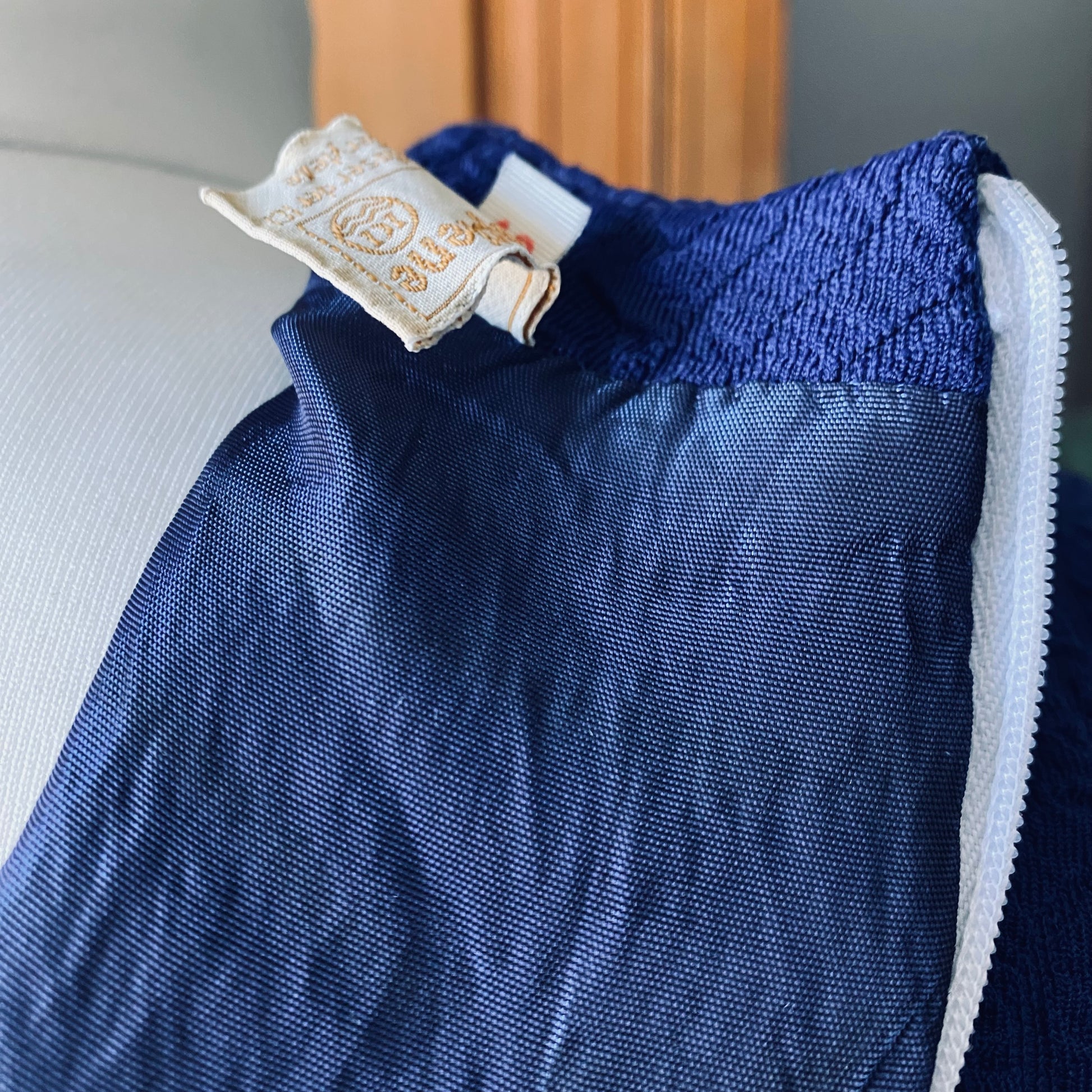 Such a classic mod style navy blue vintage shift dress with its textured look and white geometric stripes. Super sharp and stylish .