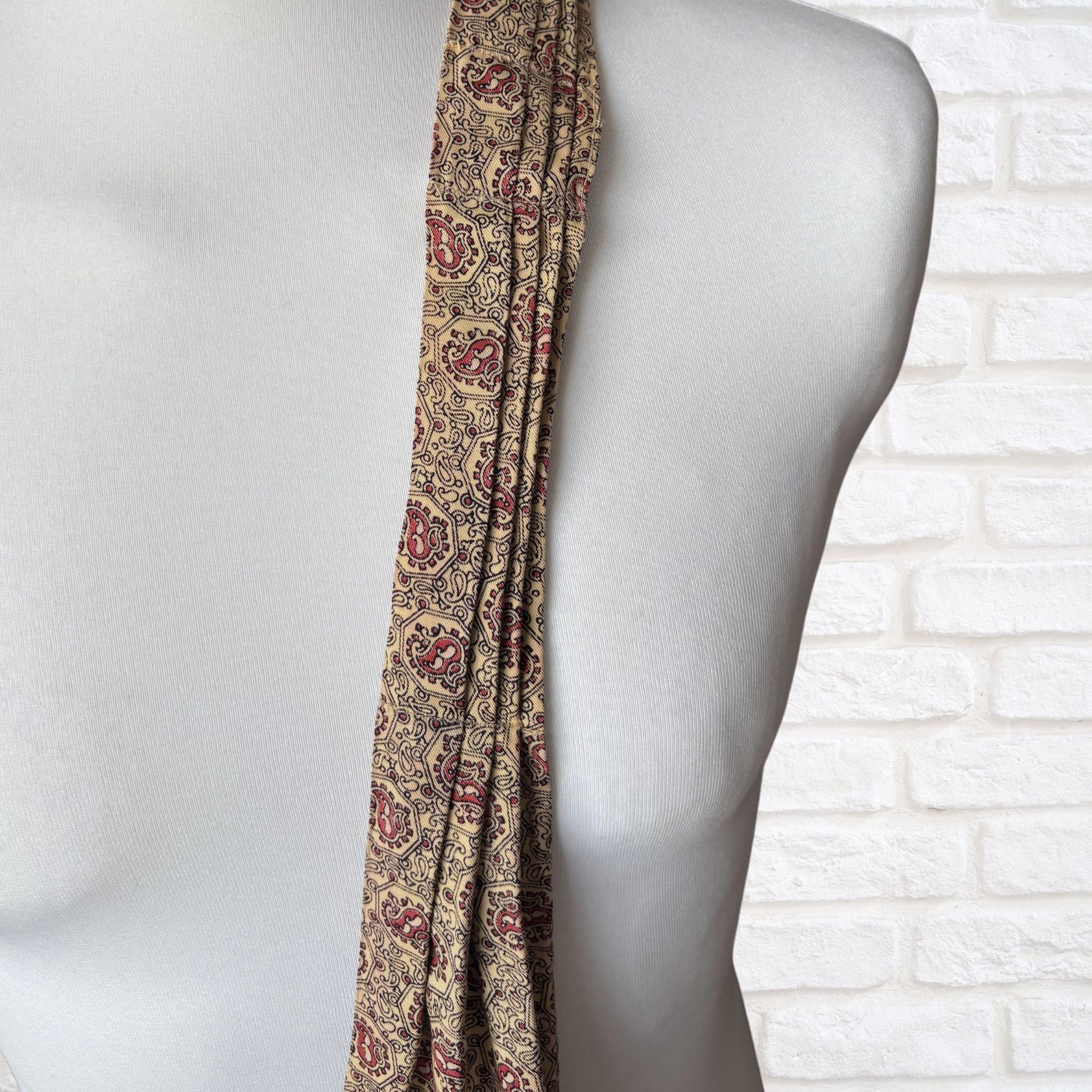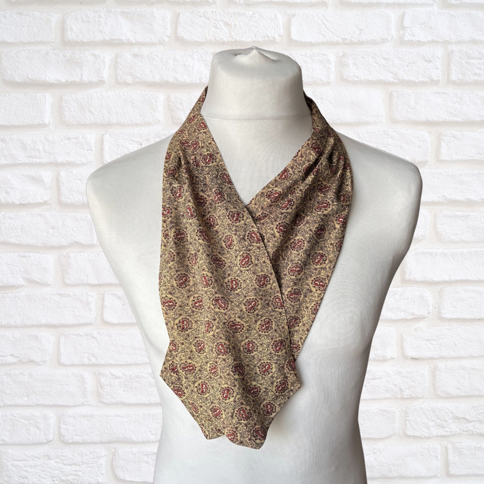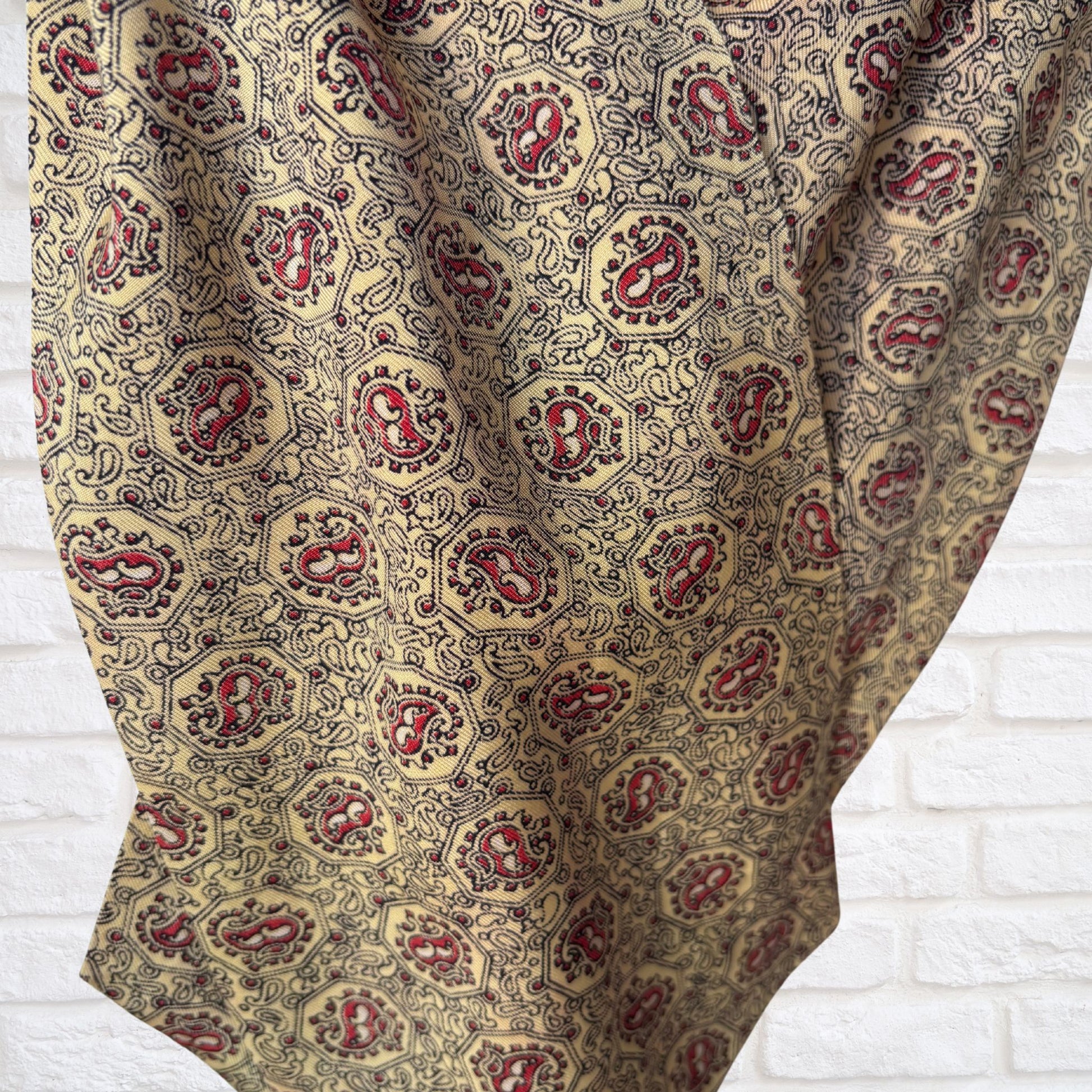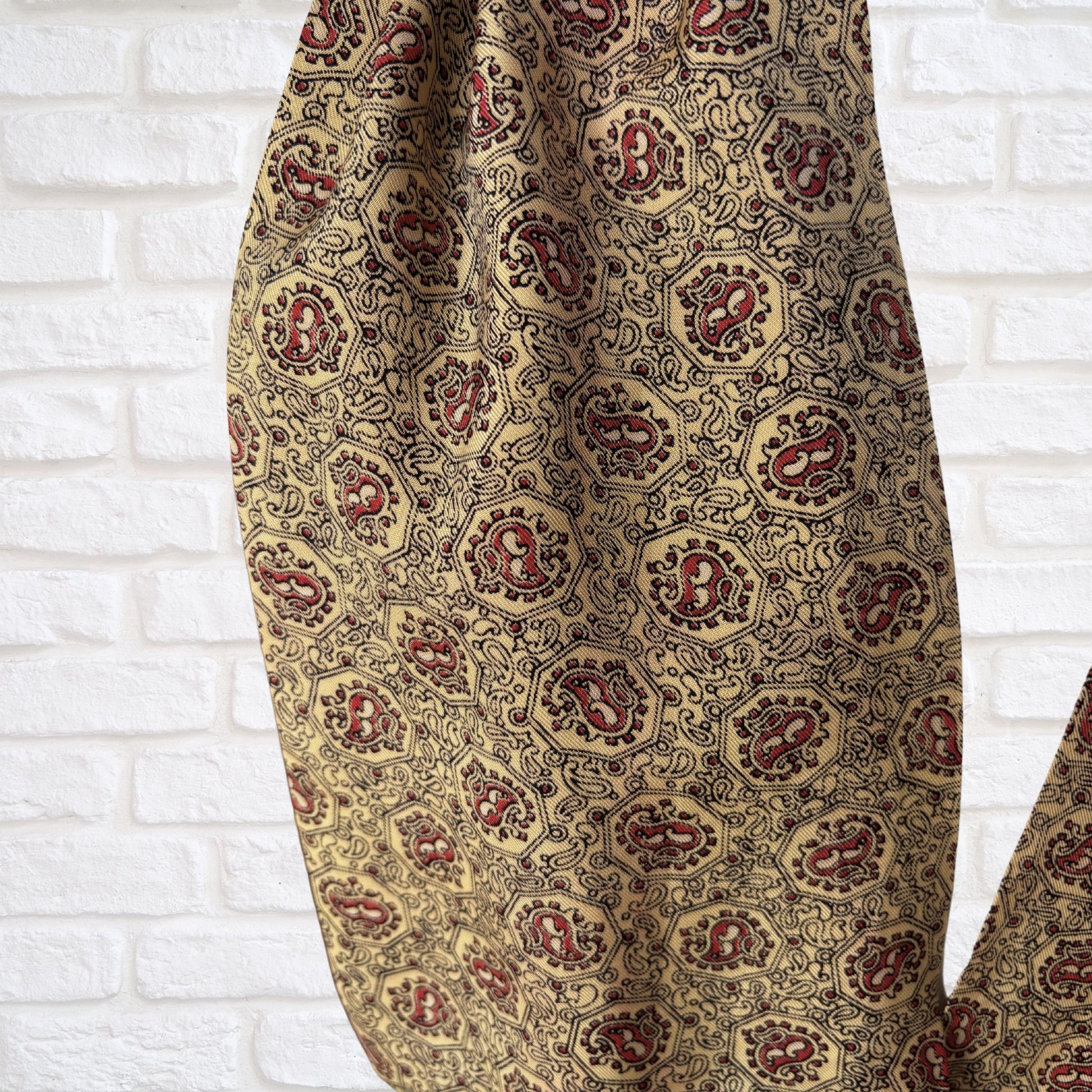 This stylish yellow, red and black geometric paisley print 60s rayon vintage cravat is the perfect accessory to elevate any outfit, making you stand out with a touch of timeless style. Whether you're attending a wedding or a formal gathering or just want to look smart, this cravat is sure to suit the occasion.