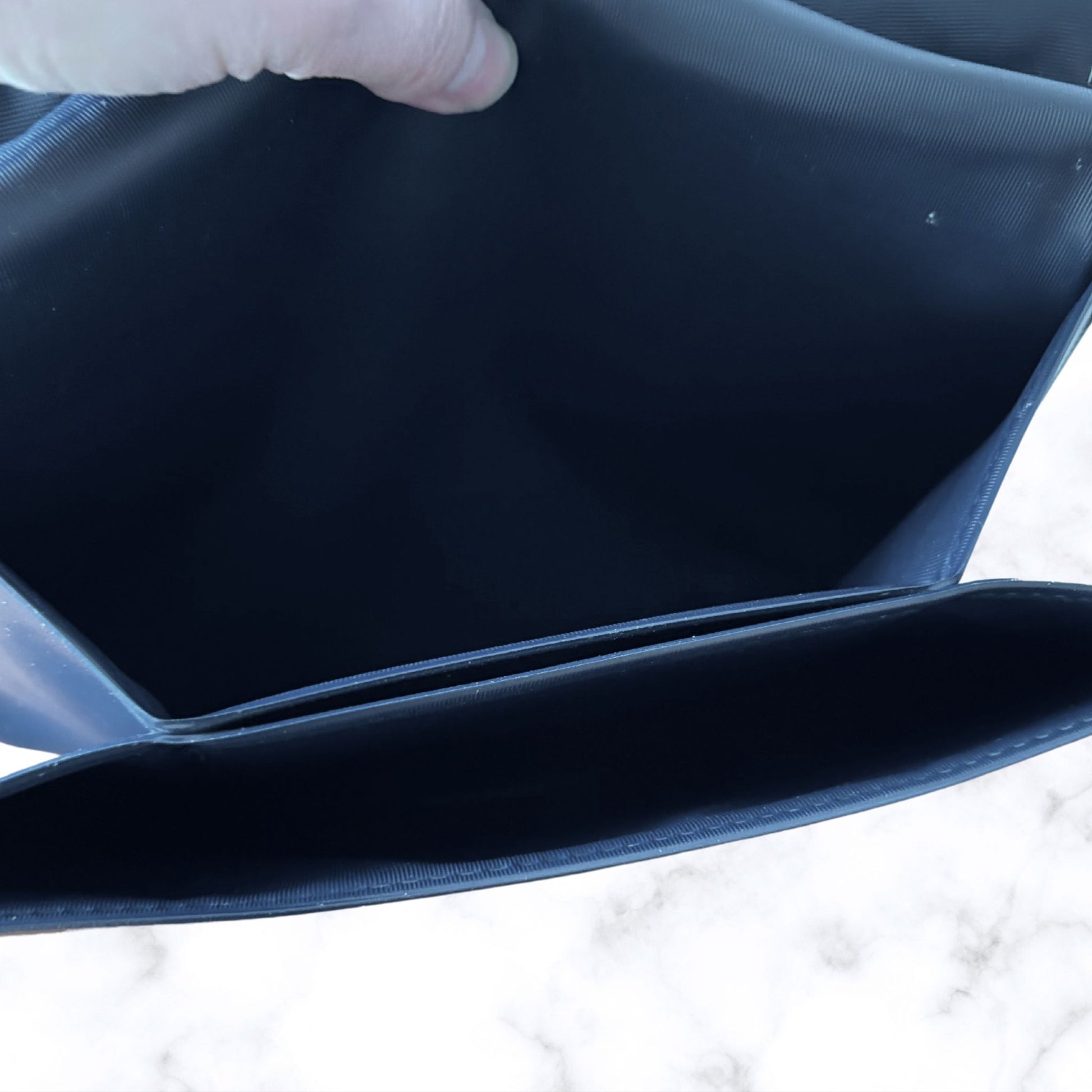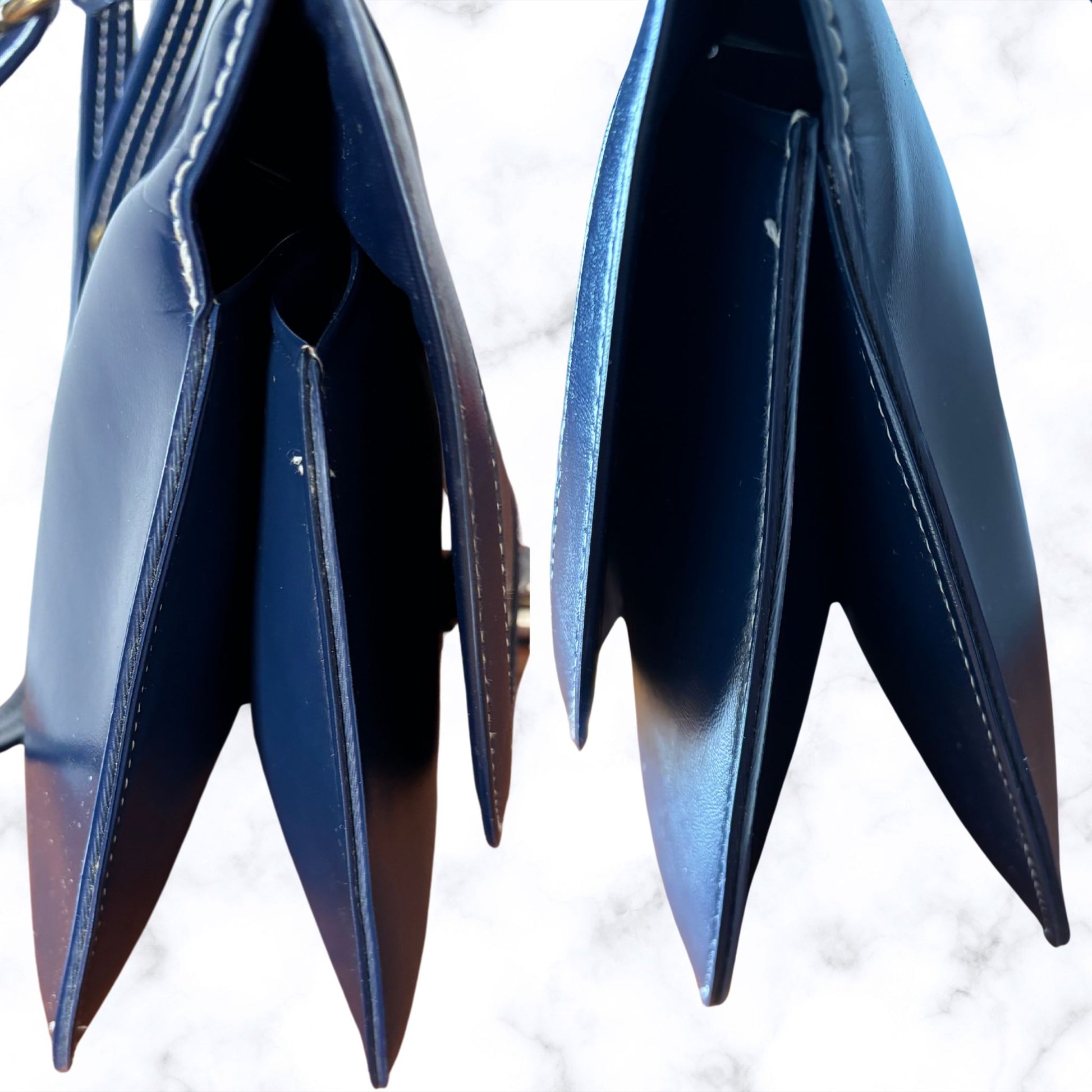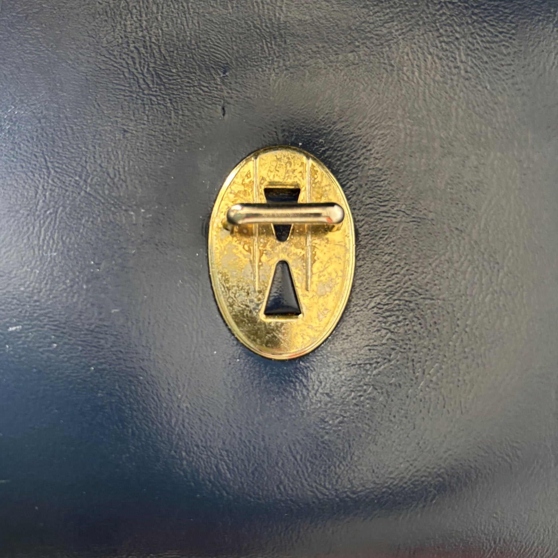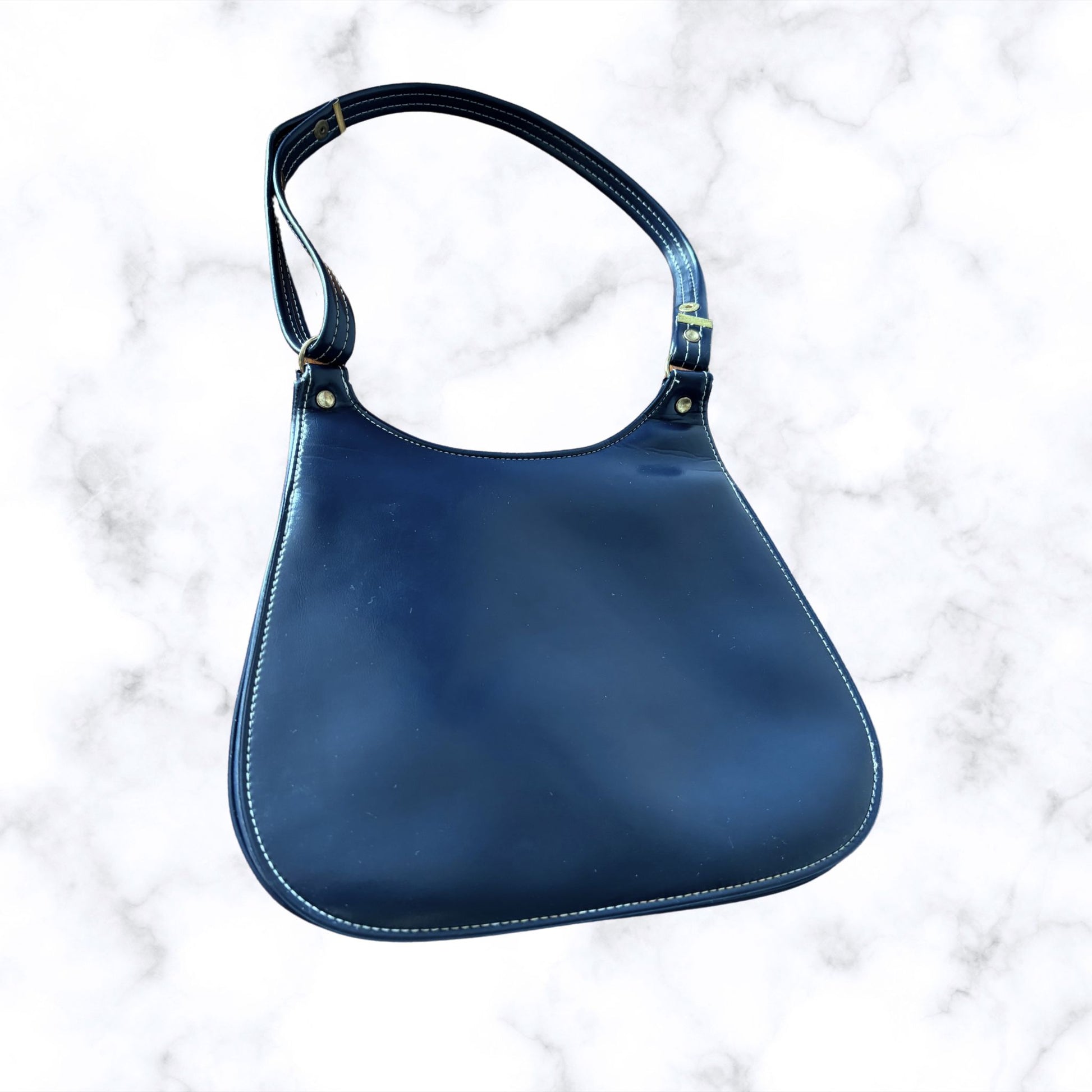This cute dark blue 1960s handbag is both stylish and practical. It comes with an adjustable shoulder strap, a metal flower detail on the front and contrasting white stitching. Inside you'll find 2 large and one small compartments perfect for your everyday essentials. This classic curved flap over front vintage bag fastens with a push front clasp.