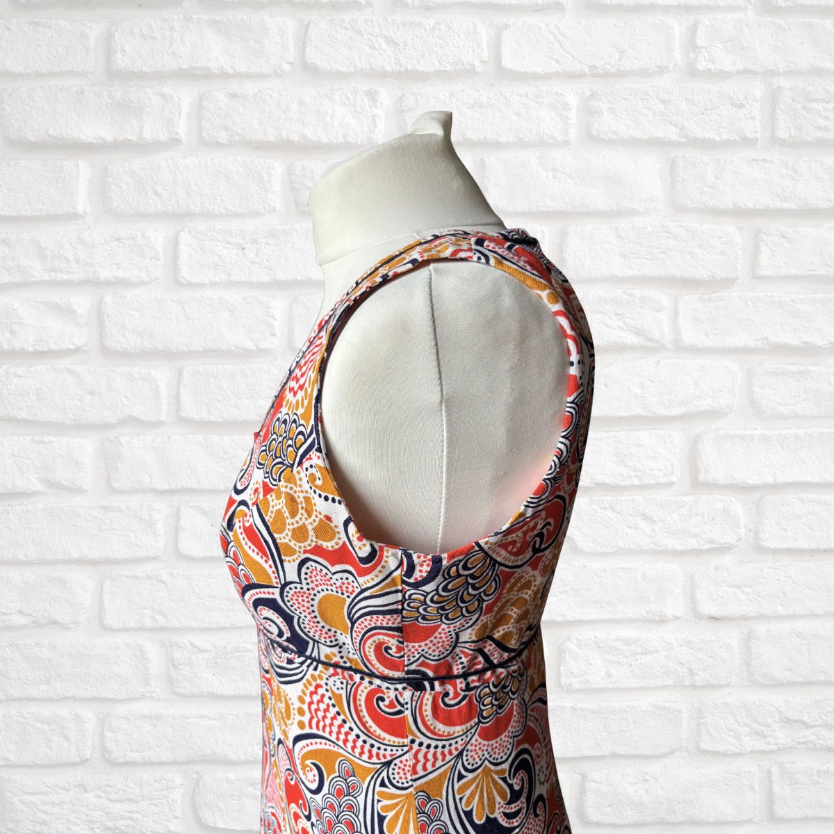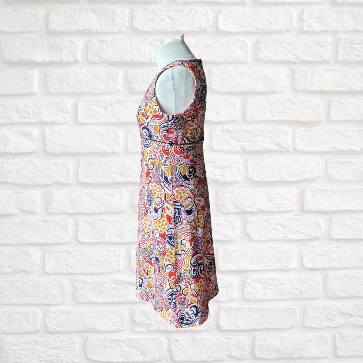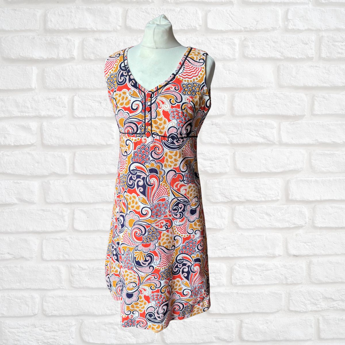 Turn heads this Summer in this vibrant white, red, gold, and dark blue swirly print vintage mini dress made from cool comfortable cotton. It’s classic 60s A line cut, sleeveless style and cute decorative details makes it the perfect choice for days in the sun.