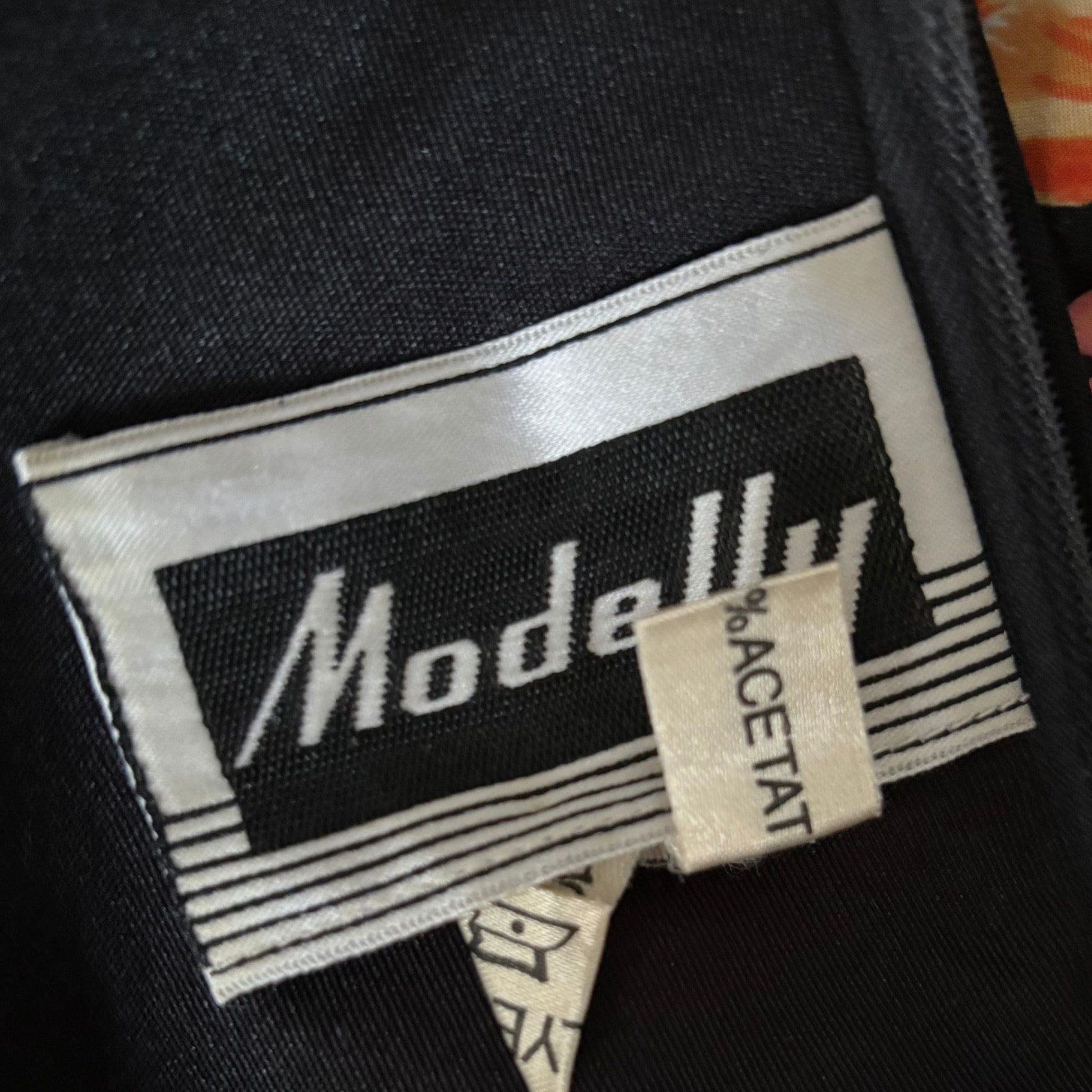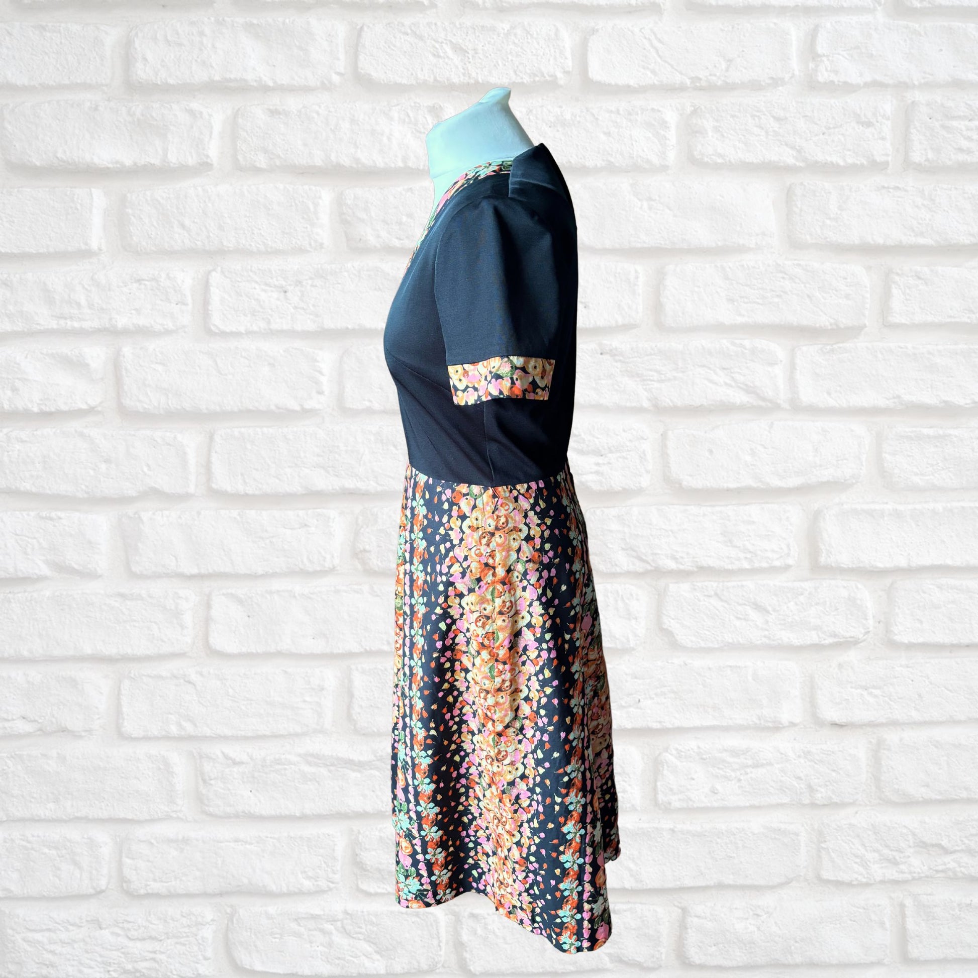 70s Black Fit & Flare Midi Dress with Fruity Floral Print . Approx UK size 10-12