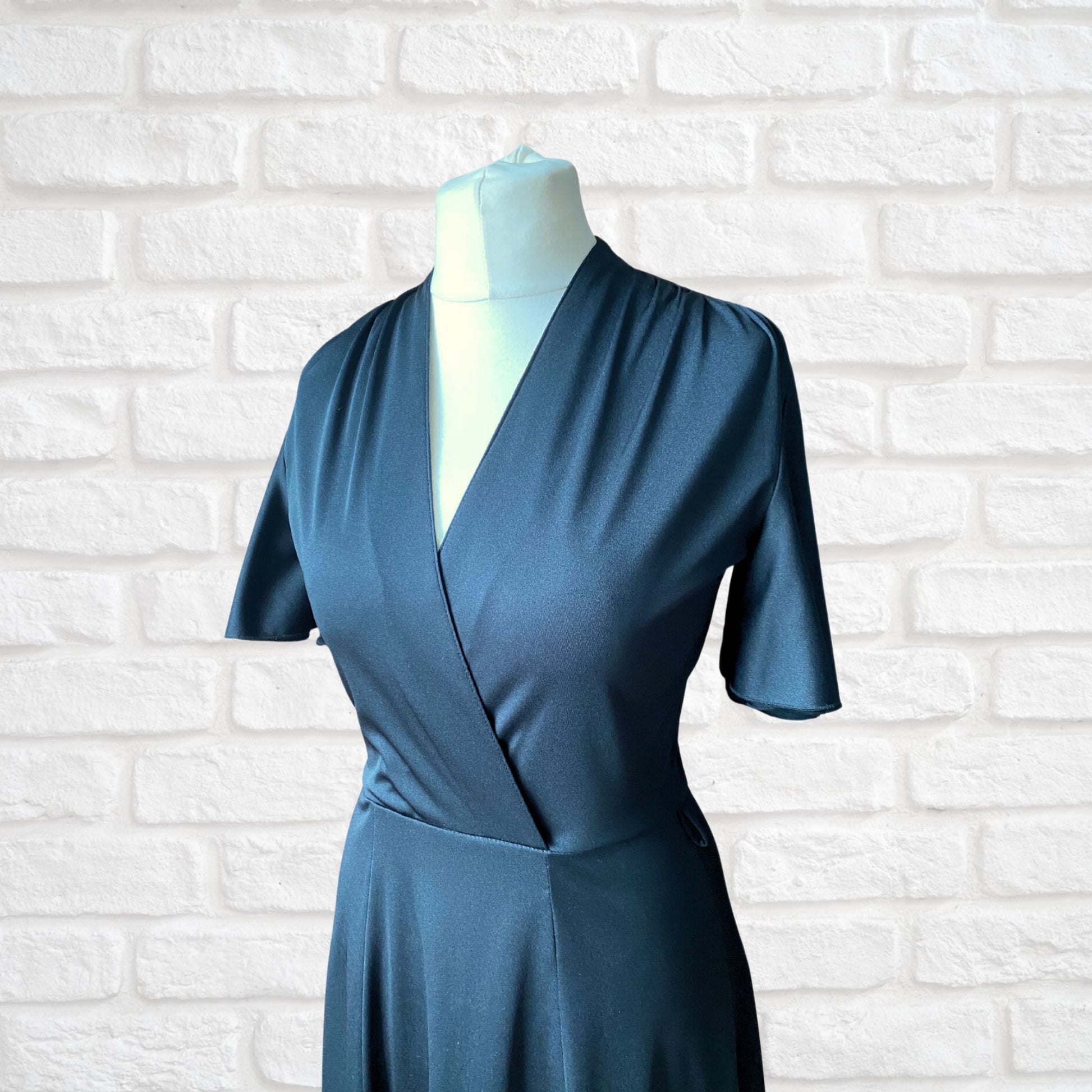 Turn heads in this stunning 70s black maxi dress by Betty Barclay. Embrace retro elegance with its flattering fit, wrap-over bodice, deep v neck, and delicate angel sleeves.