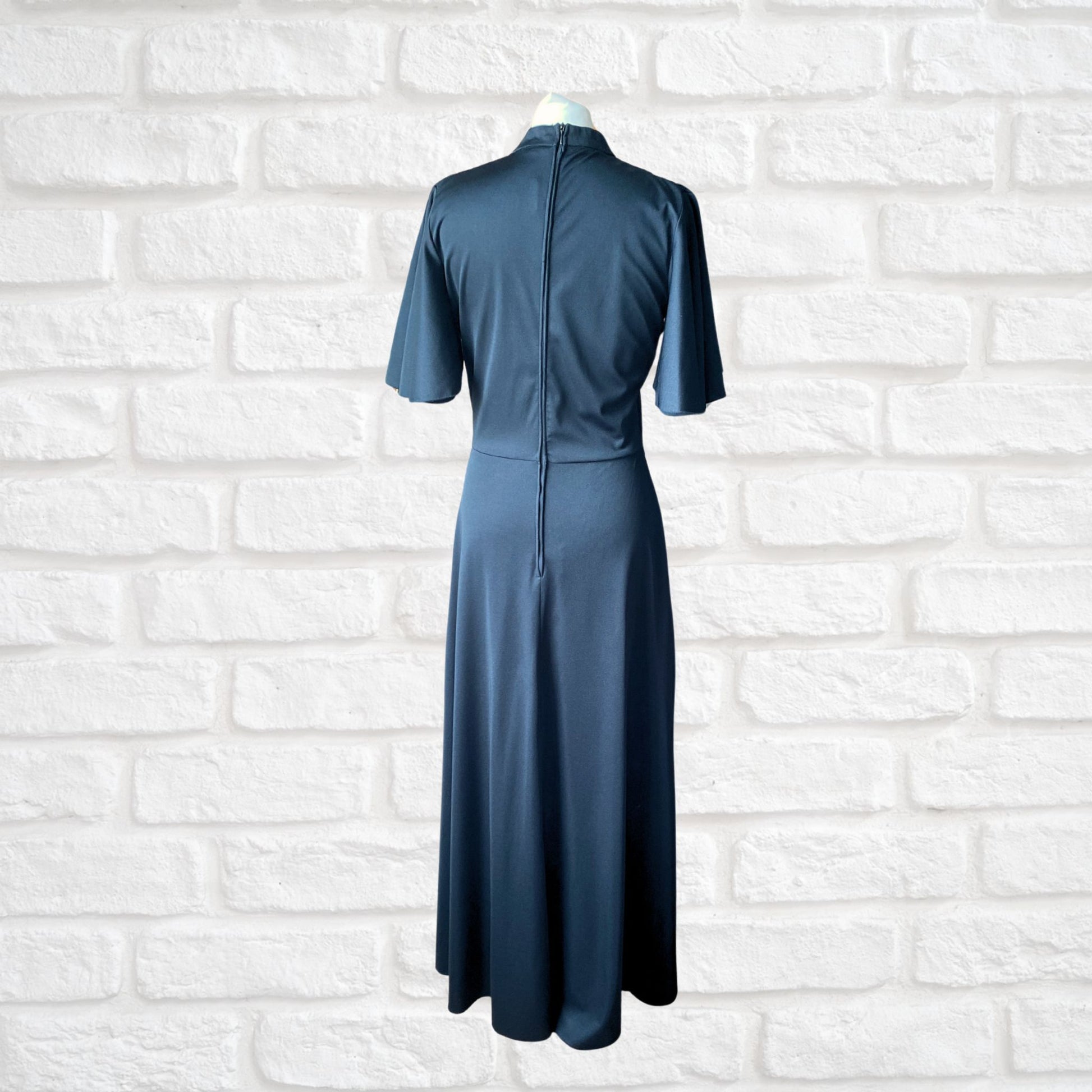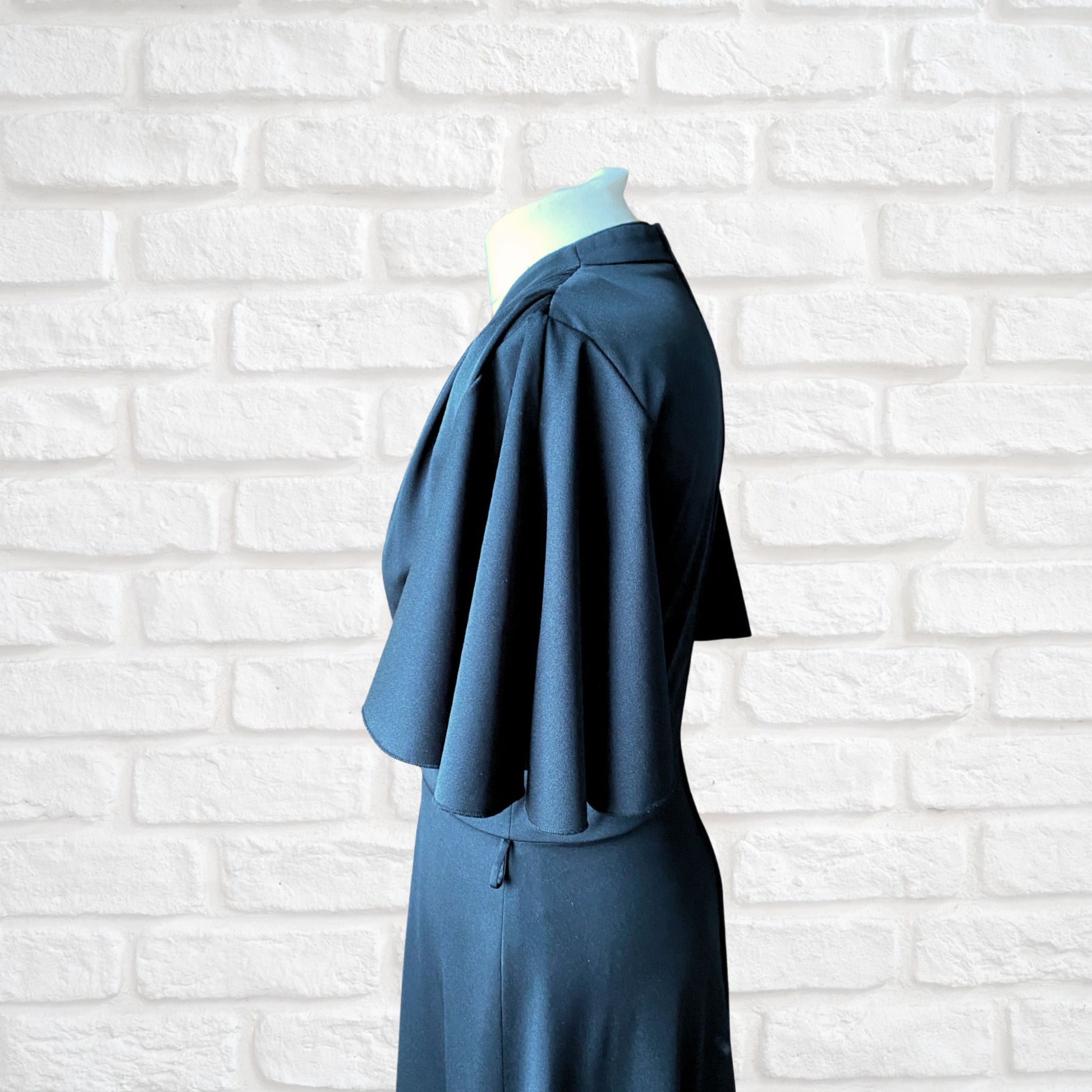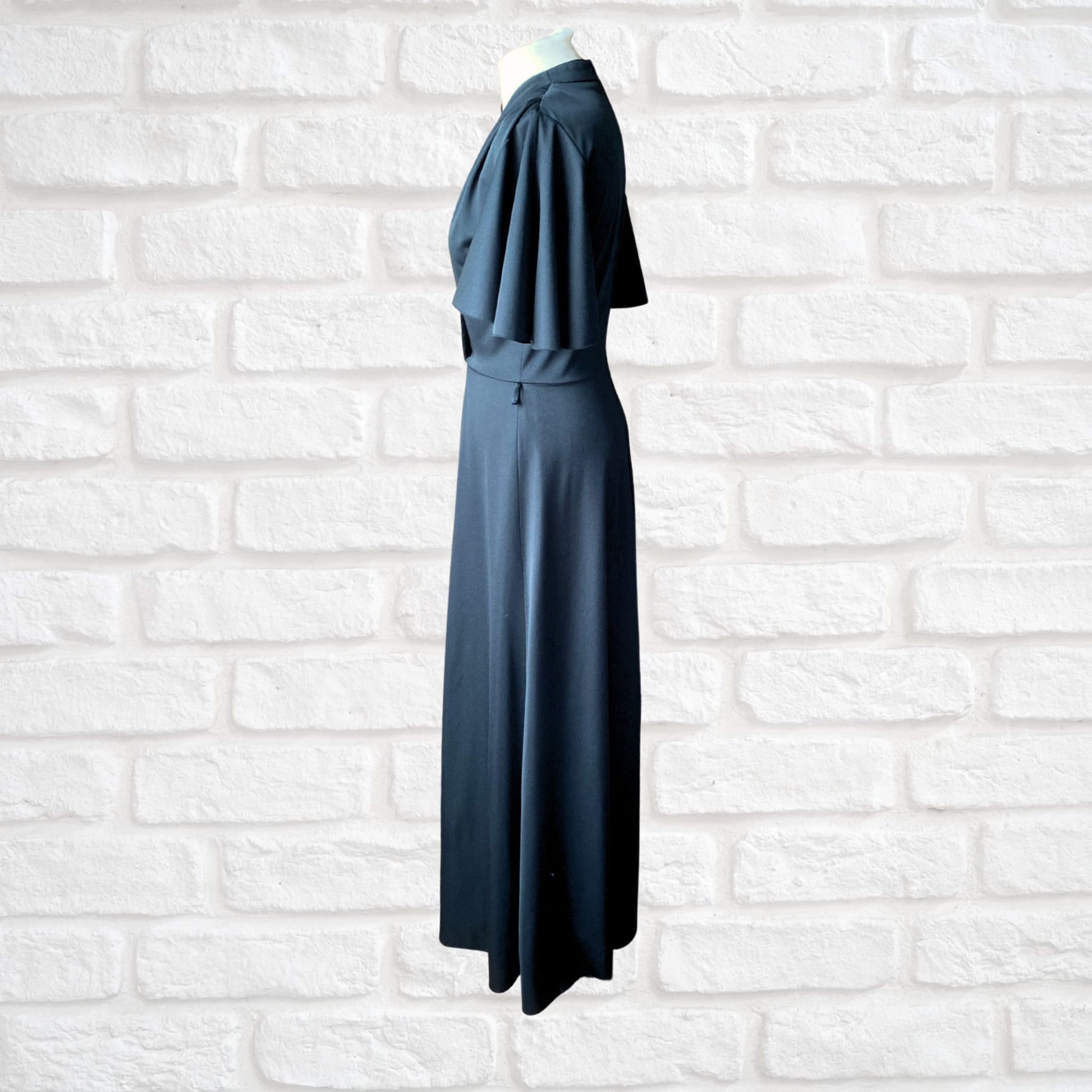 70s Black Maxi Dress with Short Angel Sleeves by Betty Barclay. Approx UK size 10-12