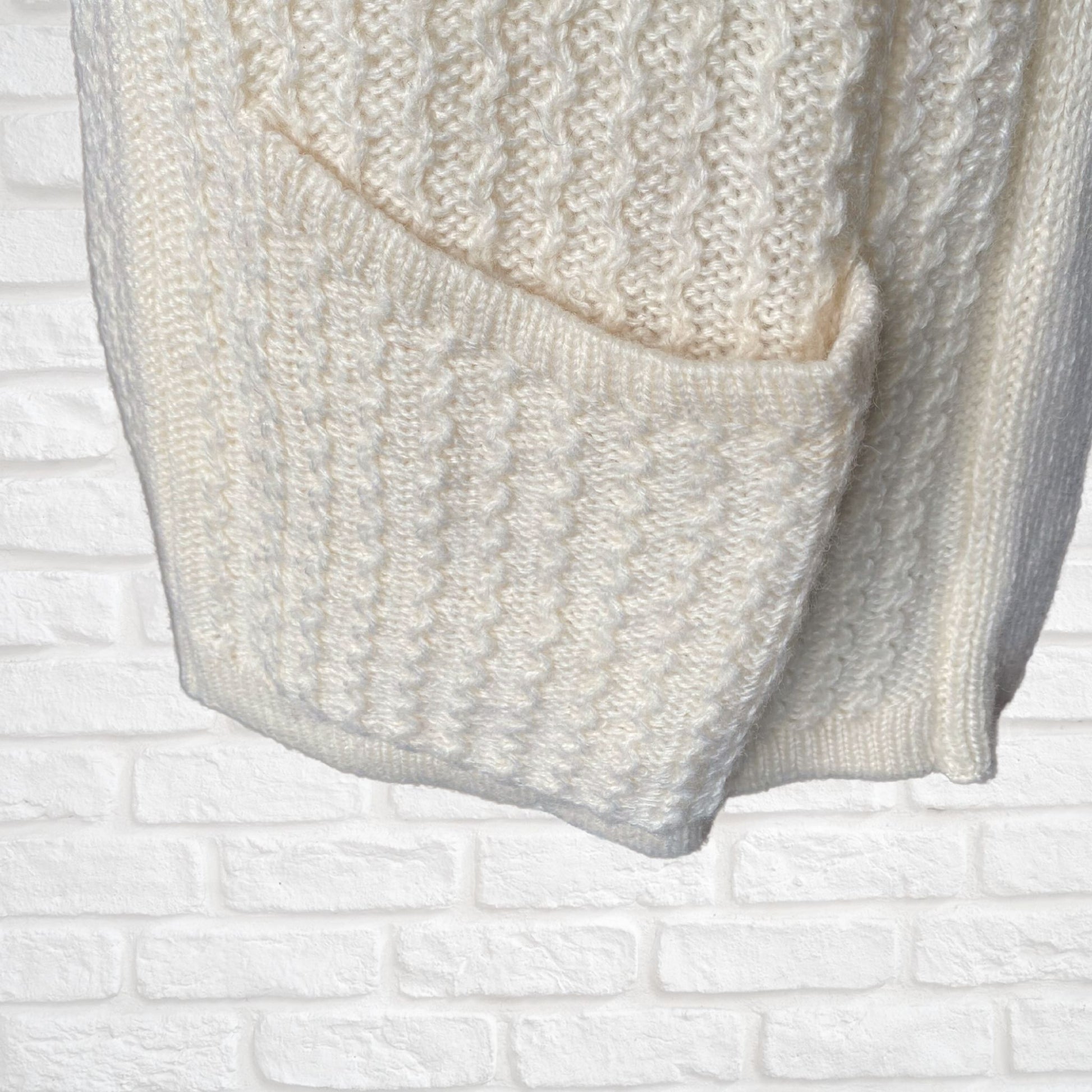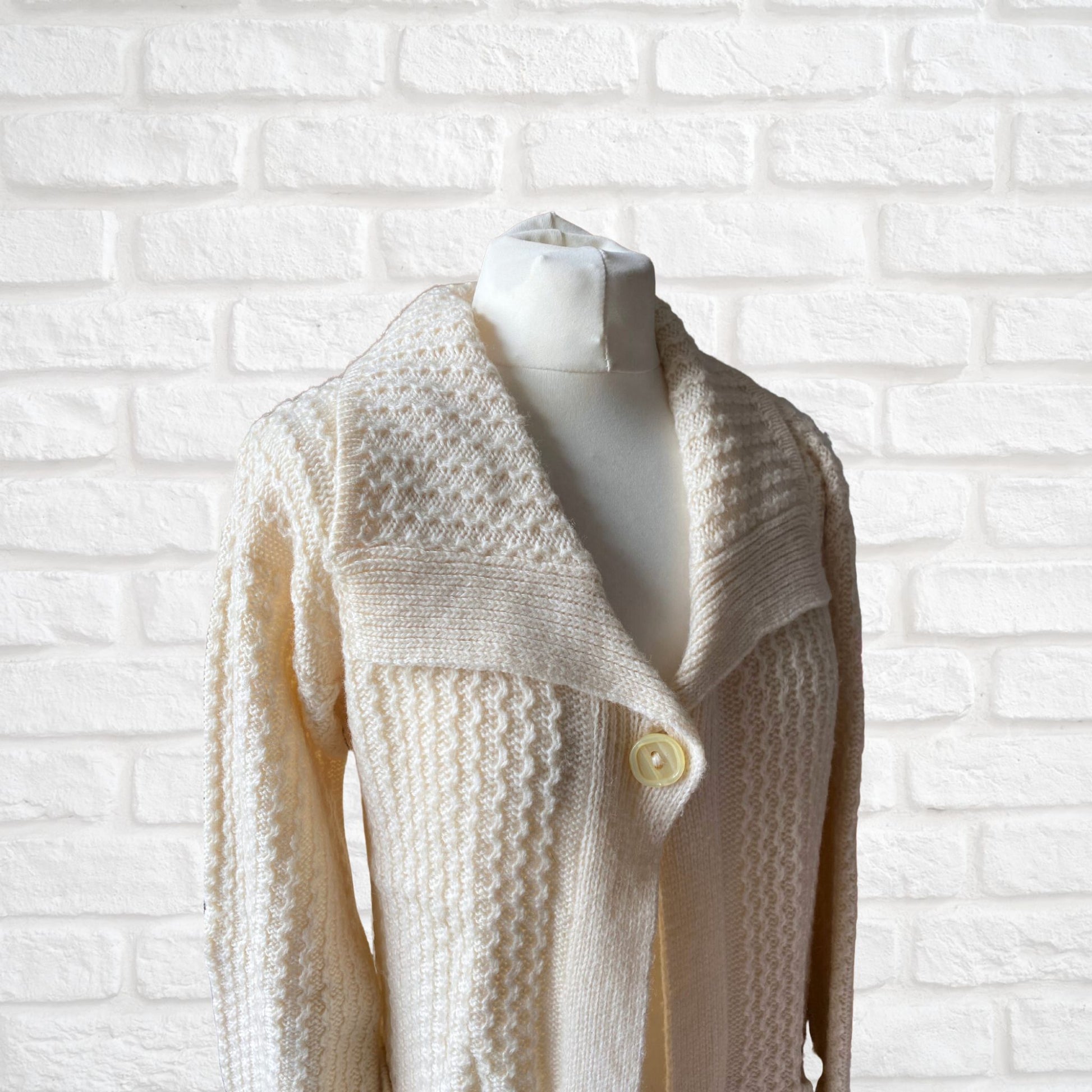 This stunning 70s cream textured knit vintage cardigan is a timeless piece that effortlessly combines vintage charm with contemporary style. This cream cable knit coverup is a must-have addition to your wardrobe, offering a versatile and cosy layering option for any occasion. Pair with flares for a classic 70s look, or layer over a maxi dress for a bohemian vibe.