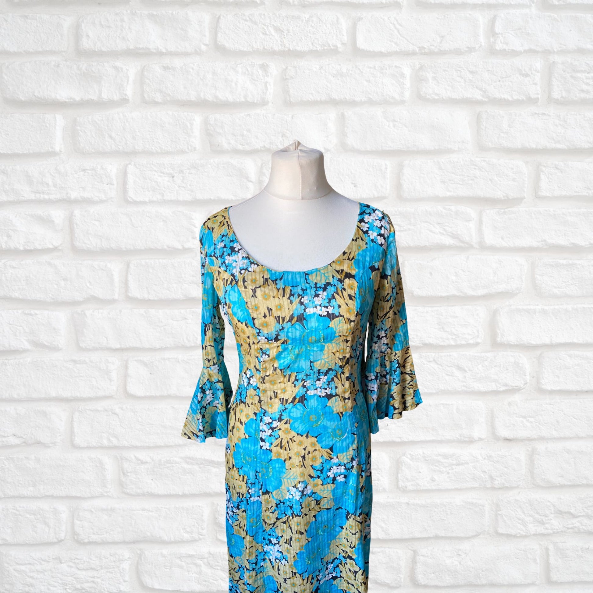 Stunning 1970s lightweight vintage maxi dress in a bold turquoise, yellow, black and white floral print. Such a flattering cut, empire line with a simple round neckline and fabulous 3/4 length trumpet sleeves. Full length vintage dresses are such amazing transitional pieces.