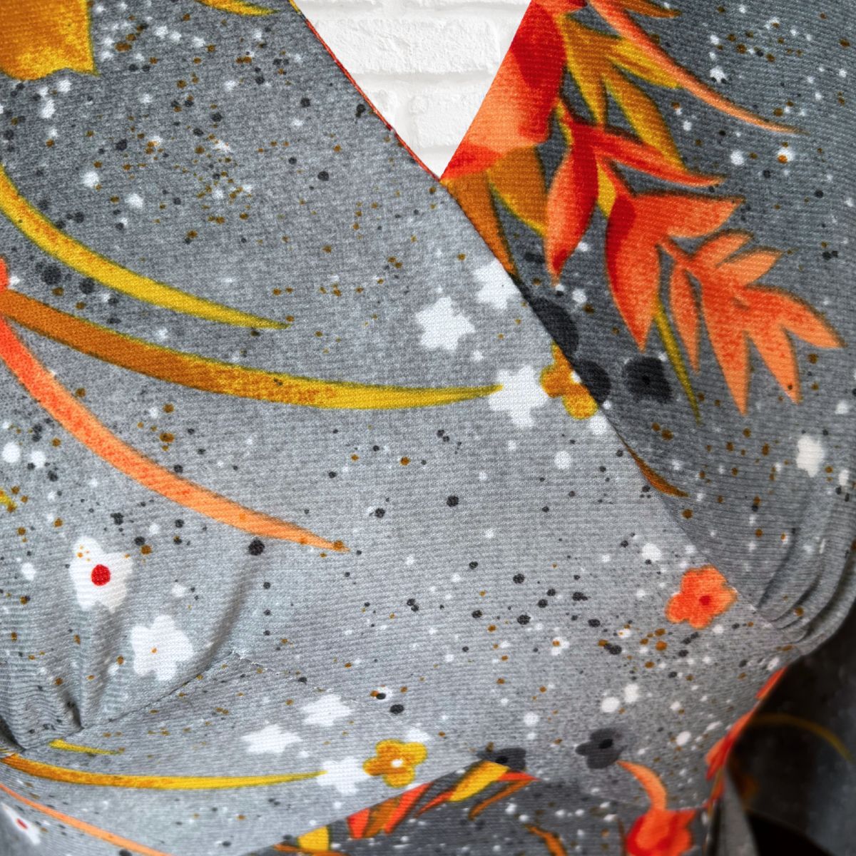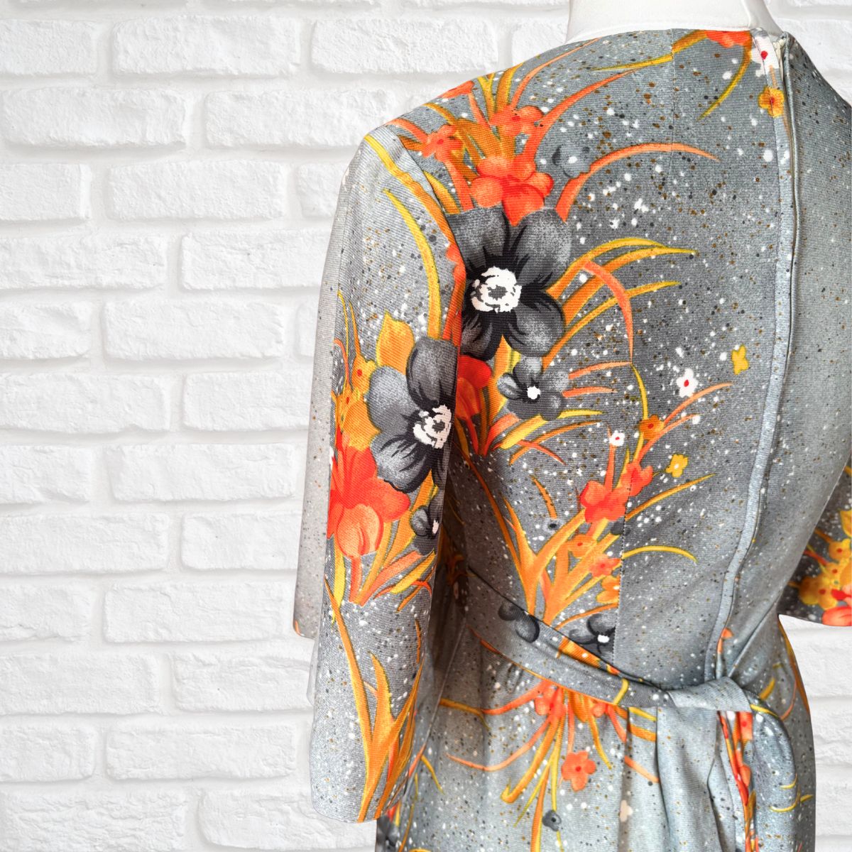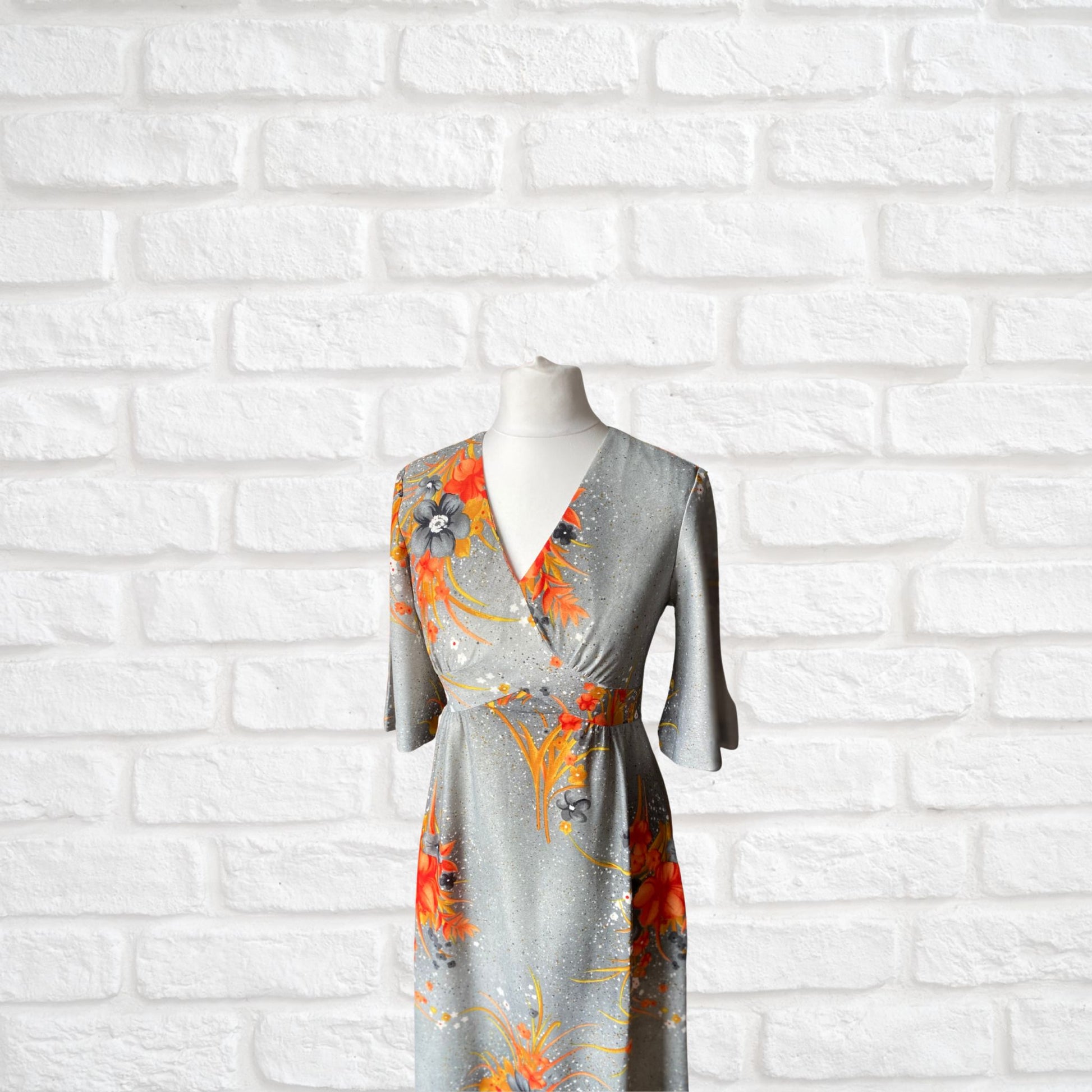 This stunning maxi dress boasts one of the boldest most beautiful flower prints I have ever seen. The combination of grey, orange, yellow, black and white is sensational. One of those great dresses that would work for any occasion.