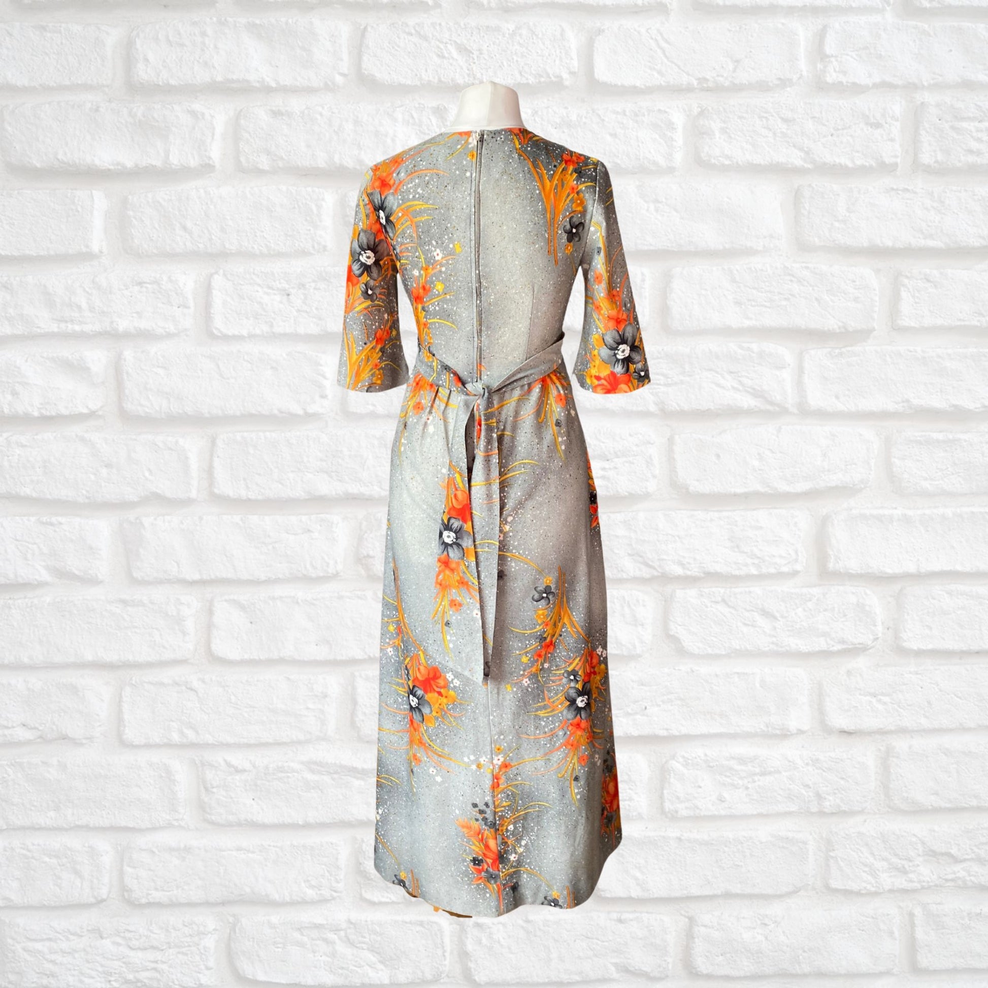 70s Hawaiian vintage maxi dress in an orange floral print. Approx U.K. size 4-6