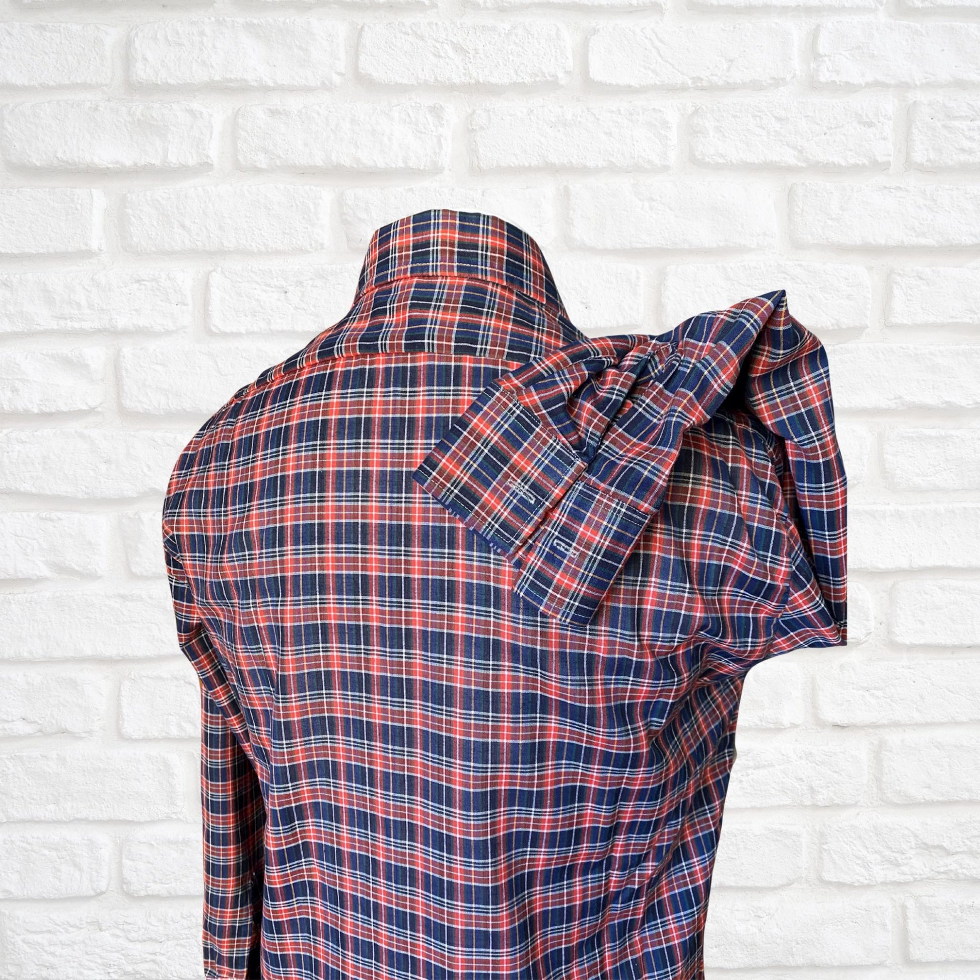 This classic vintage, vibrant red, blue, yellow, green, and white plaid print 70s shirt with its retro dagger collar and linked cuffed sleeves will be a versatile and timeless addition to your wardrobe. Pair it with your favourite jeans for a relaxed yet stylish look that exudes confidence.