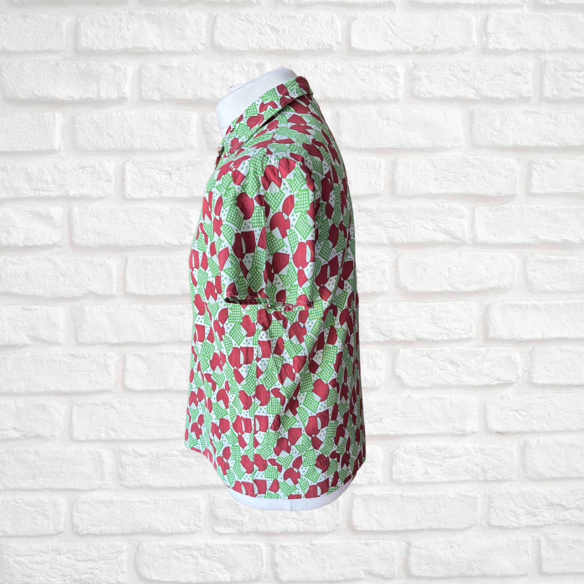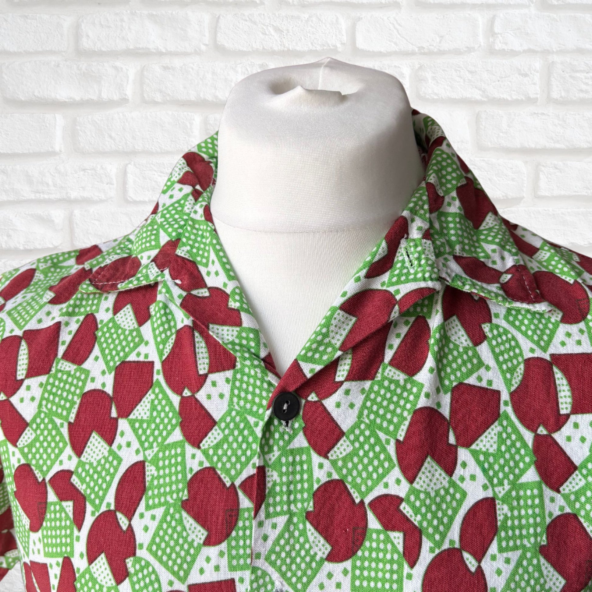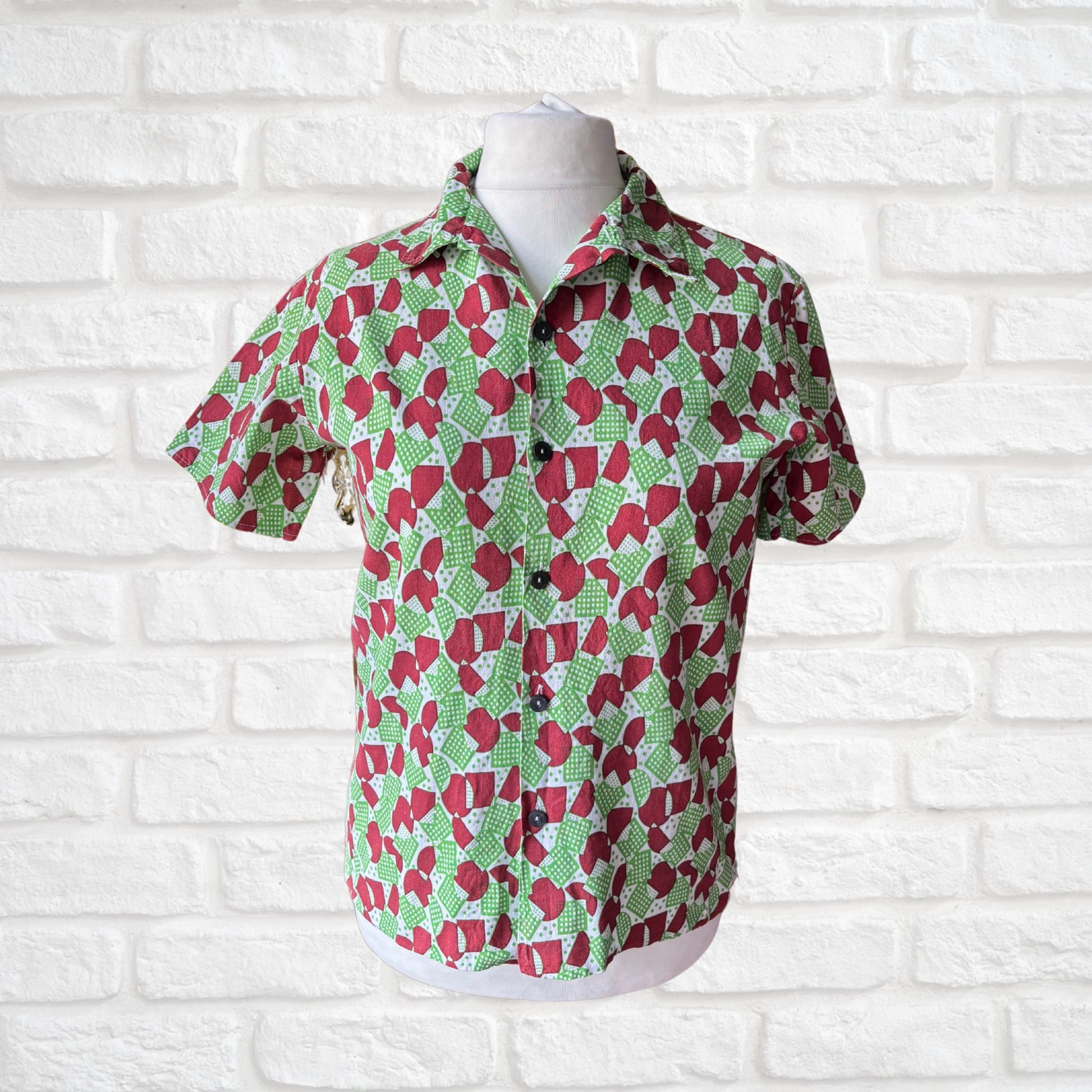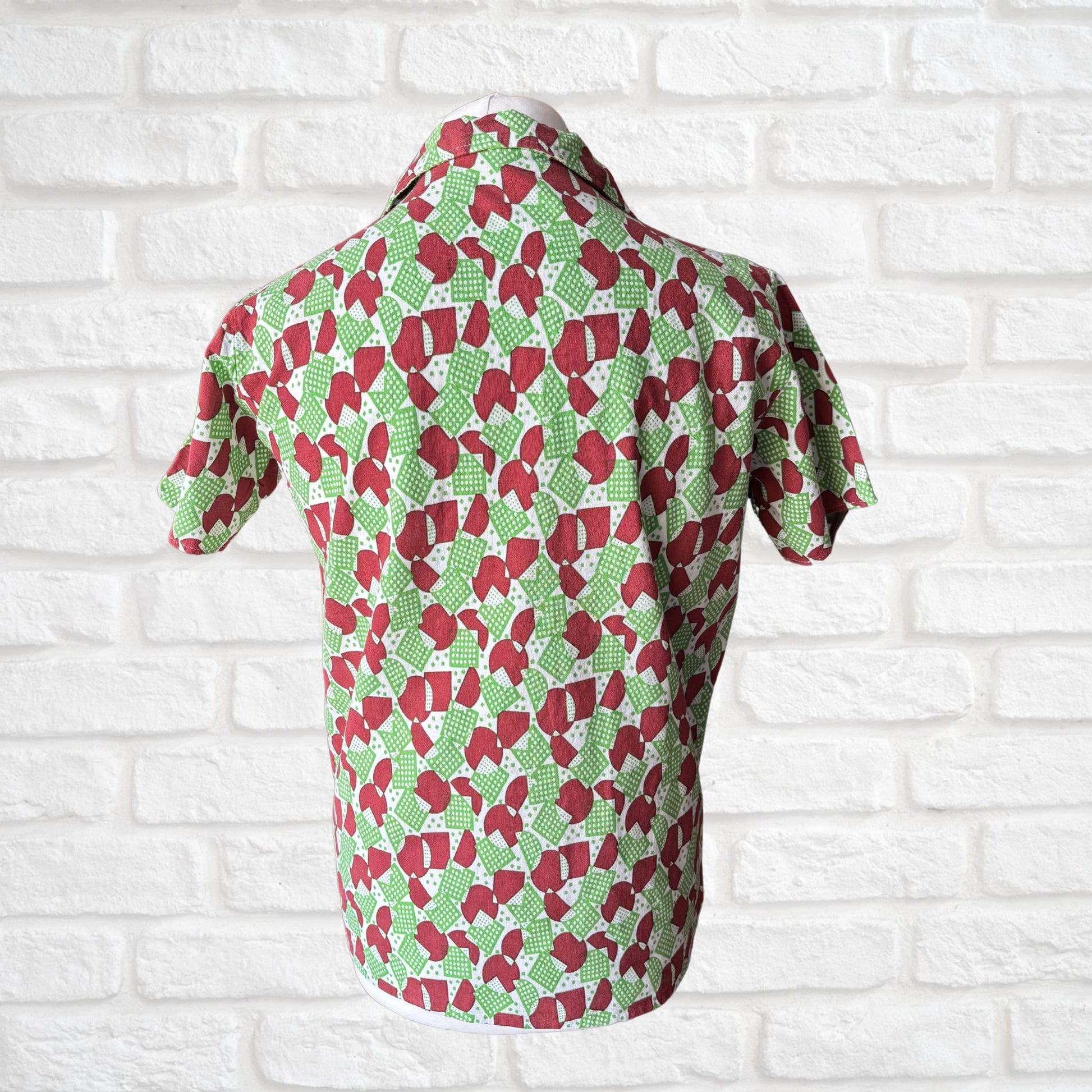 This short sleeved 70s shirt with its bright and bold green and brick red geometric print is full of retro charm. Made from a cool and comfortable cotton it features a sharp collar, short sleeves and a button down front. The perfect addition to your Summer wardrobe, an easy to wear style statement.
