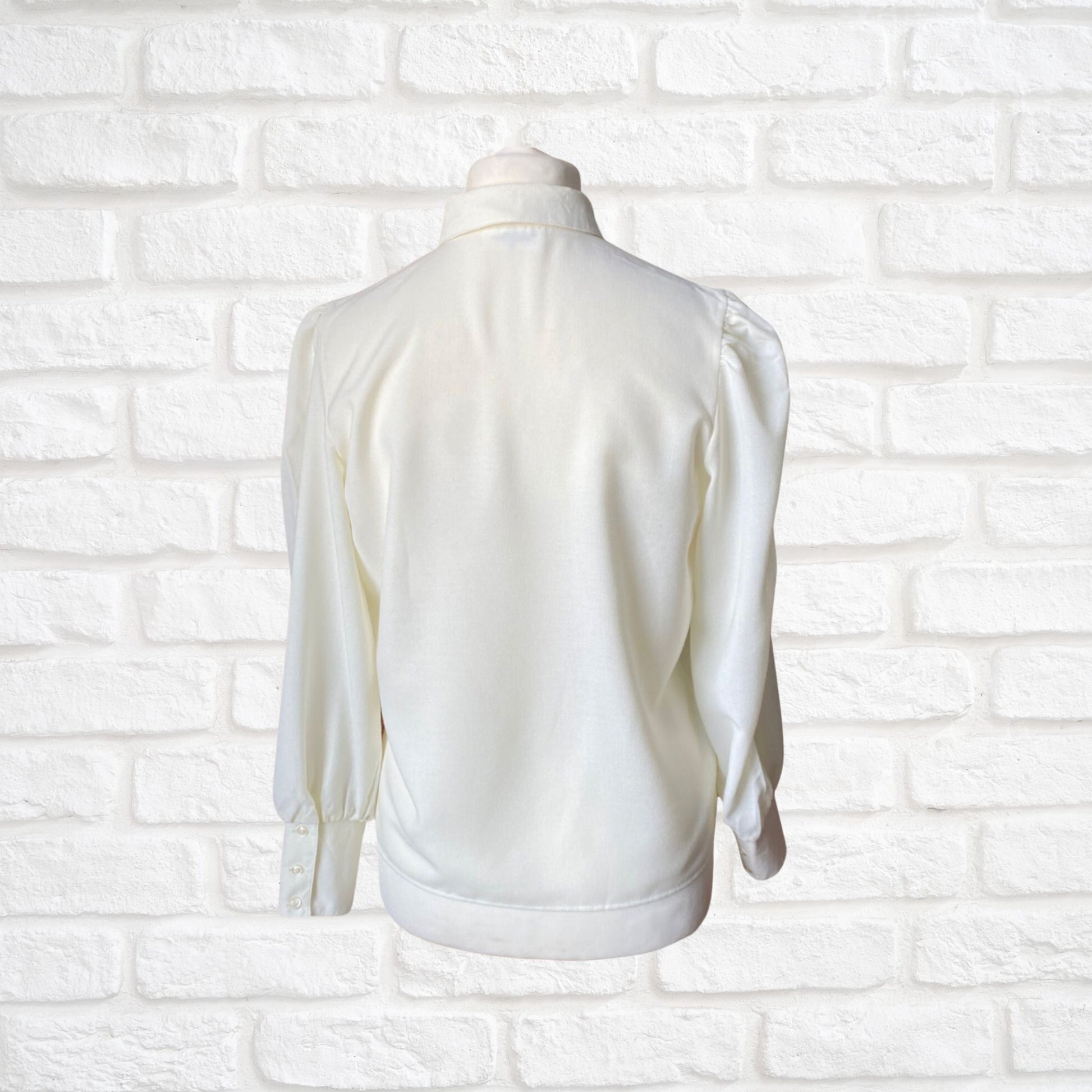 Such a pretty 80s cream blouse with lovely detailing from the gorgeous embroidery on the front to the cute Peter Pan collar with a delicate neck tie.