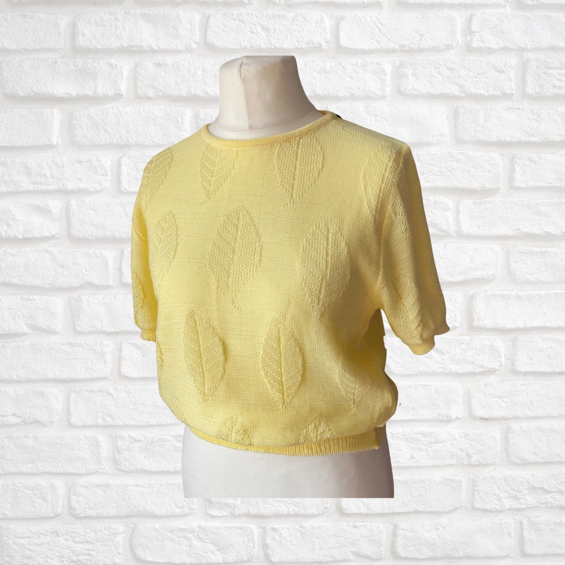 Lovely Spring/Summer vintage leaf embossed top in the prettiest shade of yellow. The cool and comfortable acrylic/cotton knit and cute short puffed sleeves make this a dream to wear.