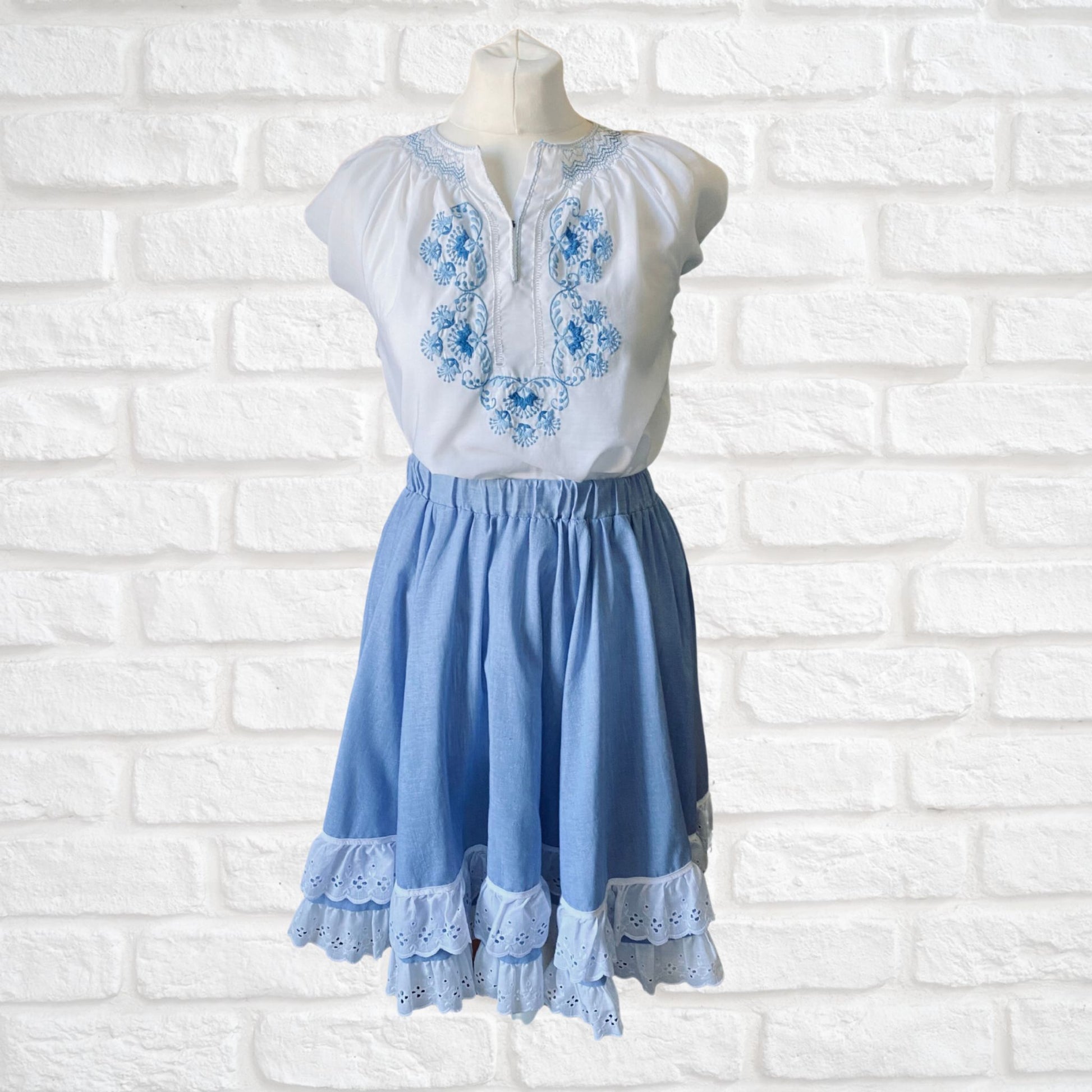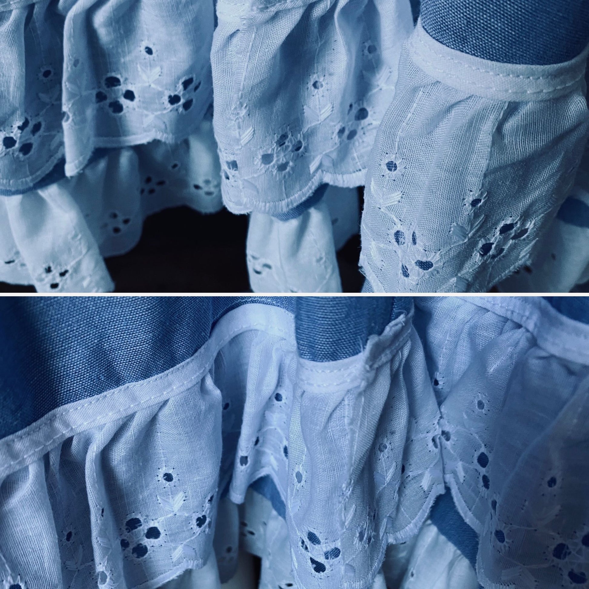 Such a cute eighties flared mini skirt in a pretty chambray style shade of pale blue with a double ruffle of white broderie anglaise ribbon at the hem.