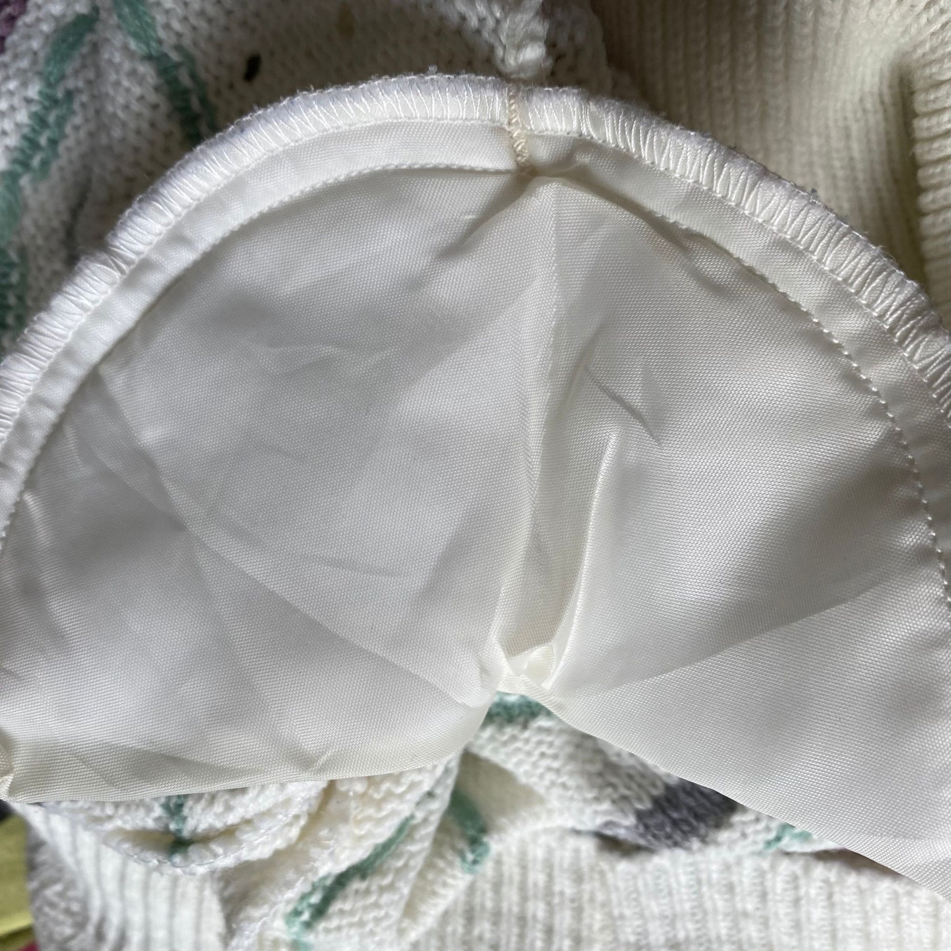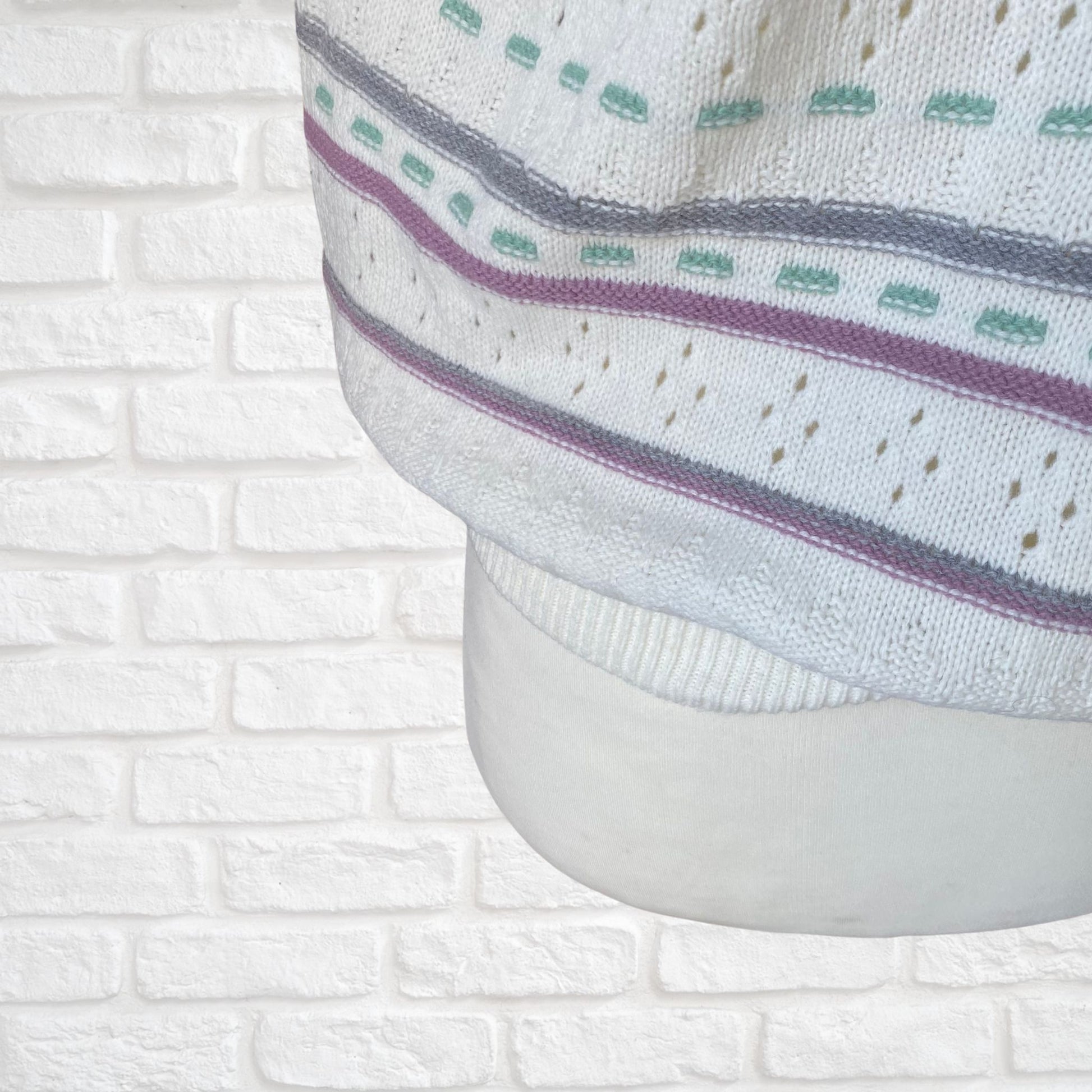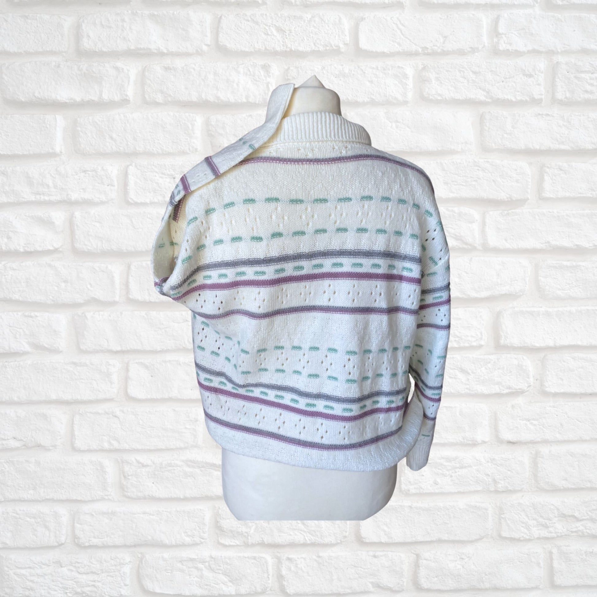 Such a pretty vintage sweater, white with a mauve, green and soft grey floral and textured abstract print. Soft and comfy to wear. The perfect Spring/Summer cover up.