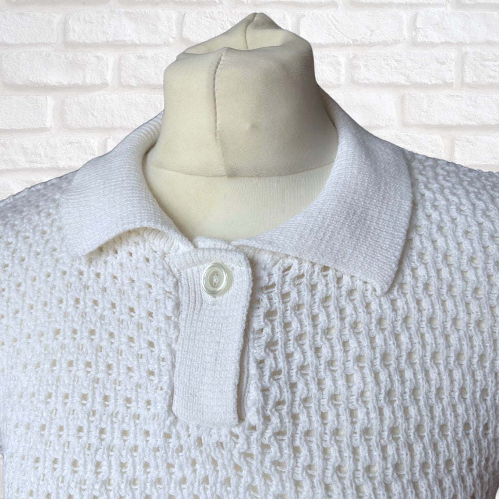 The cute and sporty 80s knitted top is perfect for easy Summer days. Keep cool in open knit sleeveless design with its playful bright blue stripes and stylish white collar.