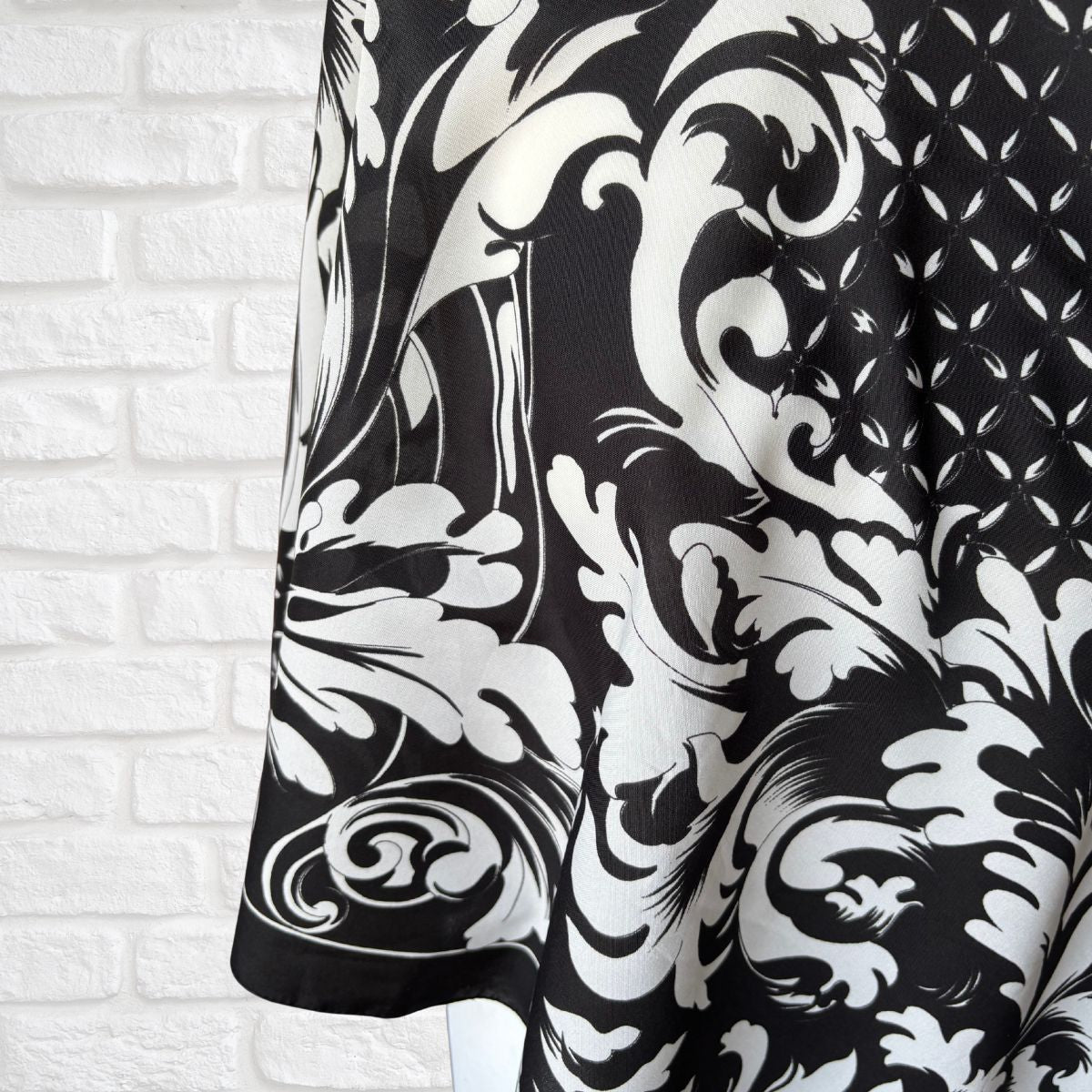 This striking black vintage scarf features a white border and a baroque style leaf design. Versatile and chic, and perfect for gifting, this scarf can be worn in countless ways to elevate your style. Perhaps loose around your shoulders, in your hair, or around your neck and tied to the side, the possibilities are endless.
