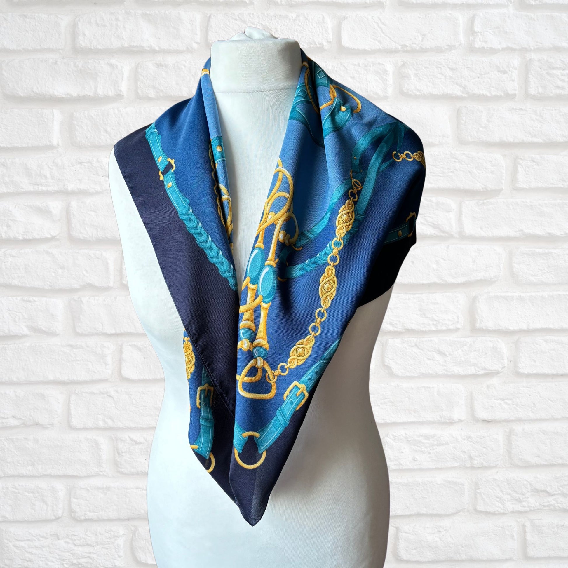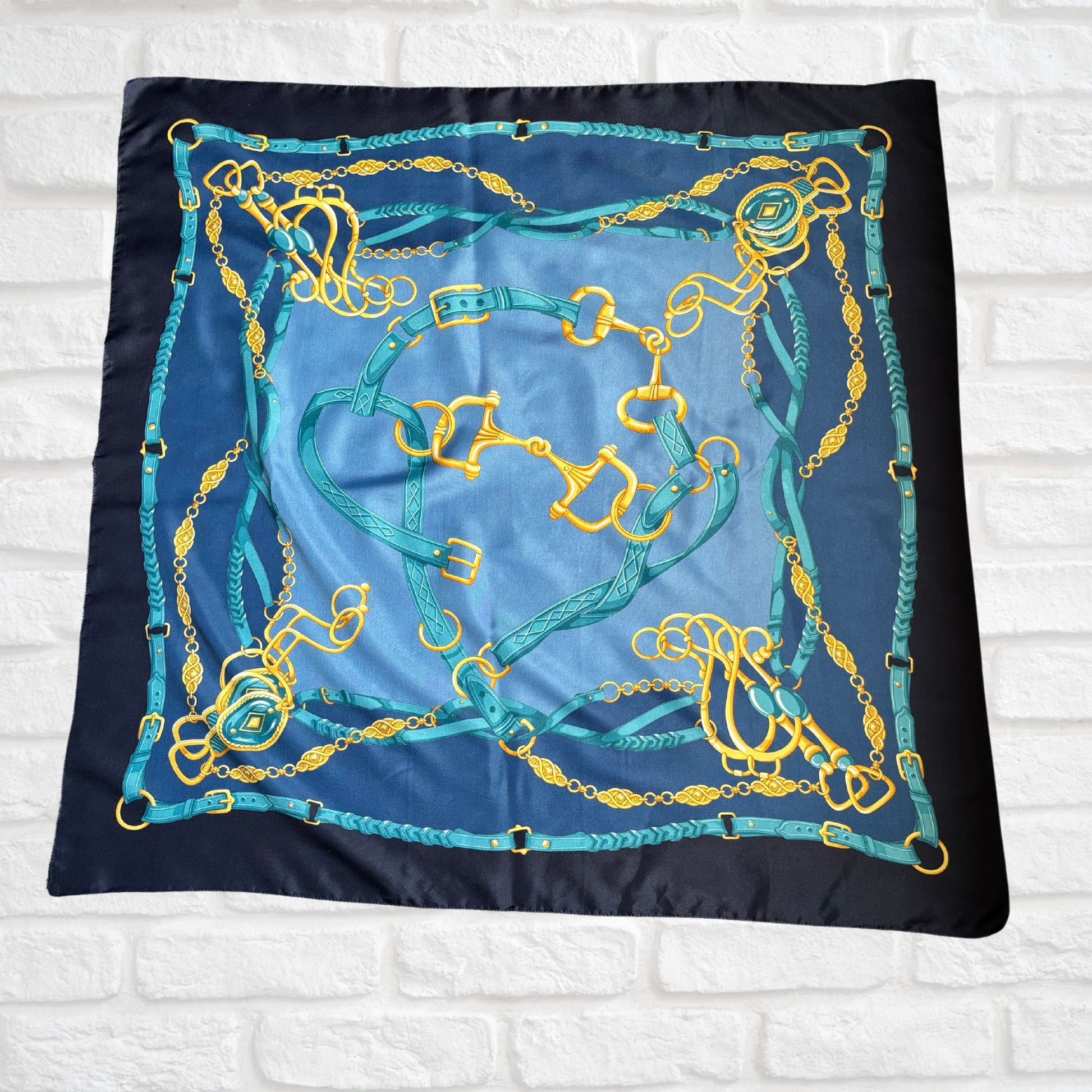 This elegant navy blue silky feel square scarf features a classic golden chain and turquoise blue belt/harness design.