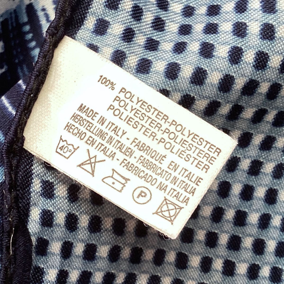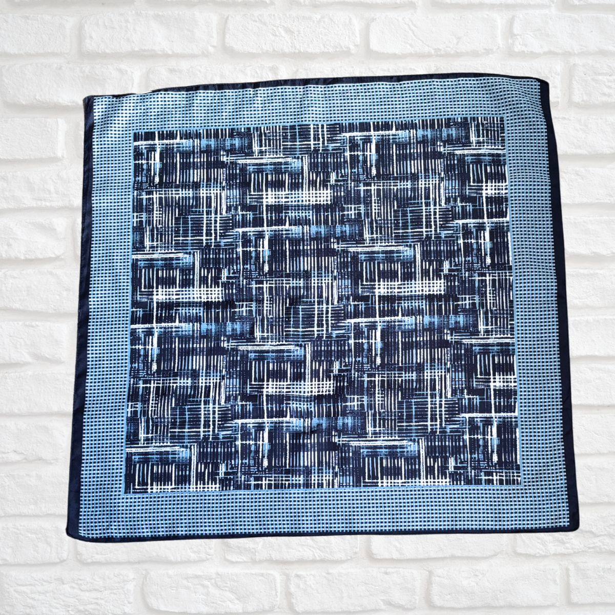 - Dark blue scarf with a border or tiny squares and a central linear design in light blue, navy blue and white