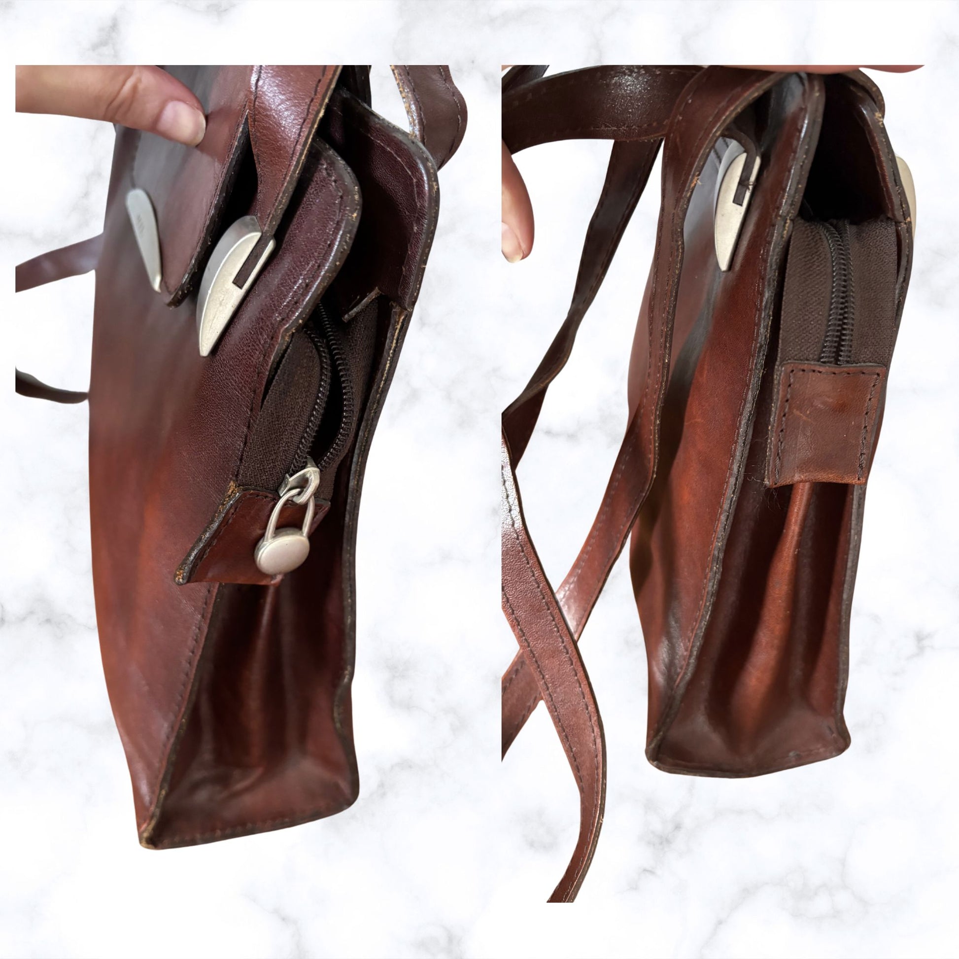 Make an elegant fashion statement with this stunning dark conker brown leather vintage handbag with contrasting silver coloured metal hard wear. . The double shoulder straps offers versatility, allowing you to wear either as a shoulder or cross body bag. The zip fastening under the popper closure flap reveals a spacious interior with a large central zip up pocket providing ample secure storage space for your essentials.