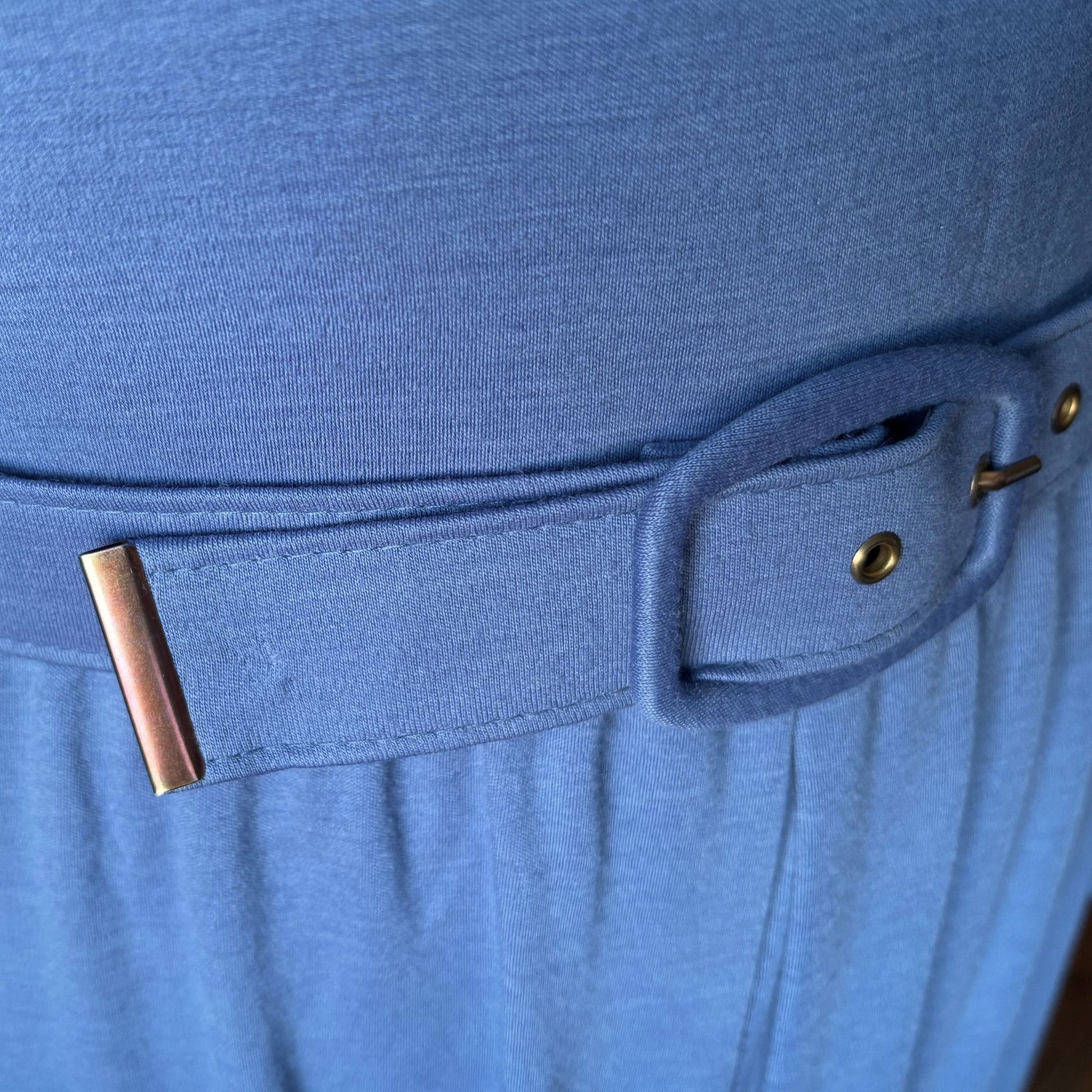 This elegant blue belted 70s vintage midi dress has such pretty detailing with a nod to the classic styles of the 1940s. The charming double tie neckline, floral appliqué detail on the shoulders and matching belt add extra sophistication to this lovely tea dress.