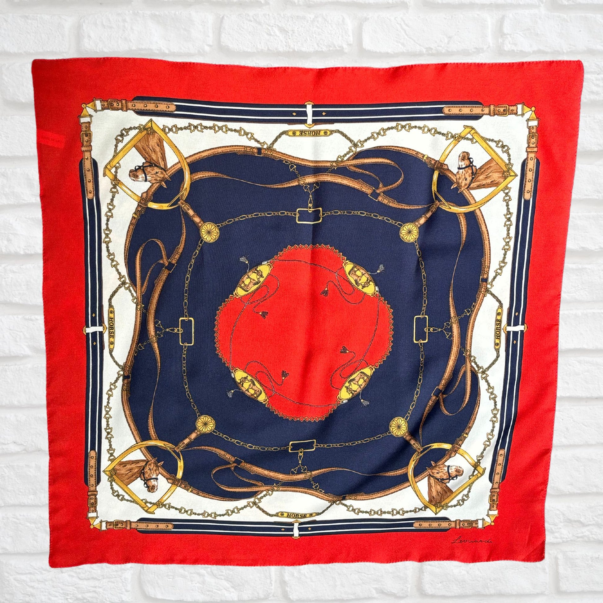 Elegant Navy Blue, Red, White , Brown and Gold Equestrian Style/Horse Design Square Vintage Scarf by Leonardi. Great Gift idea