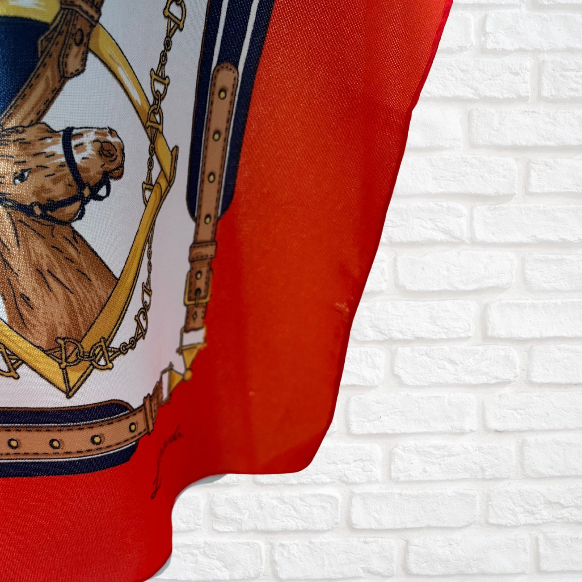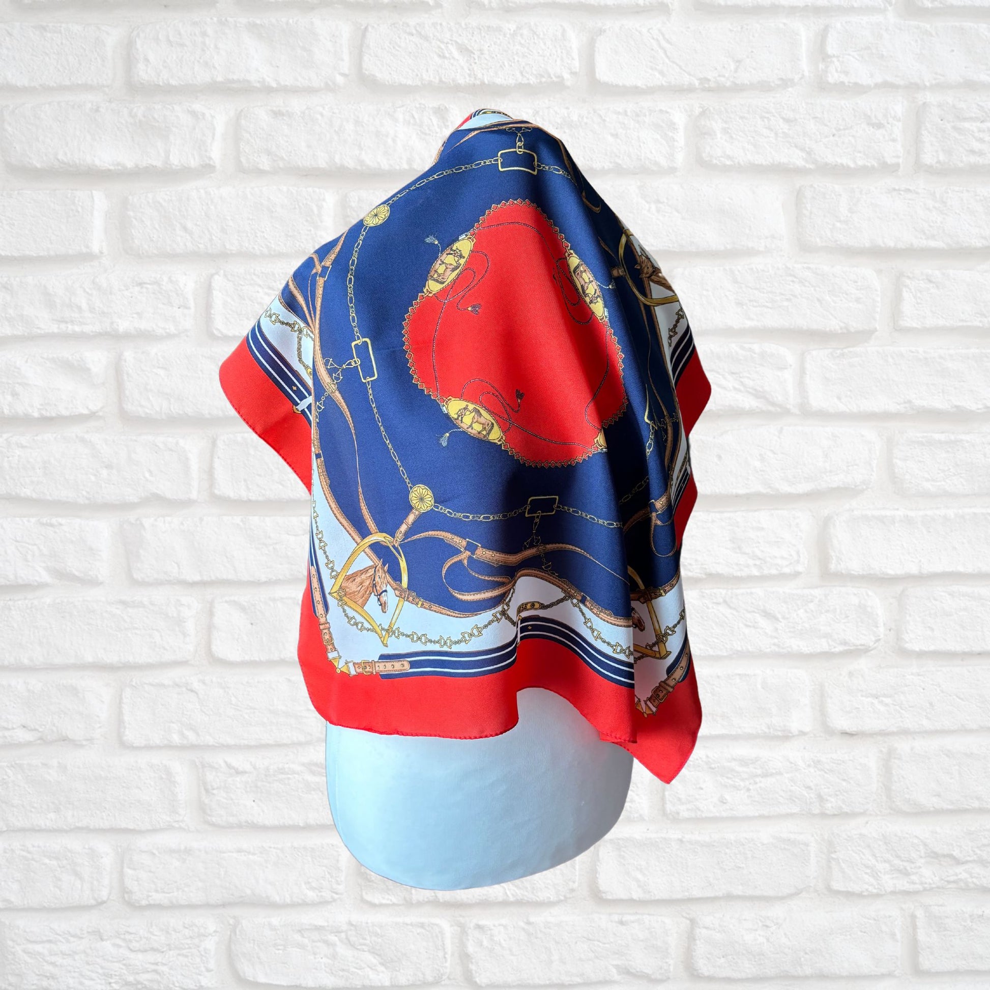 This chic square vintage scarf features a classic golden chain, rope, buckle, stirrup and brown belt/harness and horse design on dark blue, white and red. Versatile and chic, and perfect for gifting, this scarf can be worn in countless ways to elevate your style. Perhaps in your hair, or around your neck and tied to the side or front, the possibilities are endless.