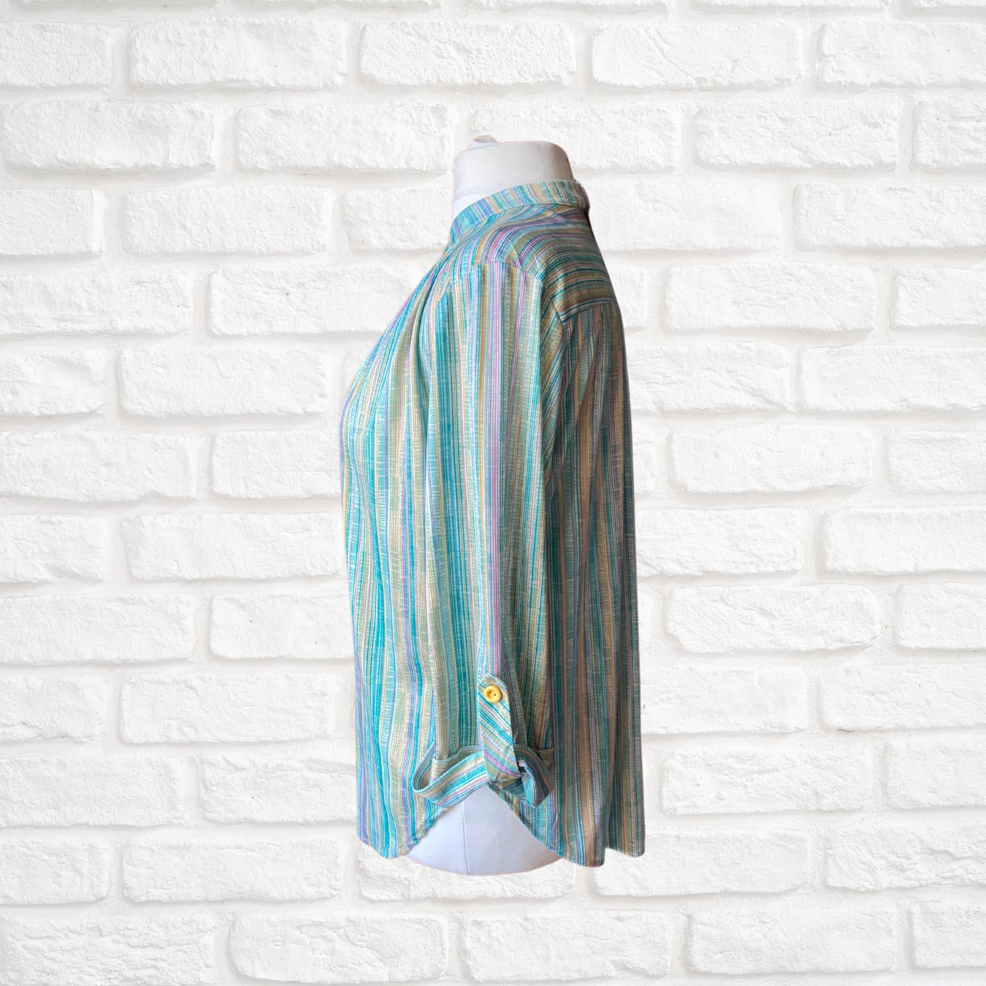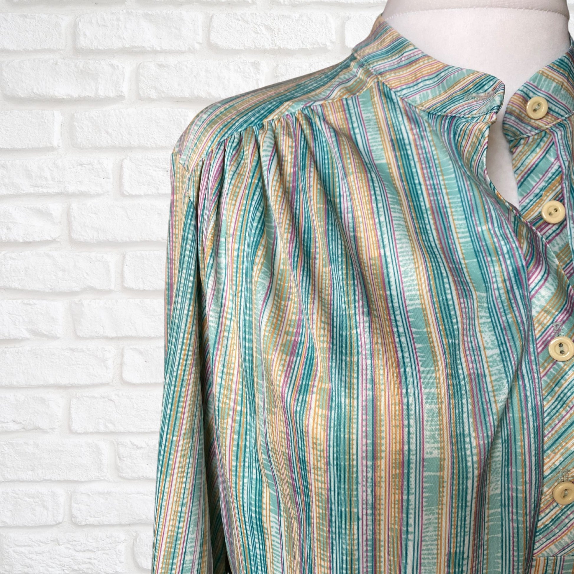 This stunning silky vintage blouse in combination of green, white, teal, pink, and yellow stripes is such a vibrant piece that will make a statement wherever you go. Perfect for both casual and formal occasions, this versatile top can be worn loose over jeans or shorts for a laid-back look, or tucked into a skirt for a more polished and sophisticated outfit.