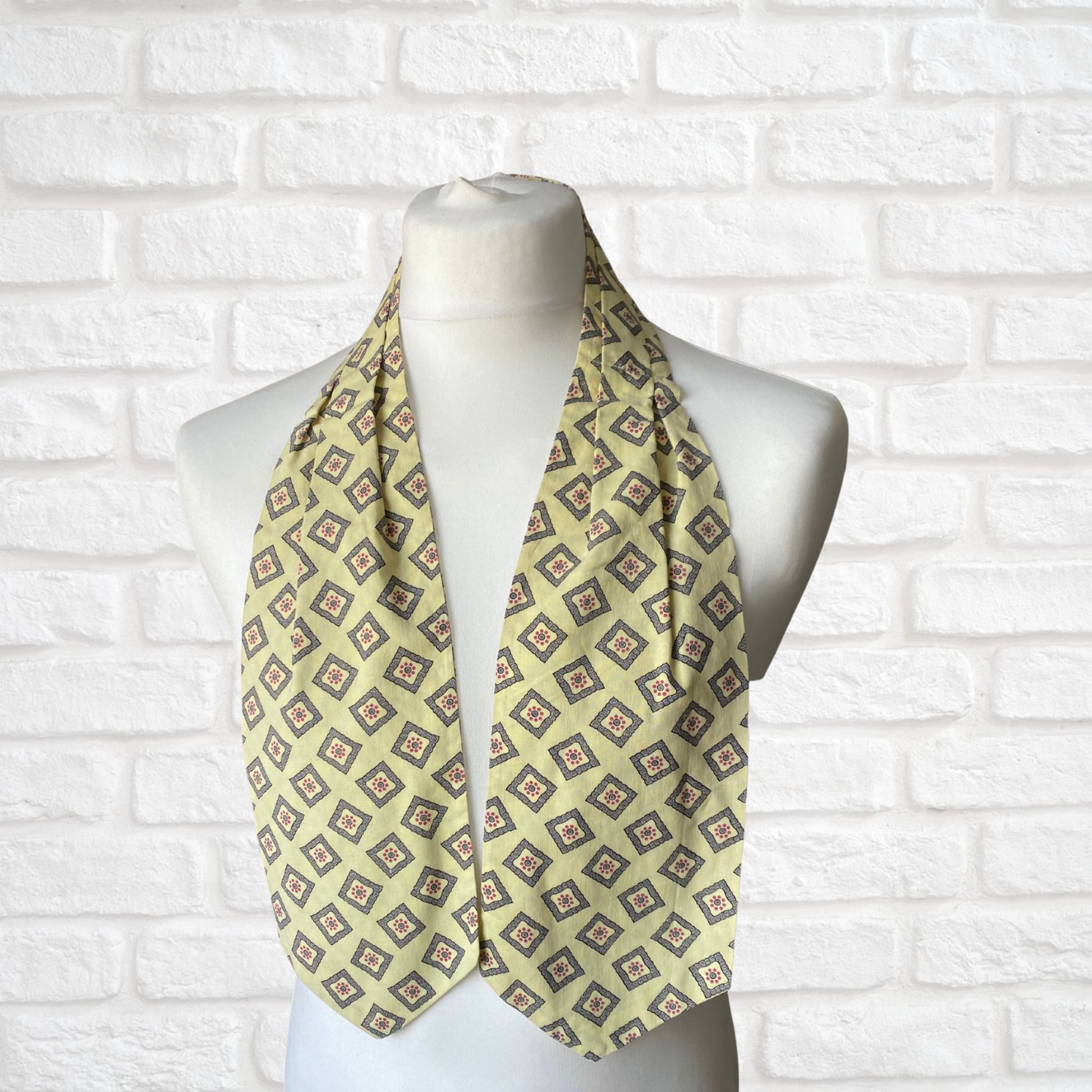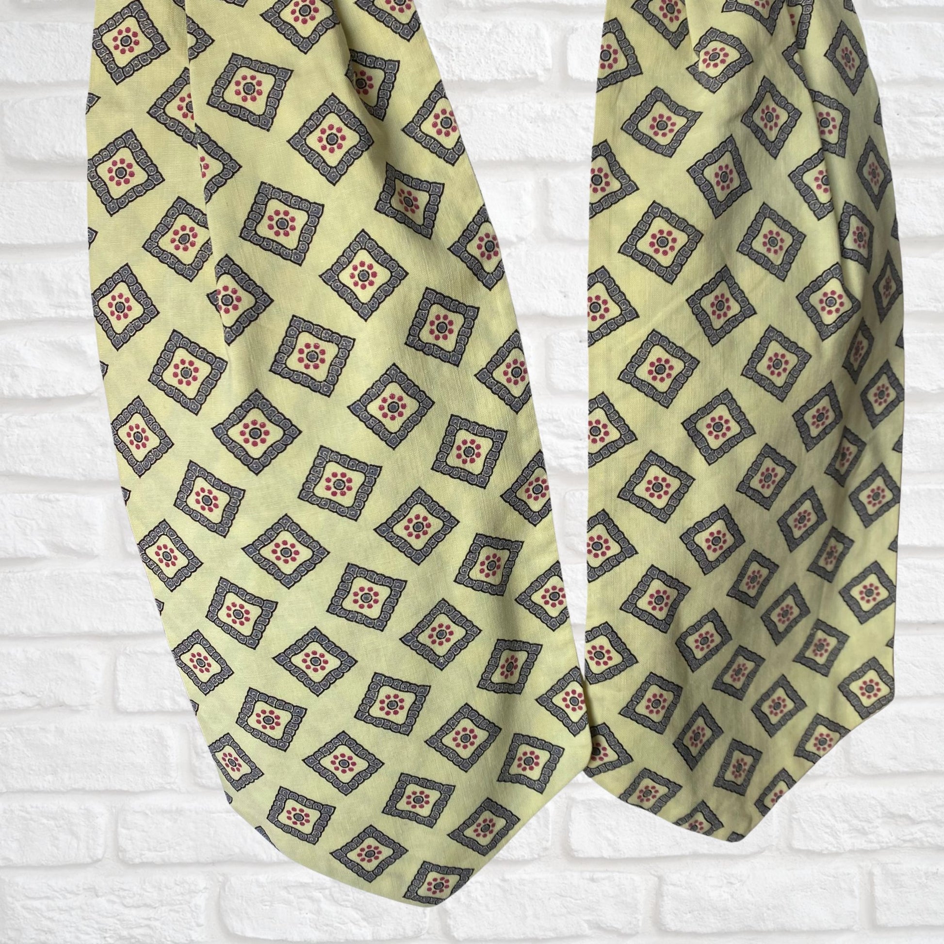 Mod style pale yellow, grey blue and red print vintage cravat by British brand Duggie