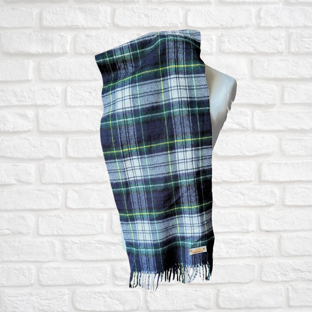 This stunning vintage plaid scarf in complimentary shades of navy, yellow, green and white beautifully combine style and warmth.