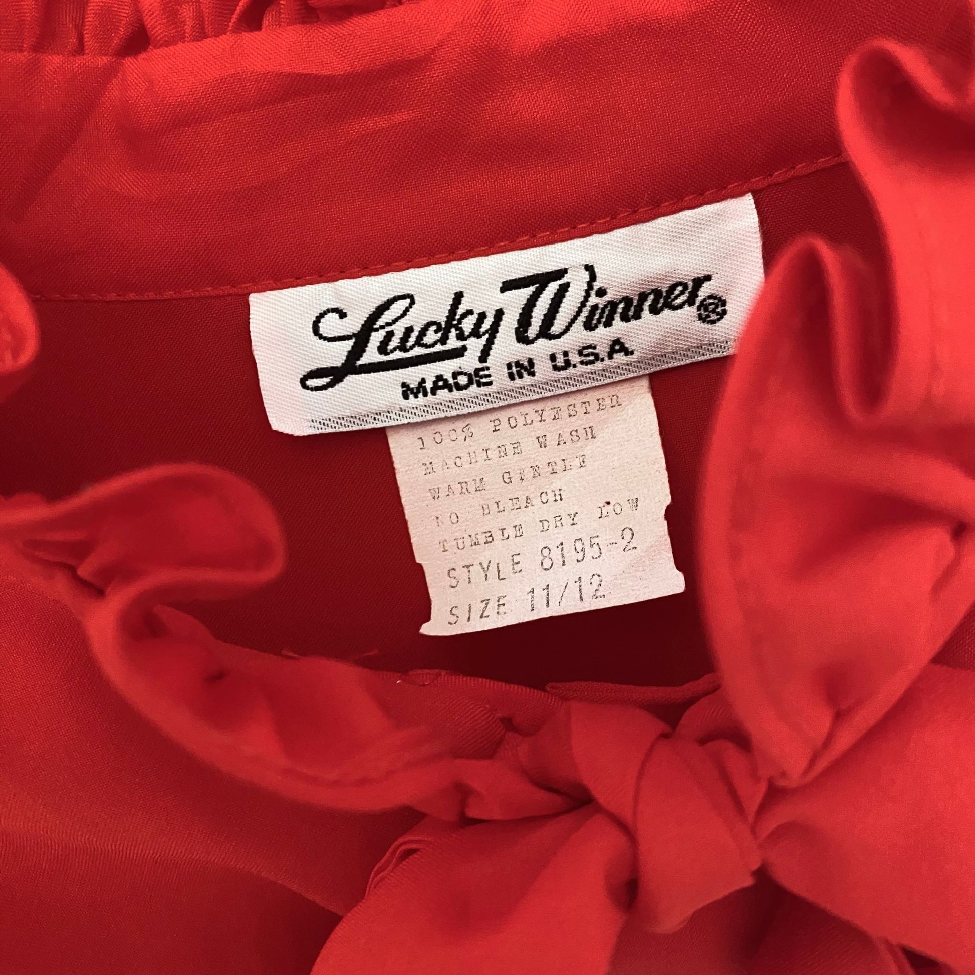 Red 80s secretary blouse with high frill collar and tie neck. Approx UK size 10-12