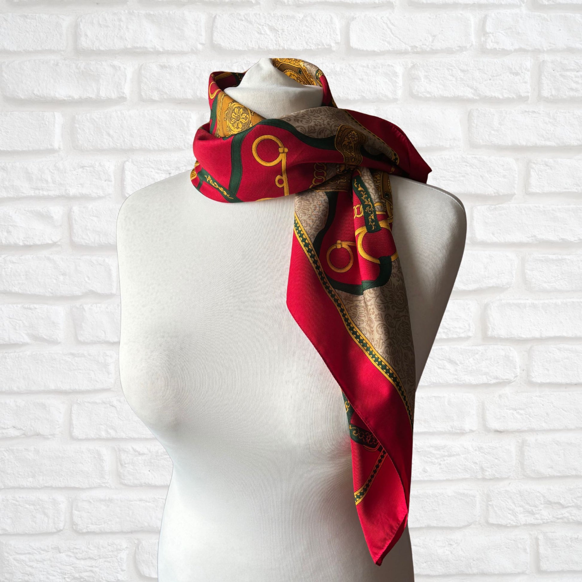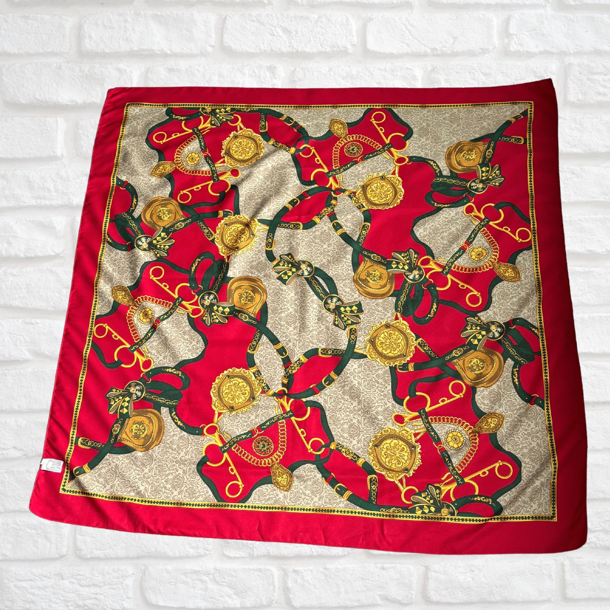 Red, Green and Gold Equestrian Style Large Square Vintage Scarf. Great Gift idea