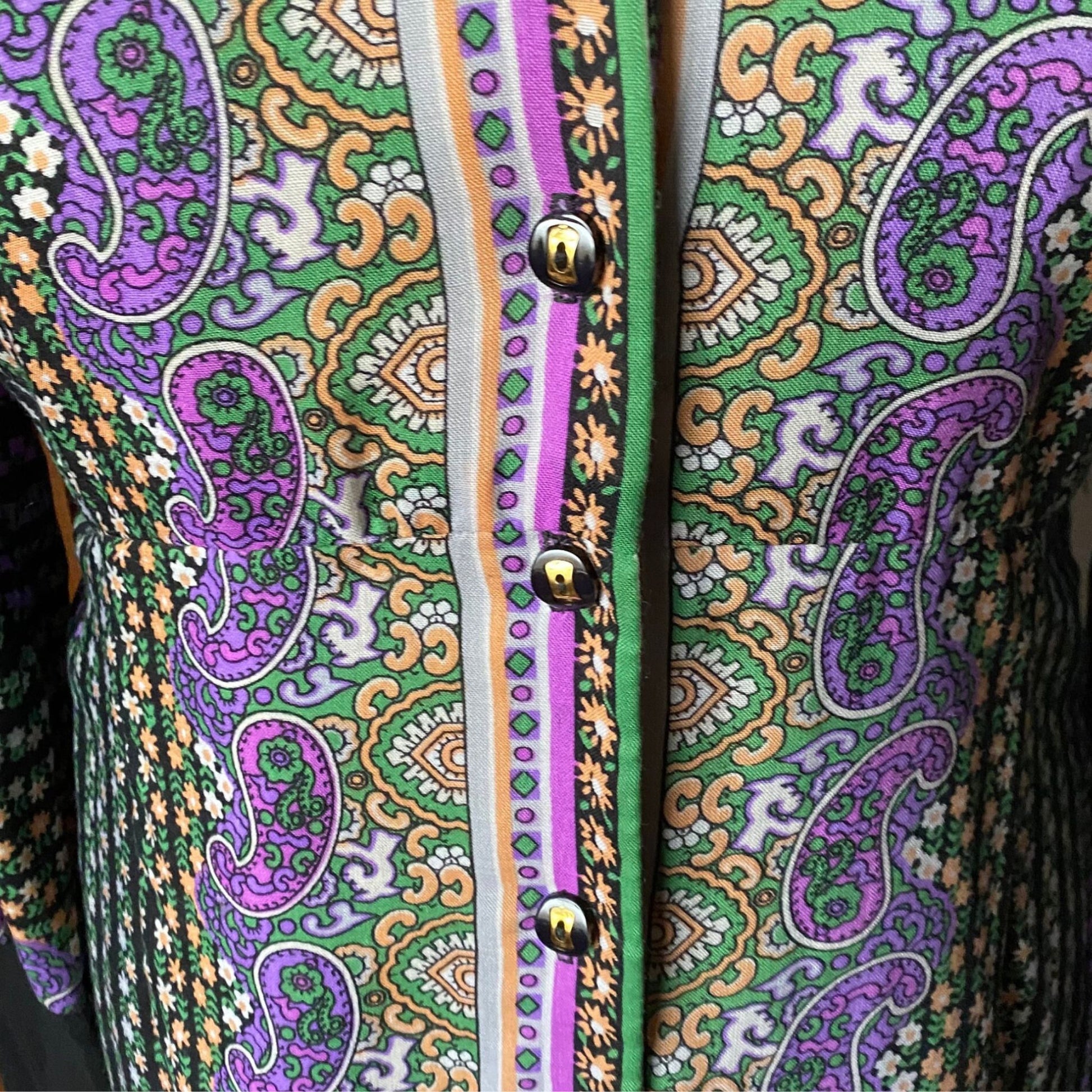 This long sleeved gorgeous green, purple, orange and white psychedelic vintage midi dress will look fabulous paired with boots. A great look for cooler days.