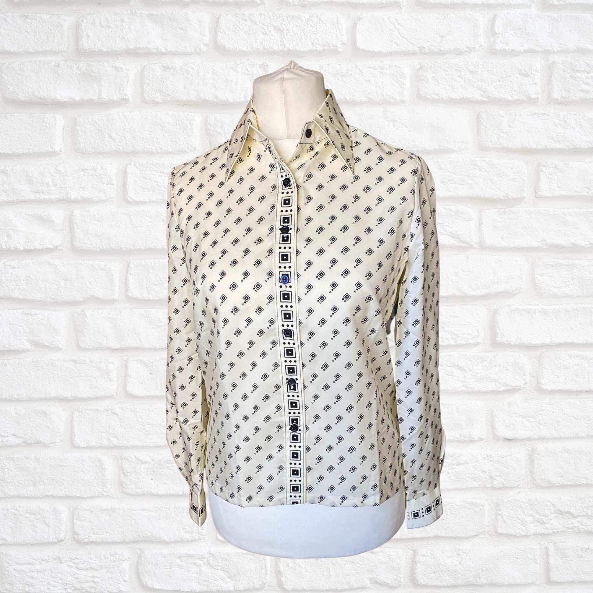Stylish 70s Cream and Black Geometric Print Dagger Collar Blouse. Approx UK size 10-14