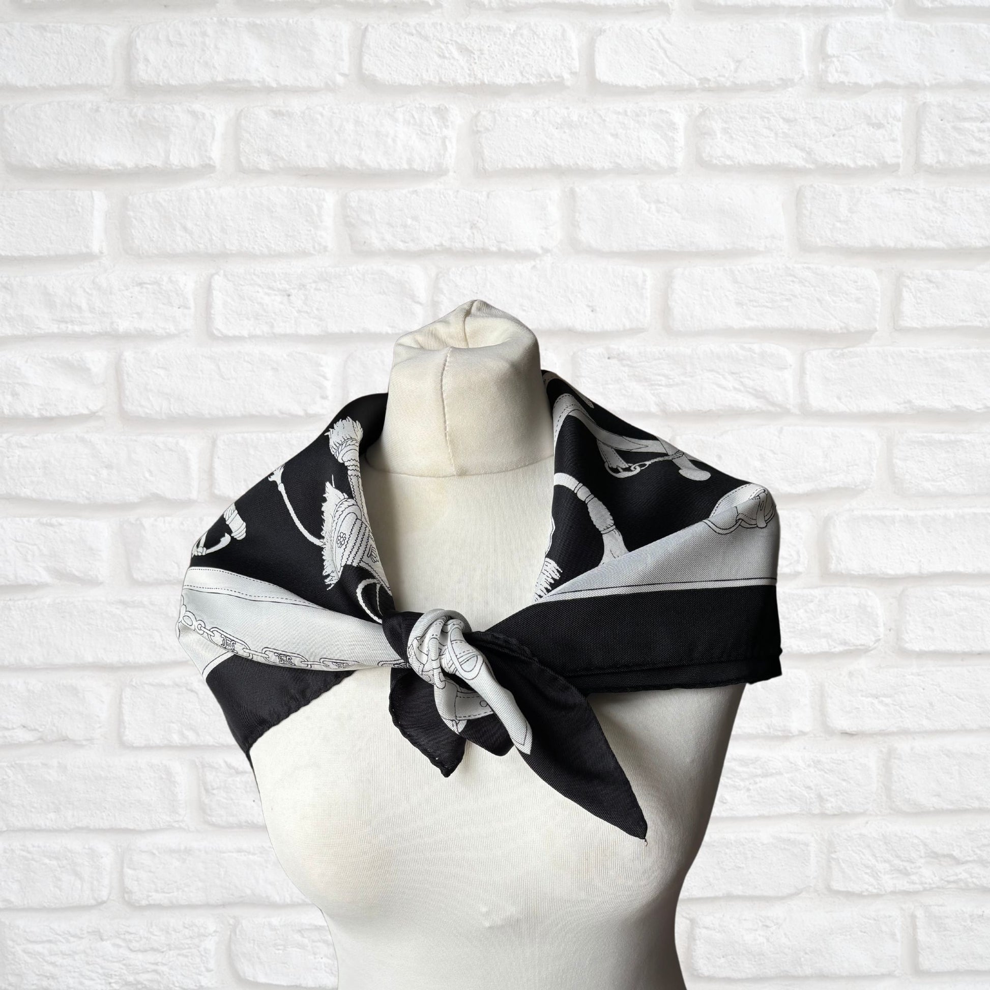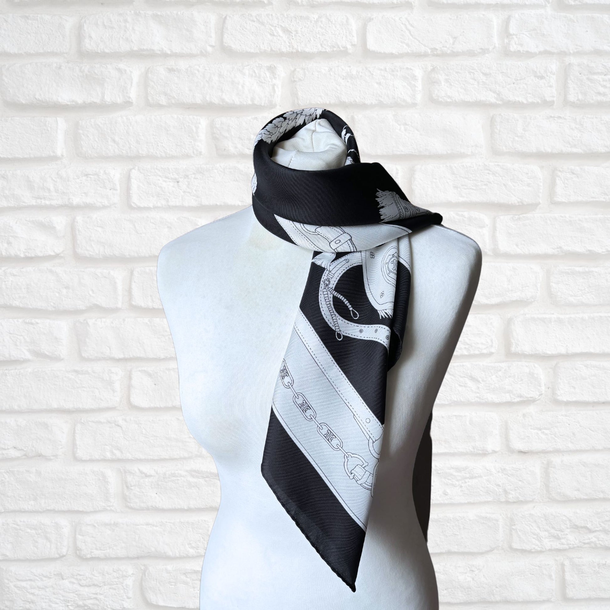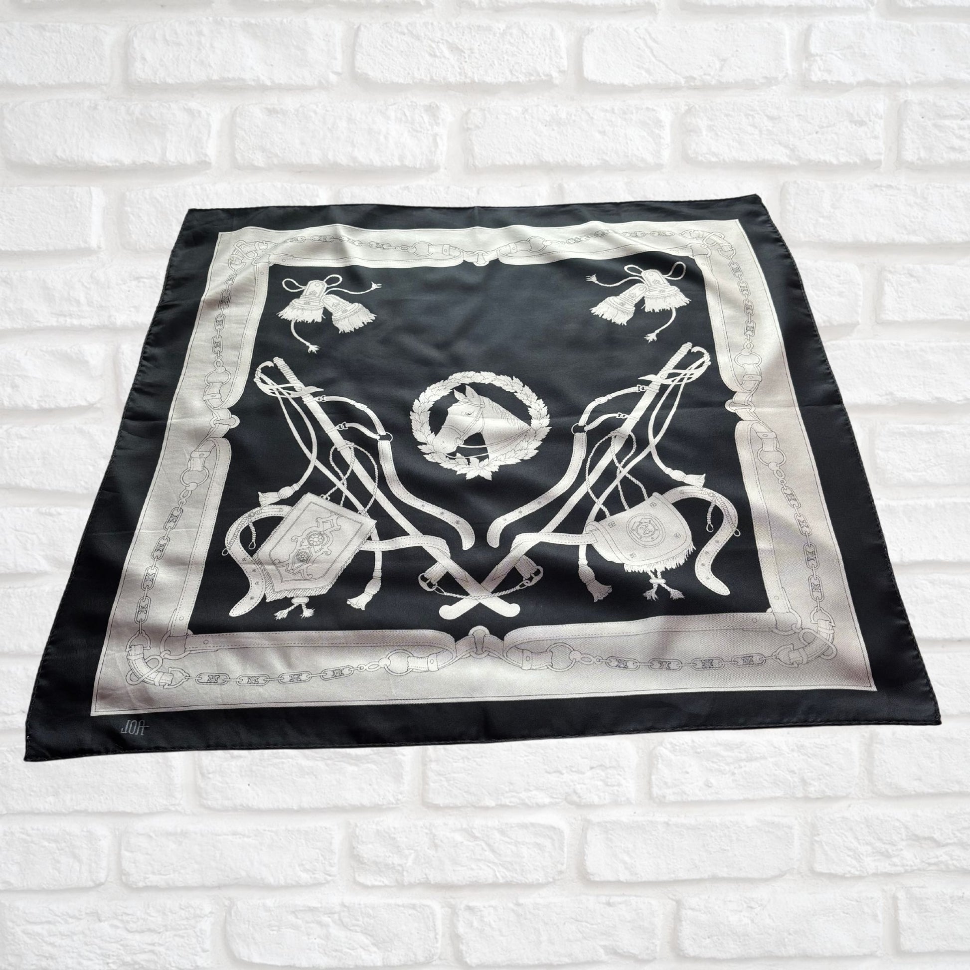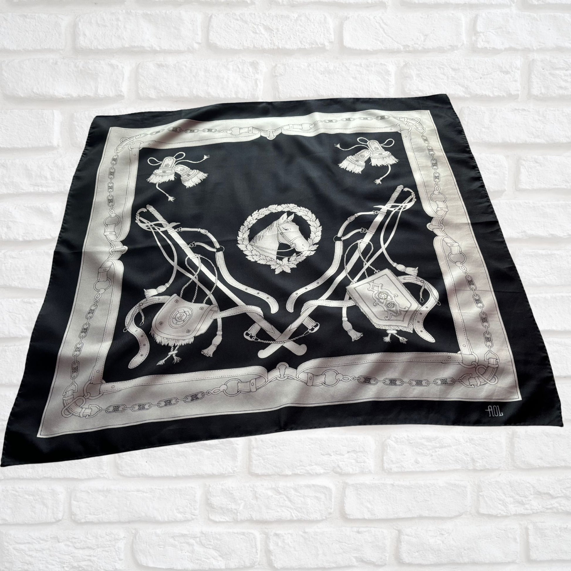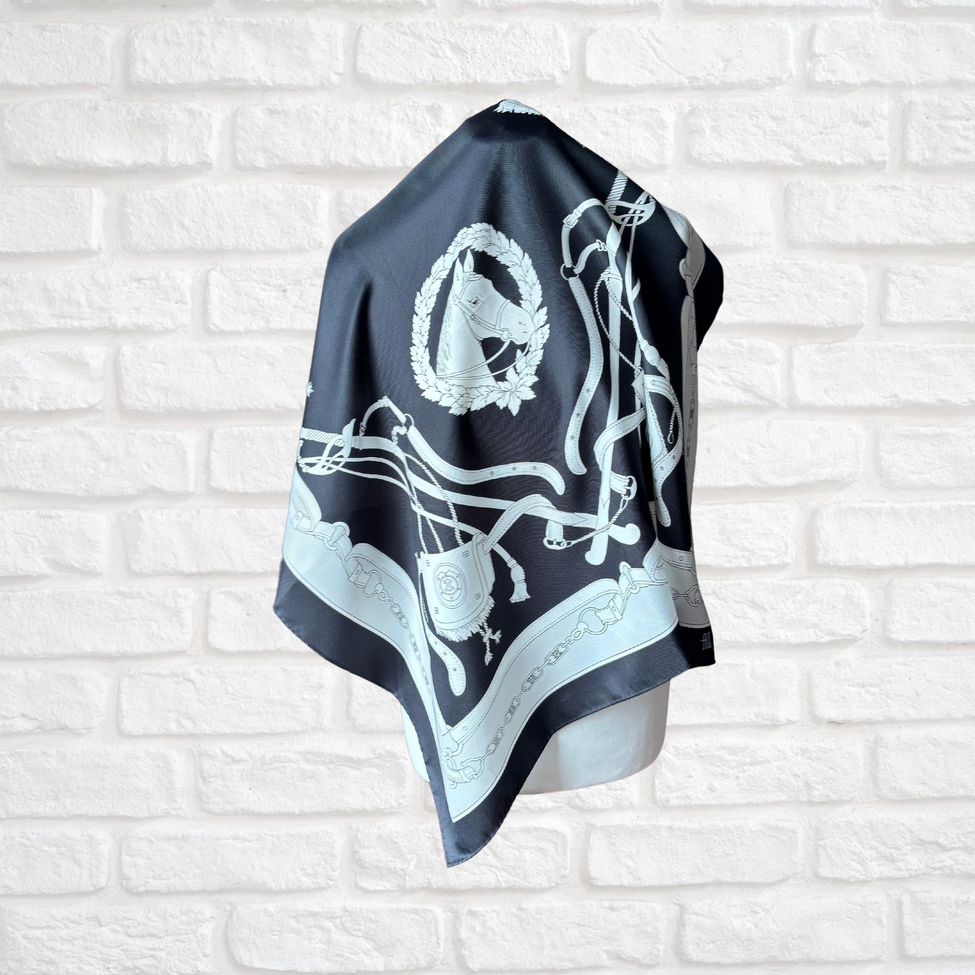 This elegant square vintage scarf features a classic chain, rope , buckle and shield design with a central horses head in a palette of white and soft grey on a black background. Versatile and chic, and perfect for gifting, this scarf can be worn in countless ways to elevate your style. Perhaps in your hair, or around your neck and tied to the side or front, the possibilities are endless.