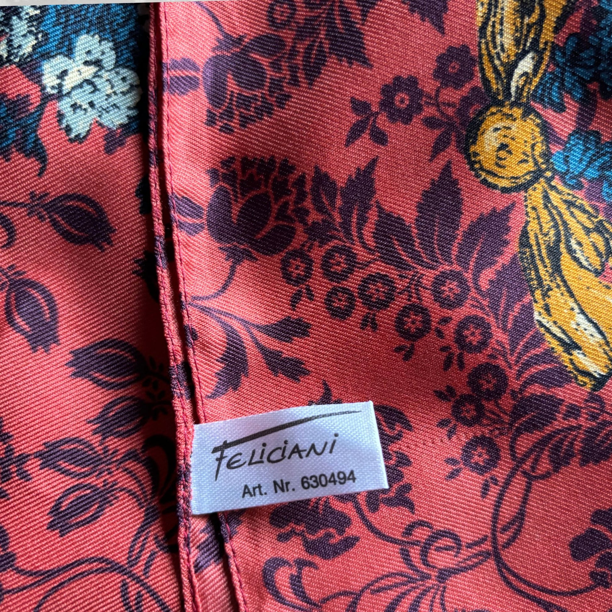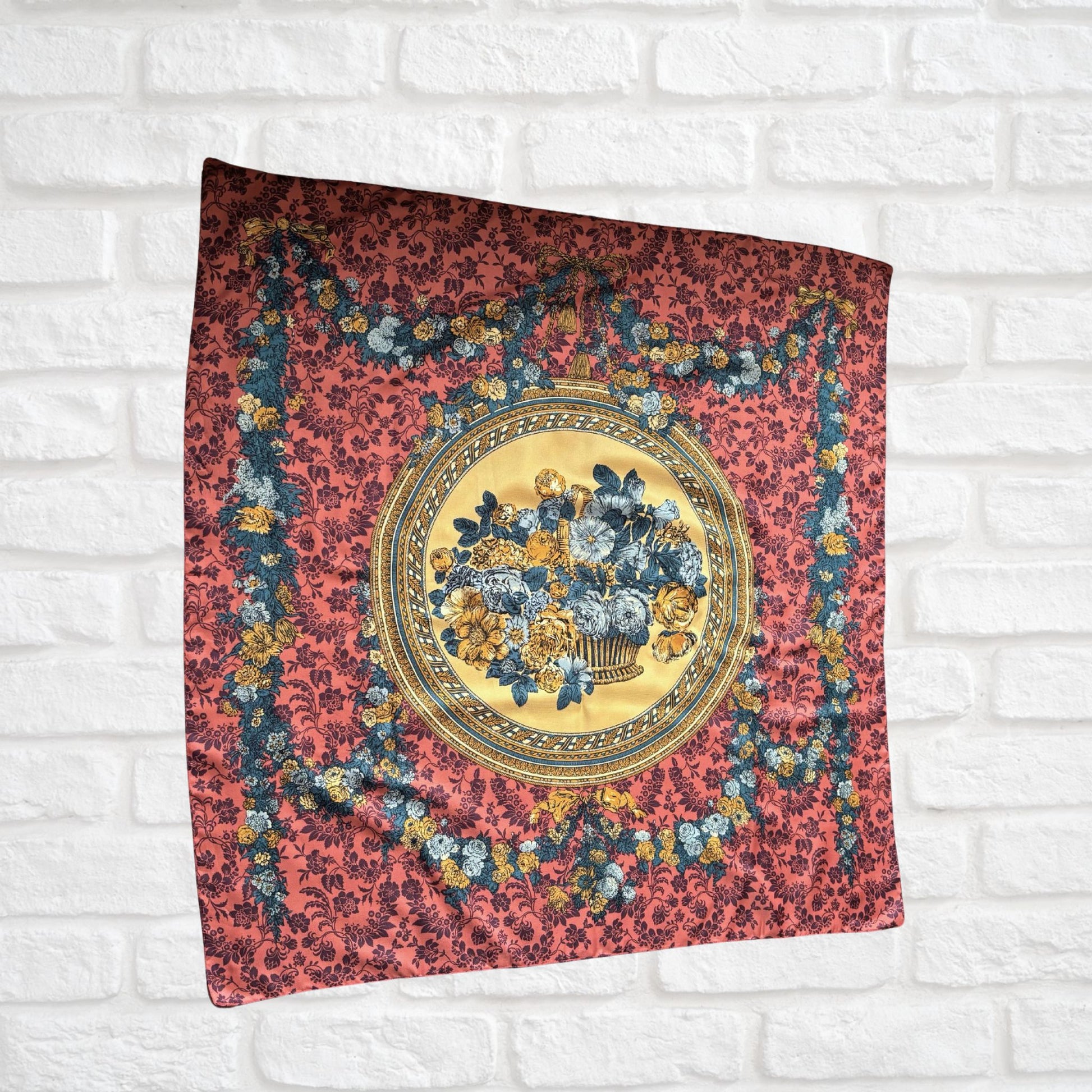 This elegant large square vintage scarf features a sumptuous gold and blue circular framed floral design on a ruby red and purple botanical pattern, finished with more gold and blue flowers. Versatile and chic, and perfect for gifting, this scarf can be worn in countless ways to elevate your style. Perhaps in your hair, or around your neck and tied to the side or front, the possibilities are endless.