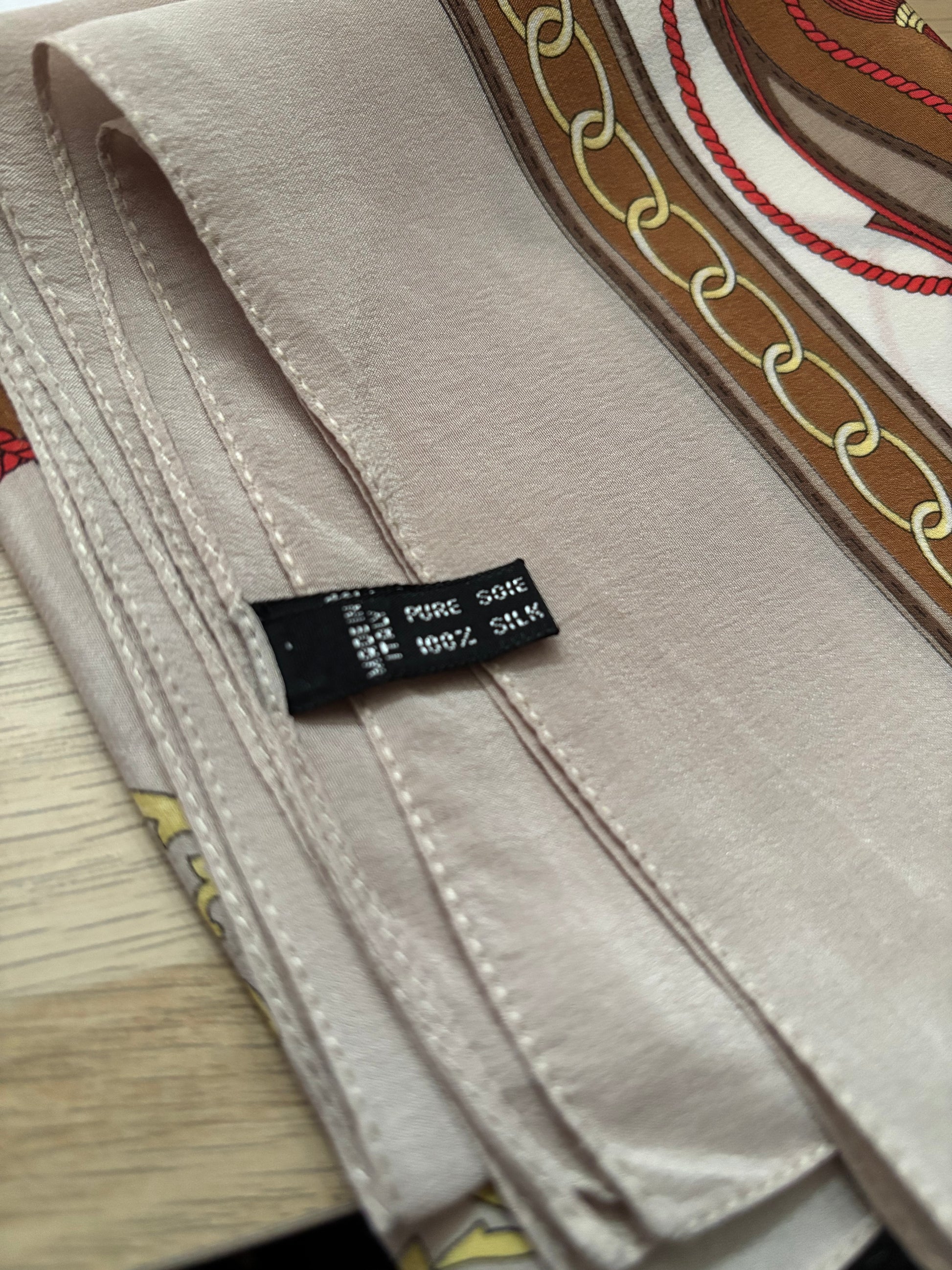 This elegant beige, brown, pale gold and red baroque style scarf features chains, stirrups and ropes