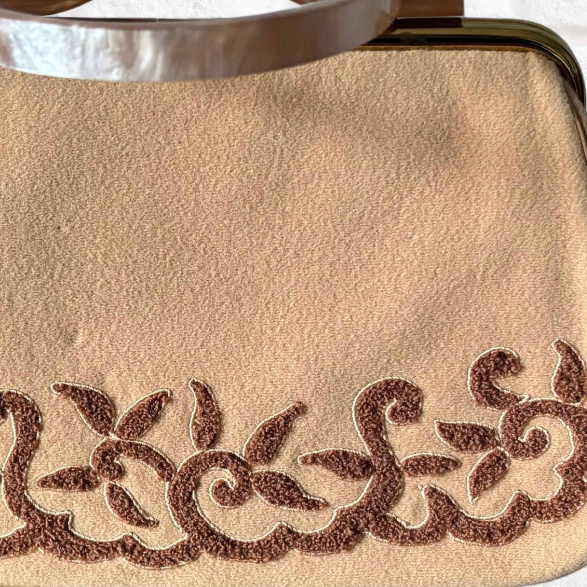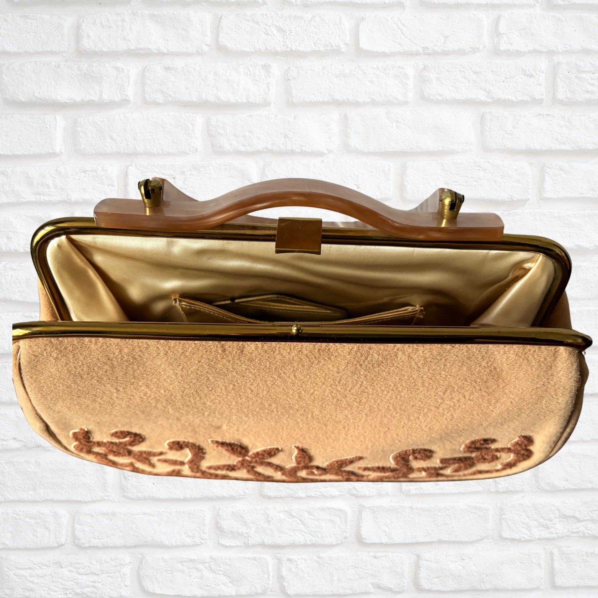 This stunning 1950s vintage camel coloured handbag features a dark brown botanical boucle embellishment, a pale brown lucite handle and a gold clip lock frame. Inside, you'll find a gold satin lining covered in a clear plastic, along with two main pockets - a spacious one and a smaller one with a gold trim. The smaller pocket even houses a unique pentagonal-shaped makeup mirror. Crafted by Florida’s own Charles S Kahn, this top handle bag is a must-have for collectors, lovers of 50s fashion, or anyone seeking a fabulous gift.