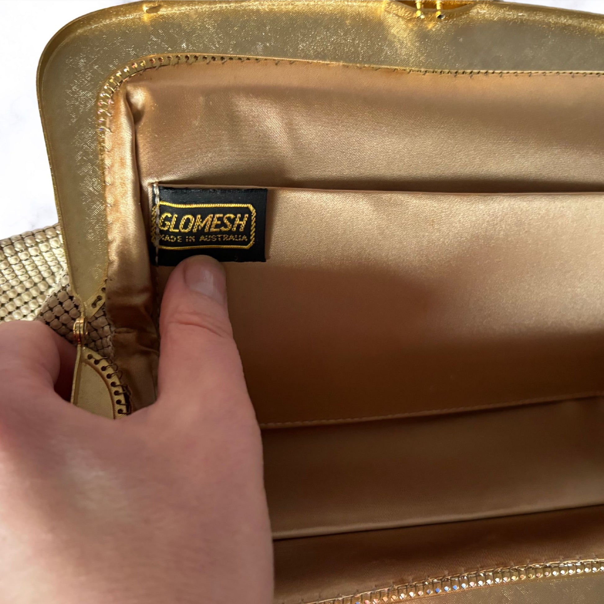 Crafted in Australia, this stunning 1960s cream metal mesh evening bag is the perfect elegant accessory for a special night out . The dark cream and gold metal frame, complete with a secure top clasp, showcases the attention to detail that Glomesh is renowned for. Inside, the gold satin lining adds a luxurious touch, while the Glomesh label indicates its authenticity and heritage.
