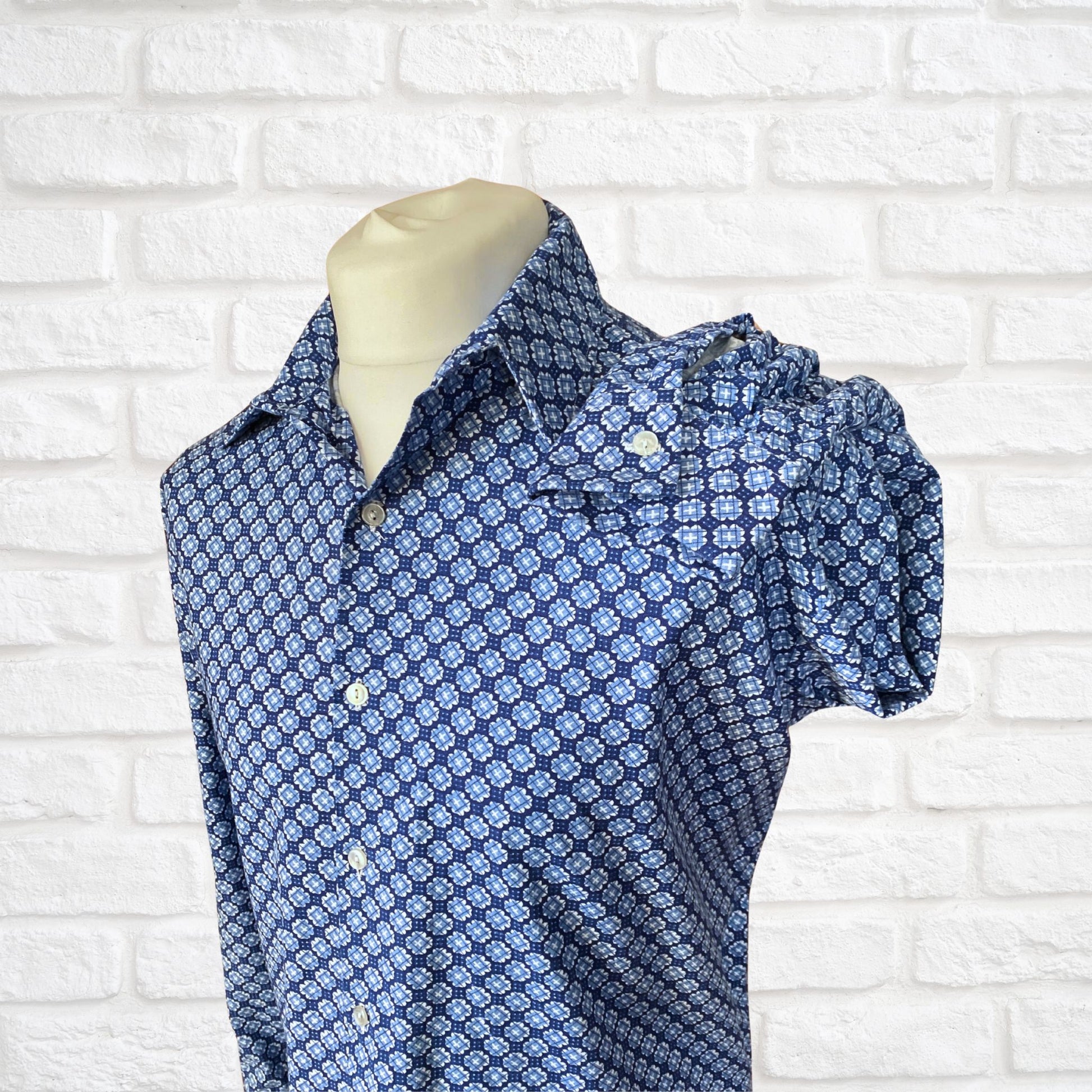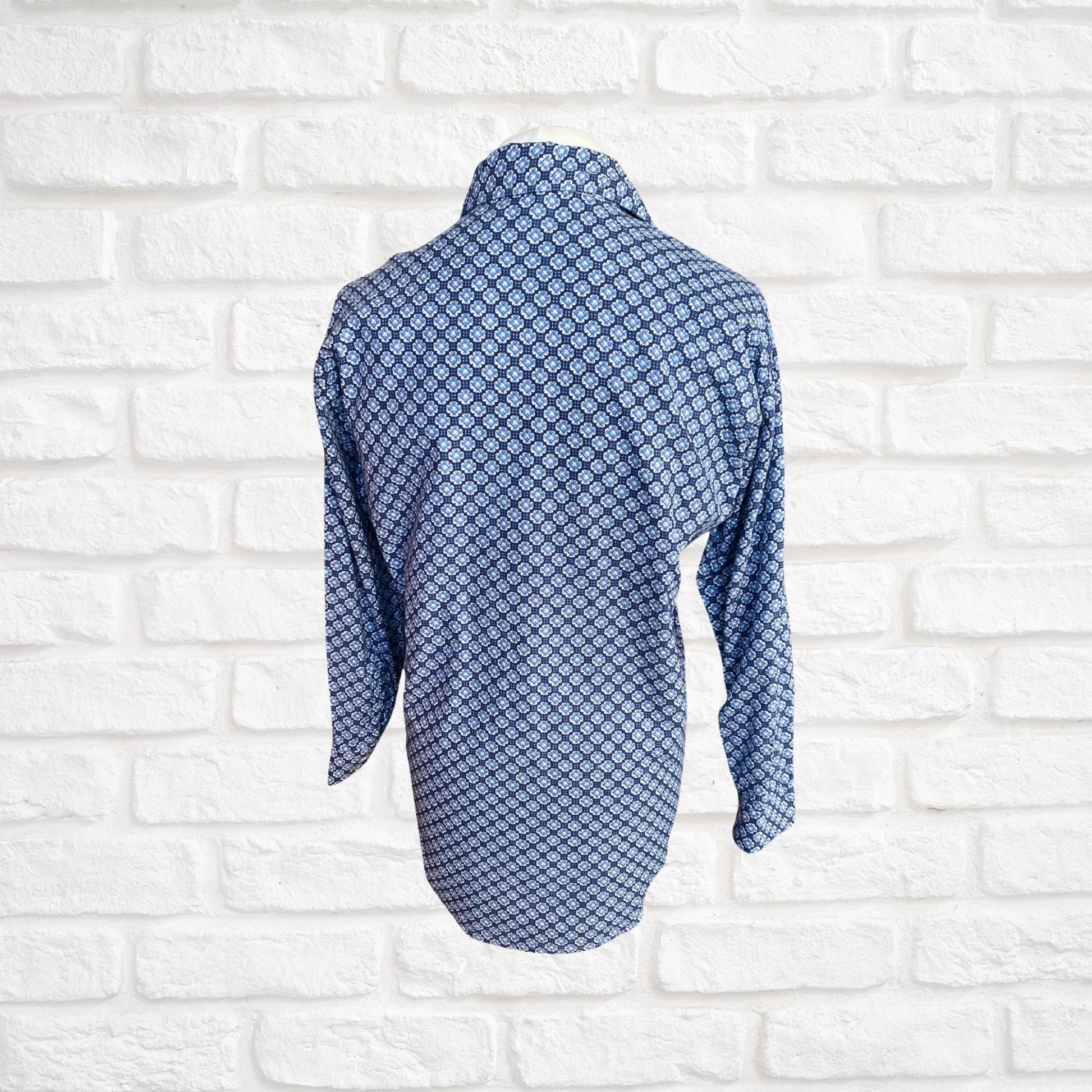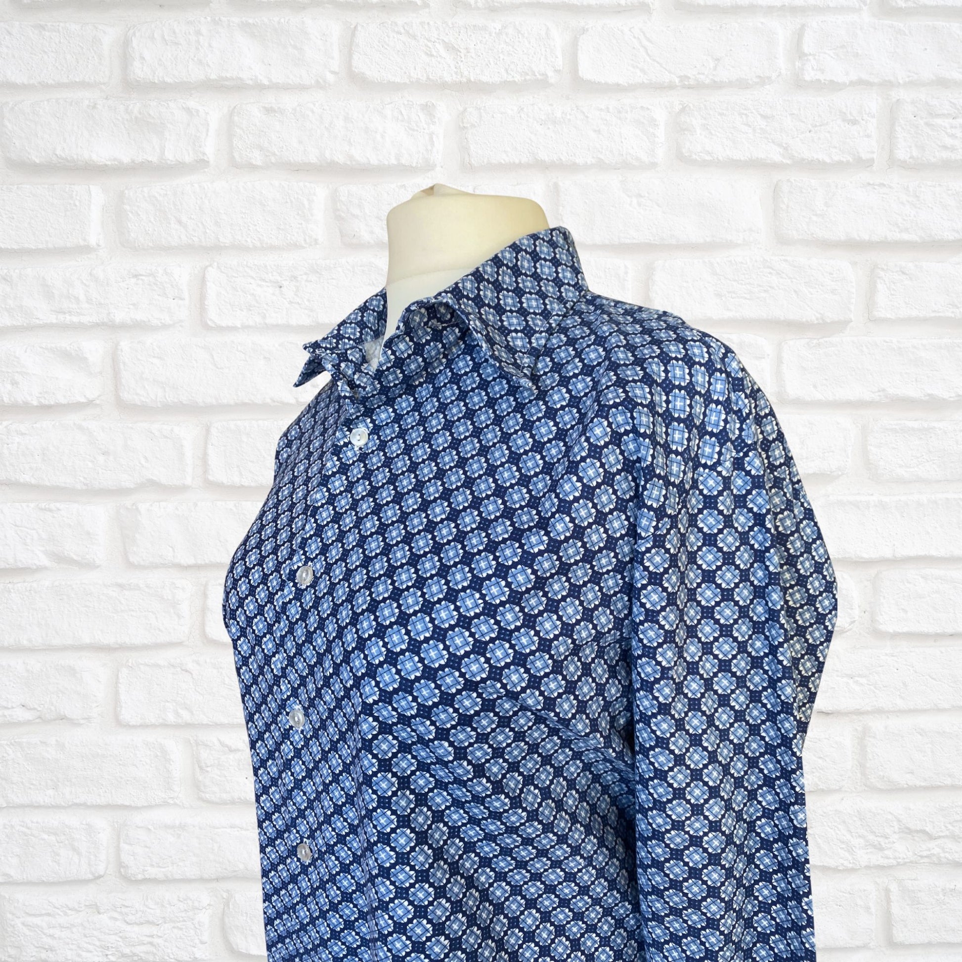 Vintage 1970s Blue Cotton Geometric Print Dagger Collar Shirt - Smart and Casual Style . Approx UK size XL to XXL (men) 20-24 ( women)