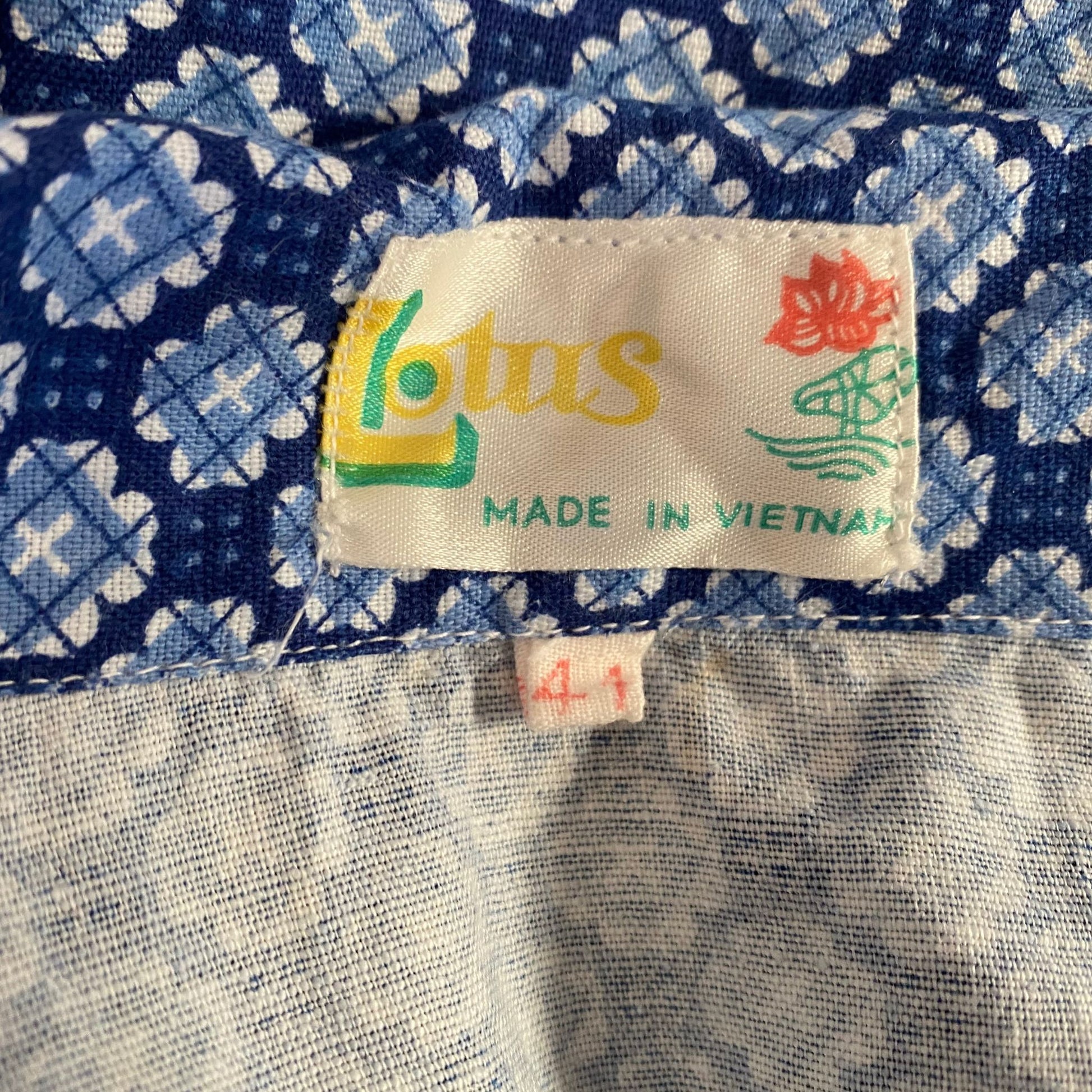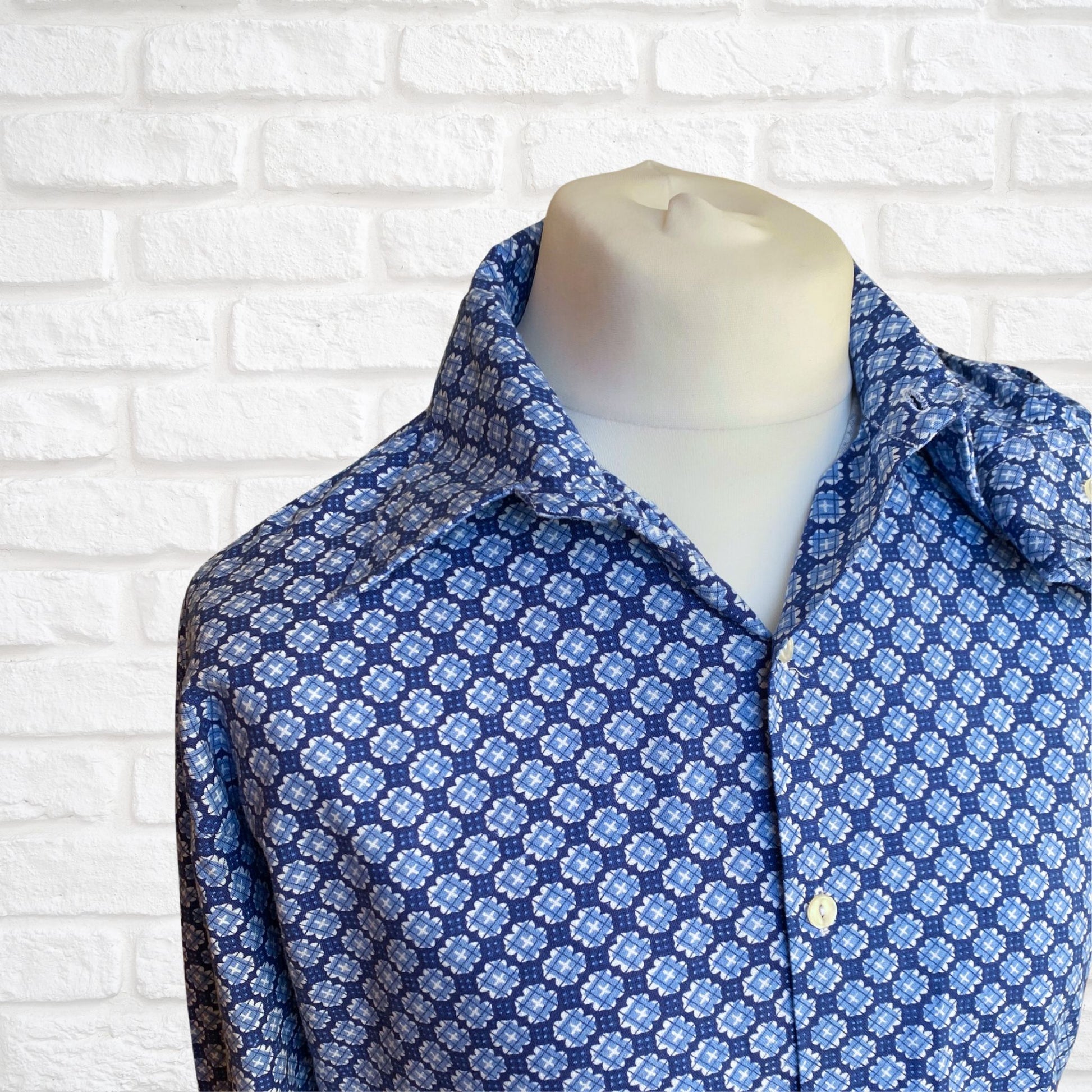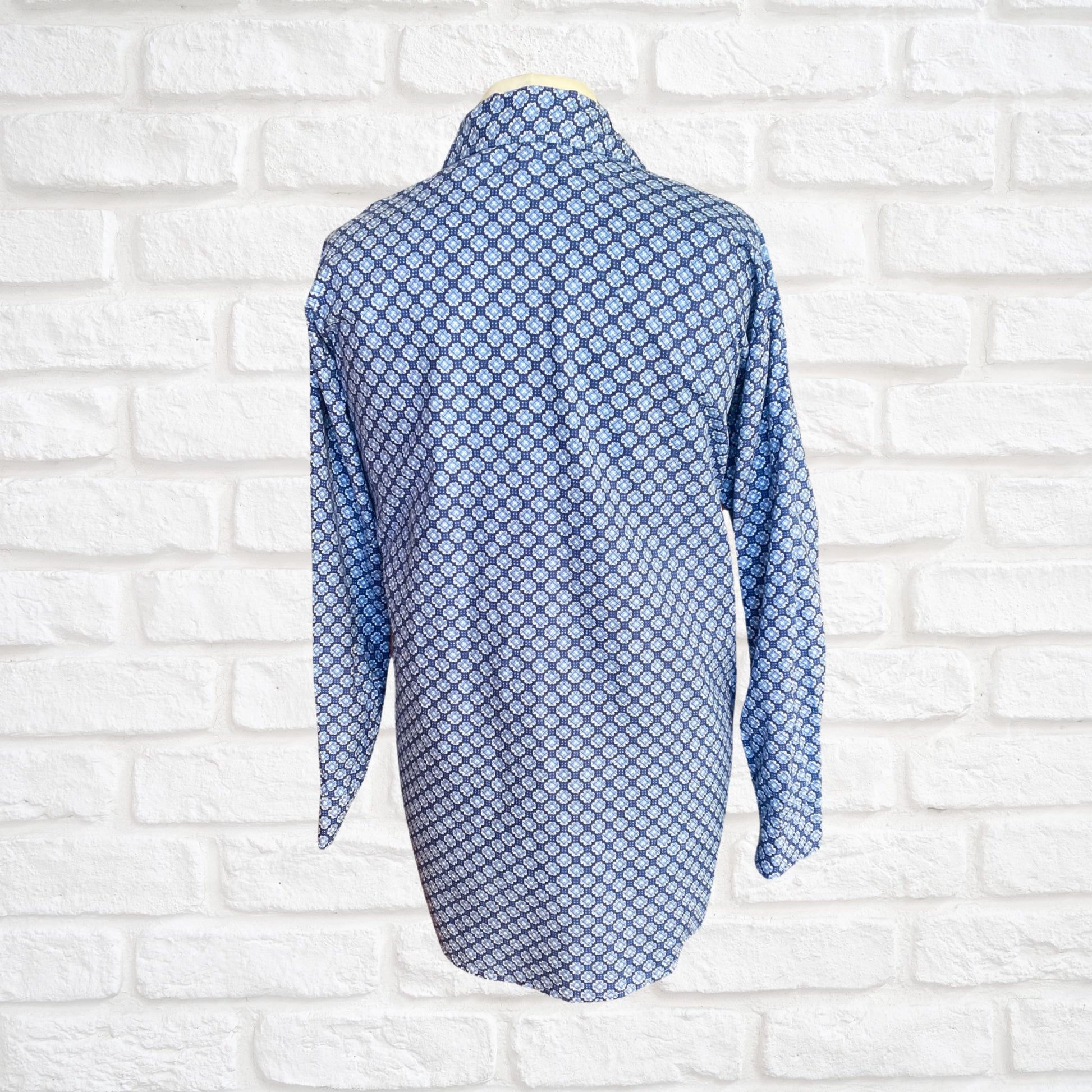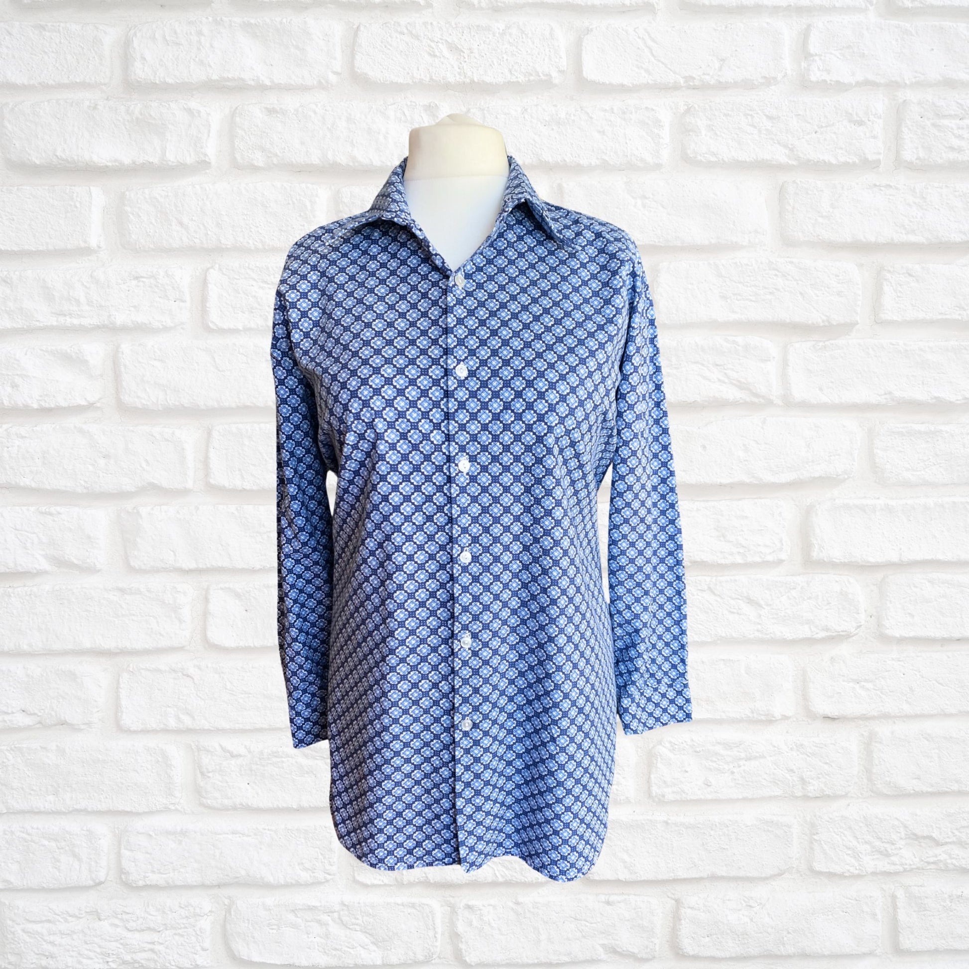 Vintage 1970s Blue Cotton Geometric Print Dagger Collar Shirt - Smart and Casual Style . Approx UK size XL to XXL (men) 20-24 ( women)