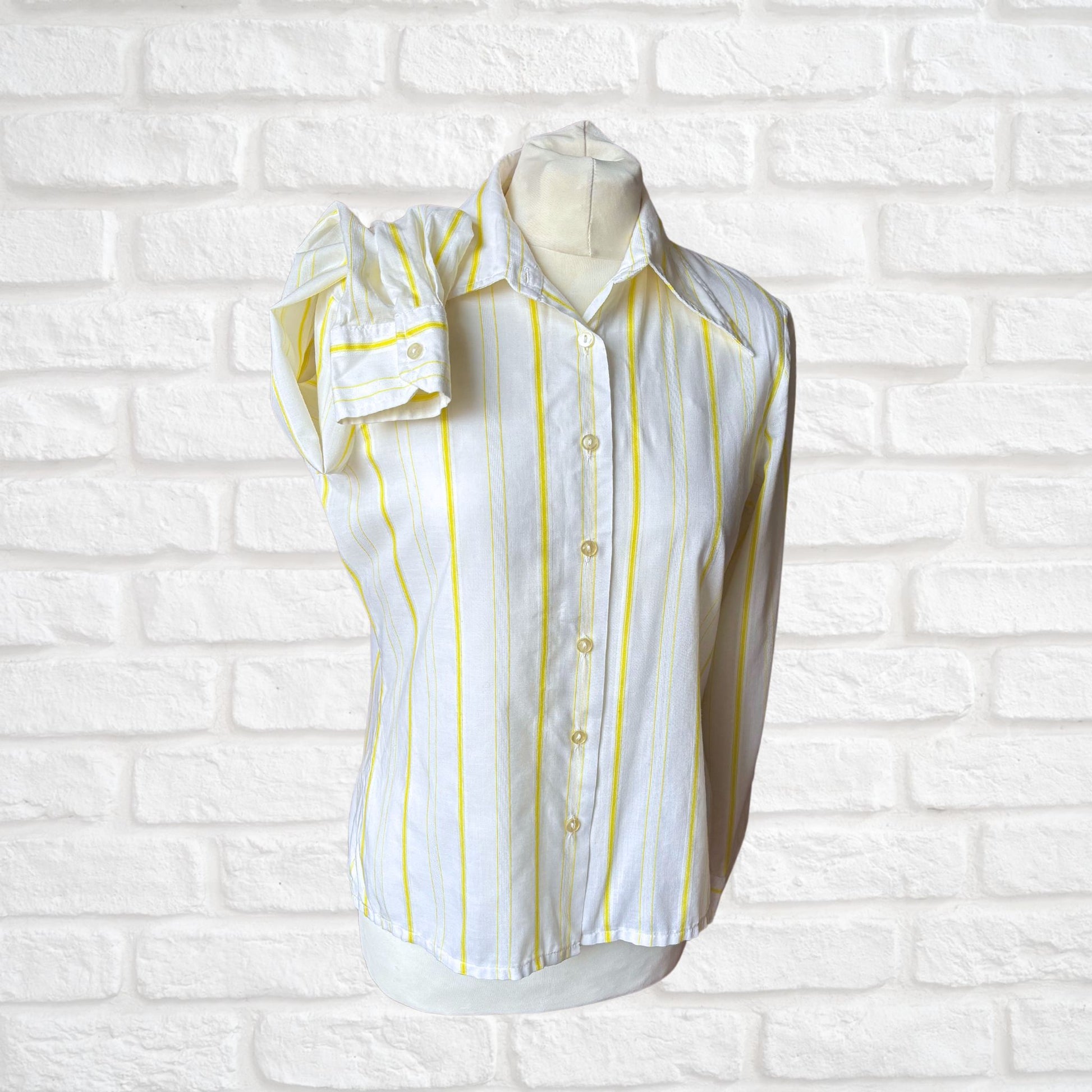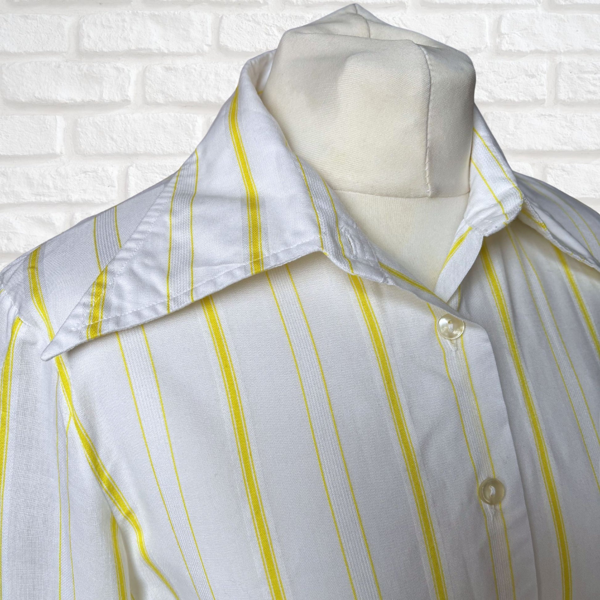 This eye-catching 1970s striped shirt in creamy white and zingy lemon yellow is a vintage classic. Its dagger collar adds a touch of seventies cool, while the long sleeves with button-up cuffs and button-down front complete the smart yet casual look.