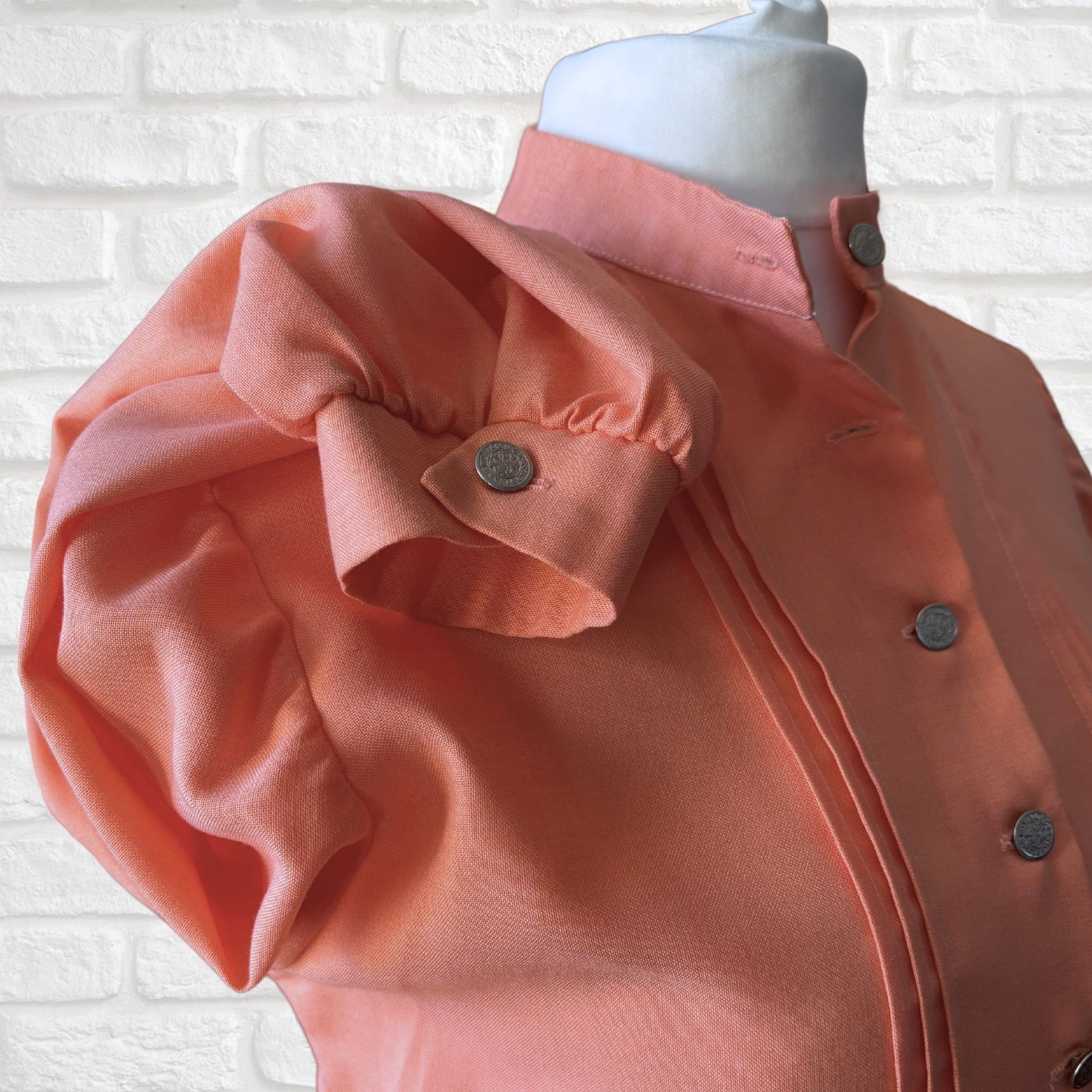 This gorgeous soft pastel peach vintage dress features a flattering fit and flare silhouette, highlighted by the intricate pintuck pleats on the bodice and the pretty silver embossed buttons.