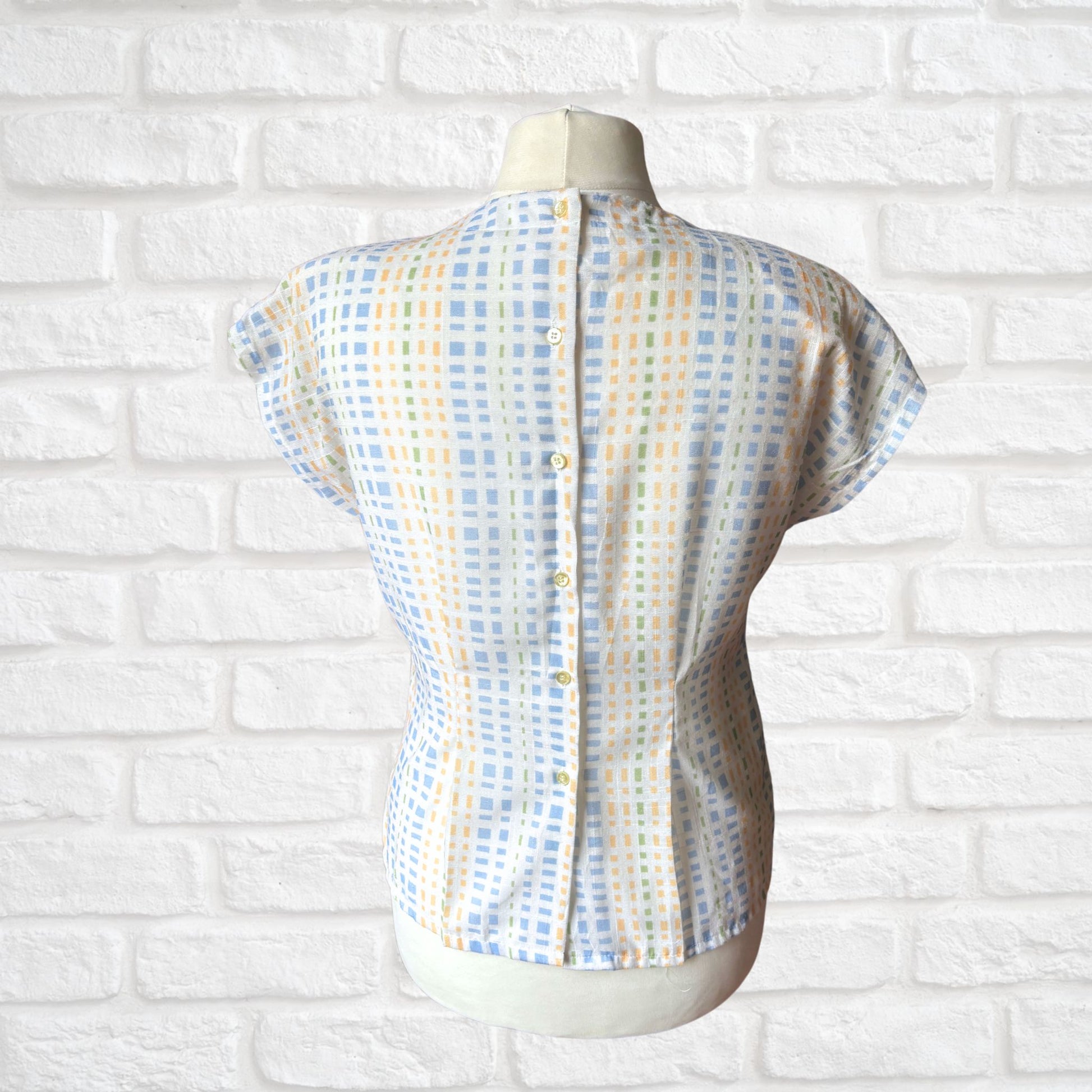 This cute 80s capped sleeved white, blue, yellow and green printed blouse has lovely 50s style detailing with its pretty tie detail at the front and sweet button up back. It’s lightweight and comfortable to wear so perfect for the warmer months.
