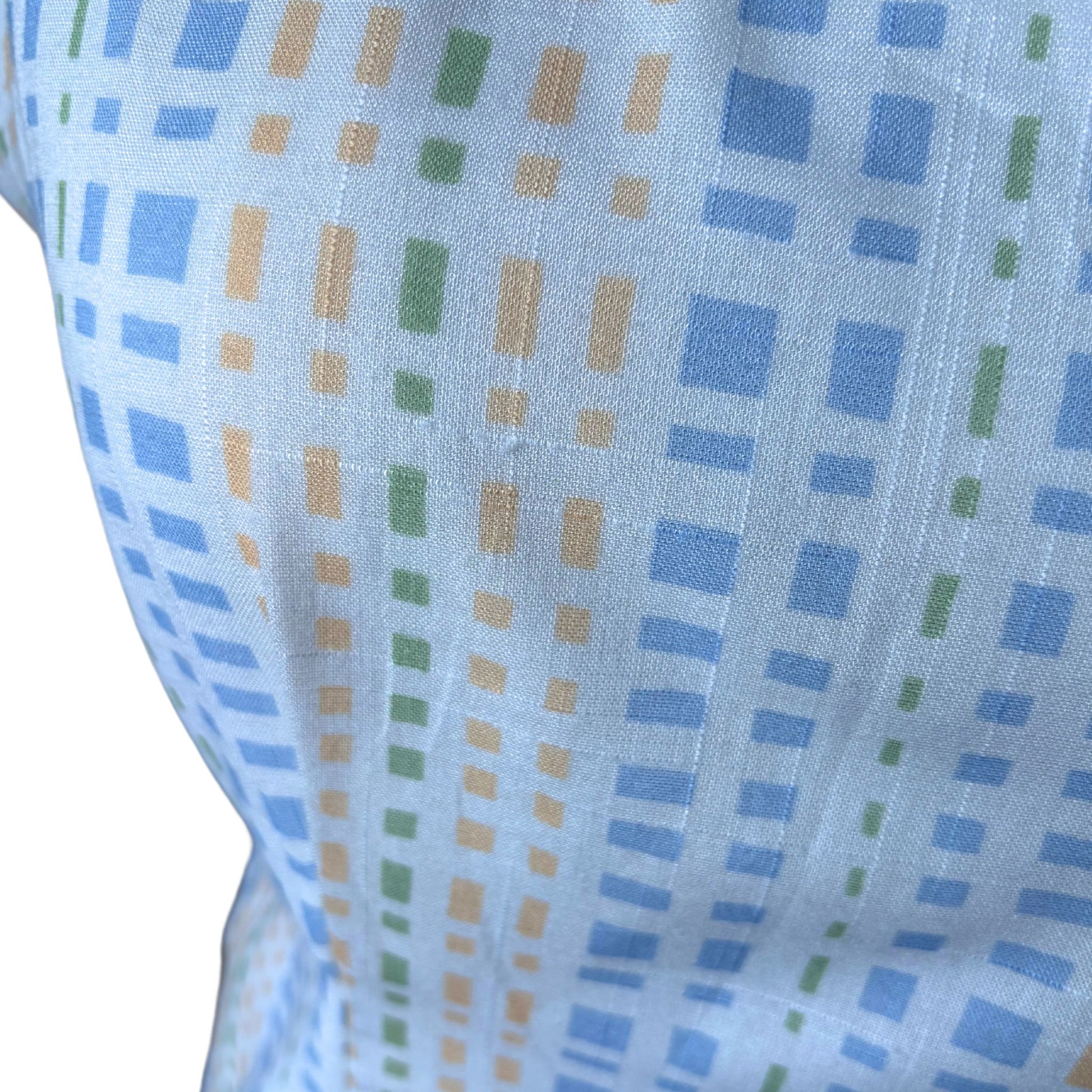 - White blouse with a geometric square and rectangle print in blue, yellow, and green