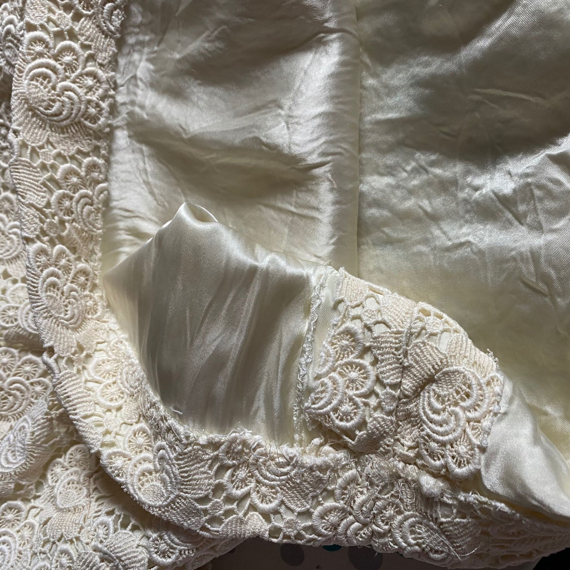 This 60s cream floral lace short-sleeved blouse is one of those timeless pieces that effortlessly captures the essence of vintage glamour. With its delicate cream lace and silky lining, this handmade waist-length top is a true work of art. The keyhole back fastens with a loop and one cream button, adding a charming touch to the overall design.