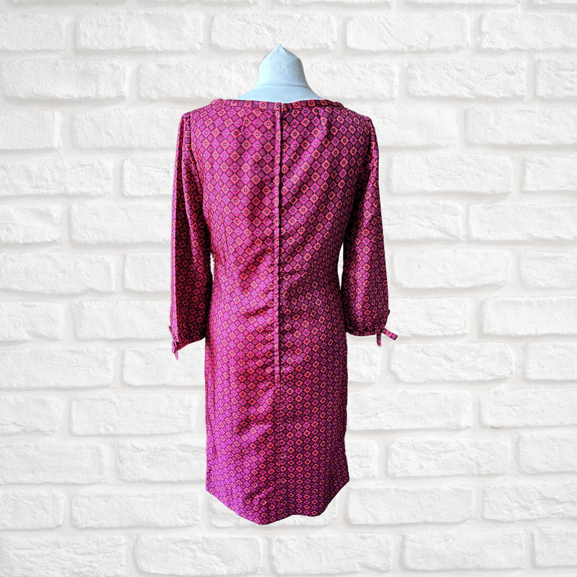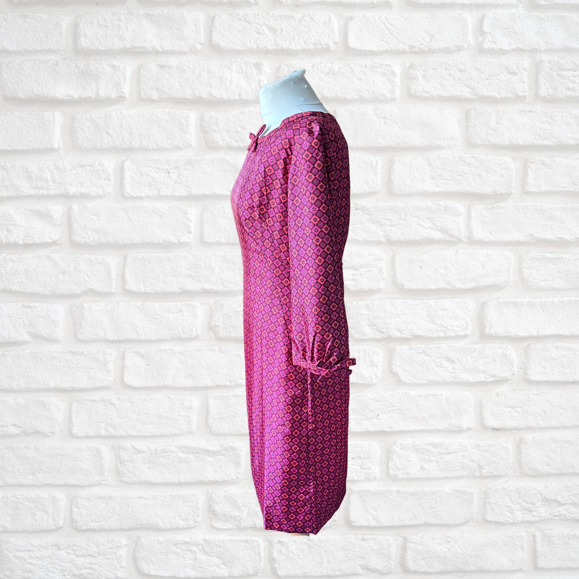 This stunning 60s shift dress with its striking tile print in a vibrant palette of pink, black, dark coral , burgundy, and yellow offers both simplicity and elegance. Wear it with boots and a classic trench coat for a look that is full of retro charm yet smart enough for work or dress up with heels for a special occasion or evening out.