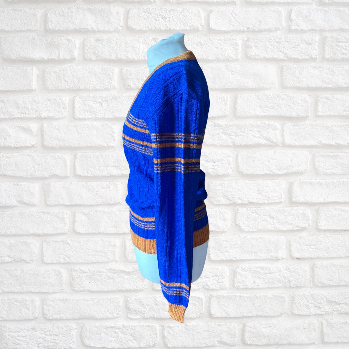 - Fitted look blue ribbed vintage sweater with dark orange/brown stripes